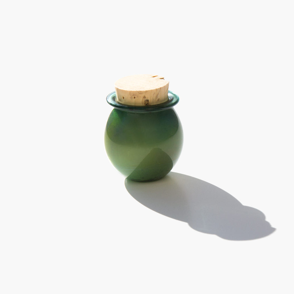 Approximately 1/2 oz, hand blown glass jar that is shipped cork sealed.