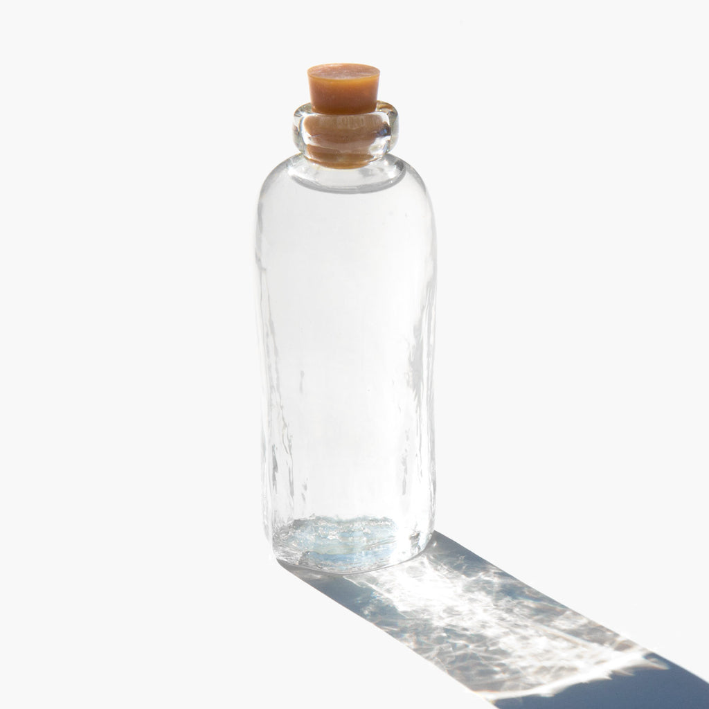 Approximately 4 oz handmade, recycled glass bottle that is shipped natural gum rubber and wax sealed.