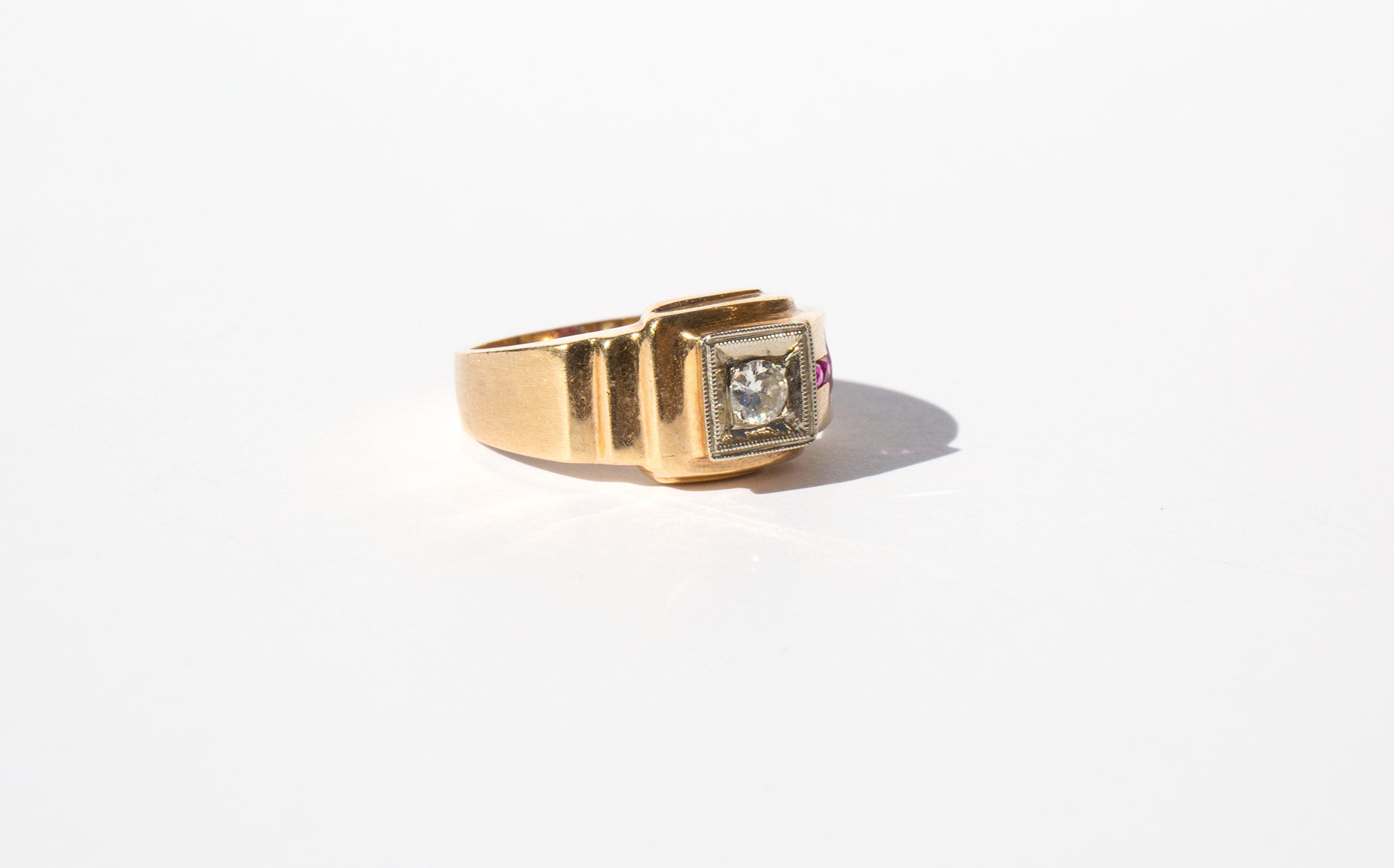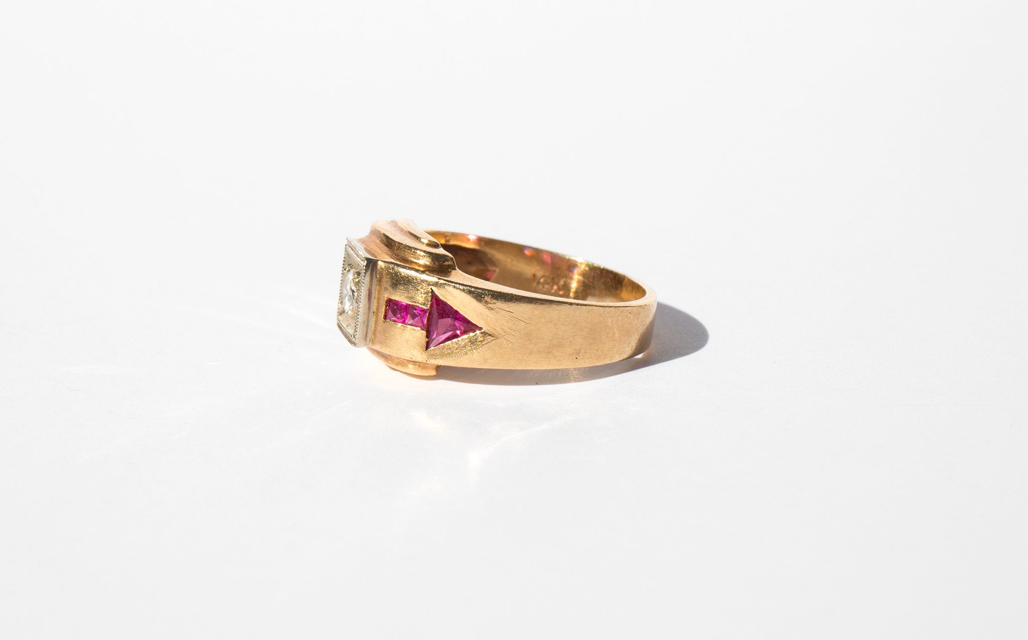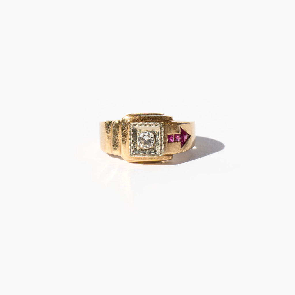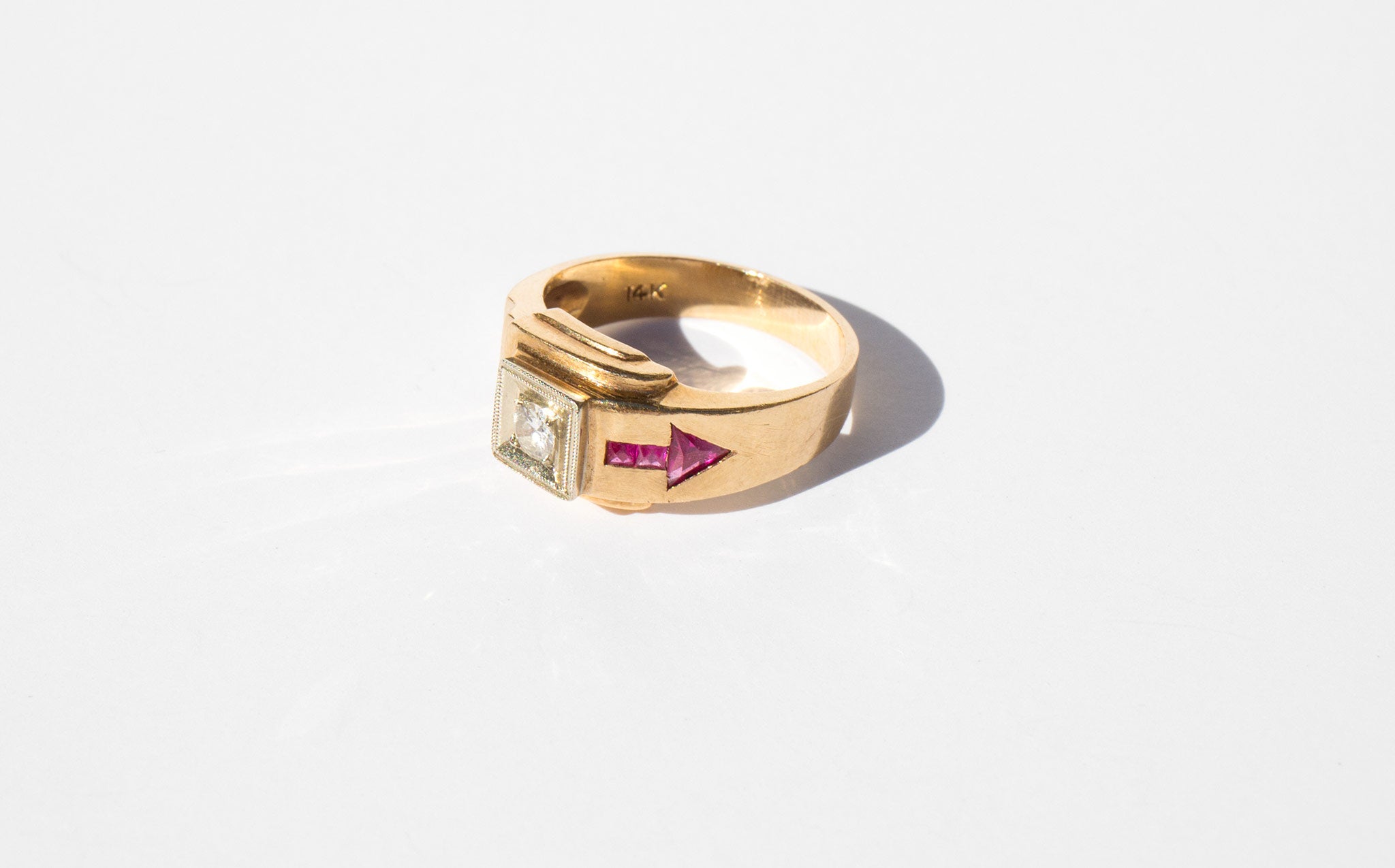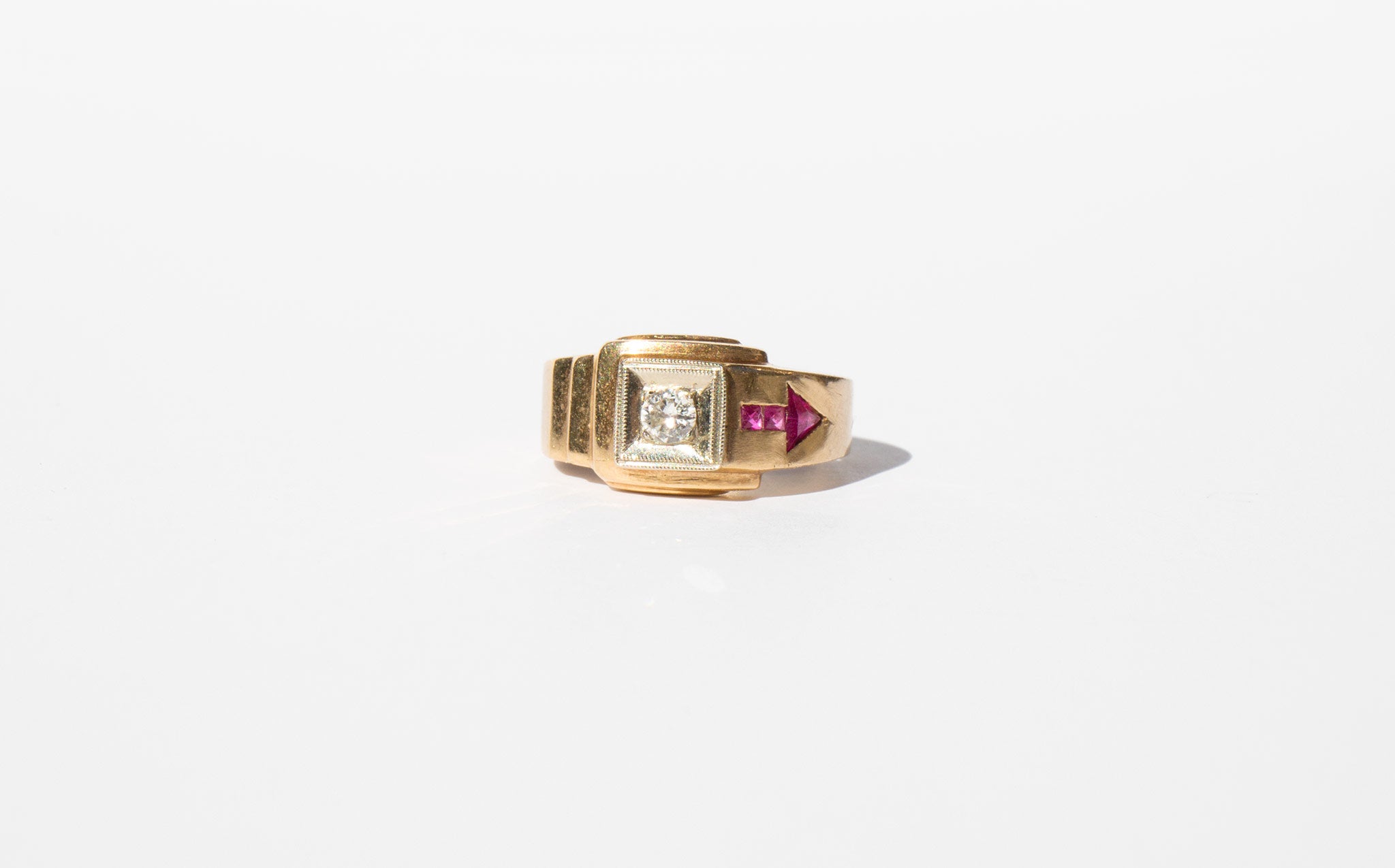 Exceptional 14k gold arrow ring with diamonds and synthetic rubies.