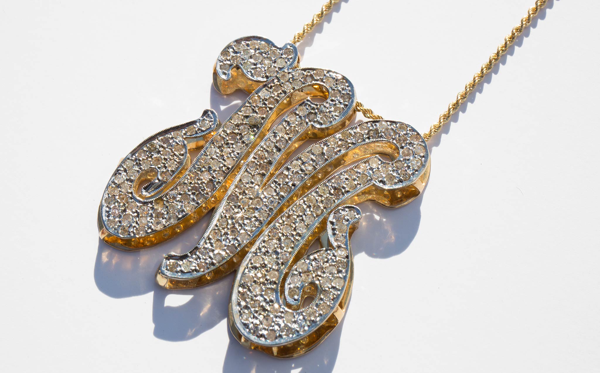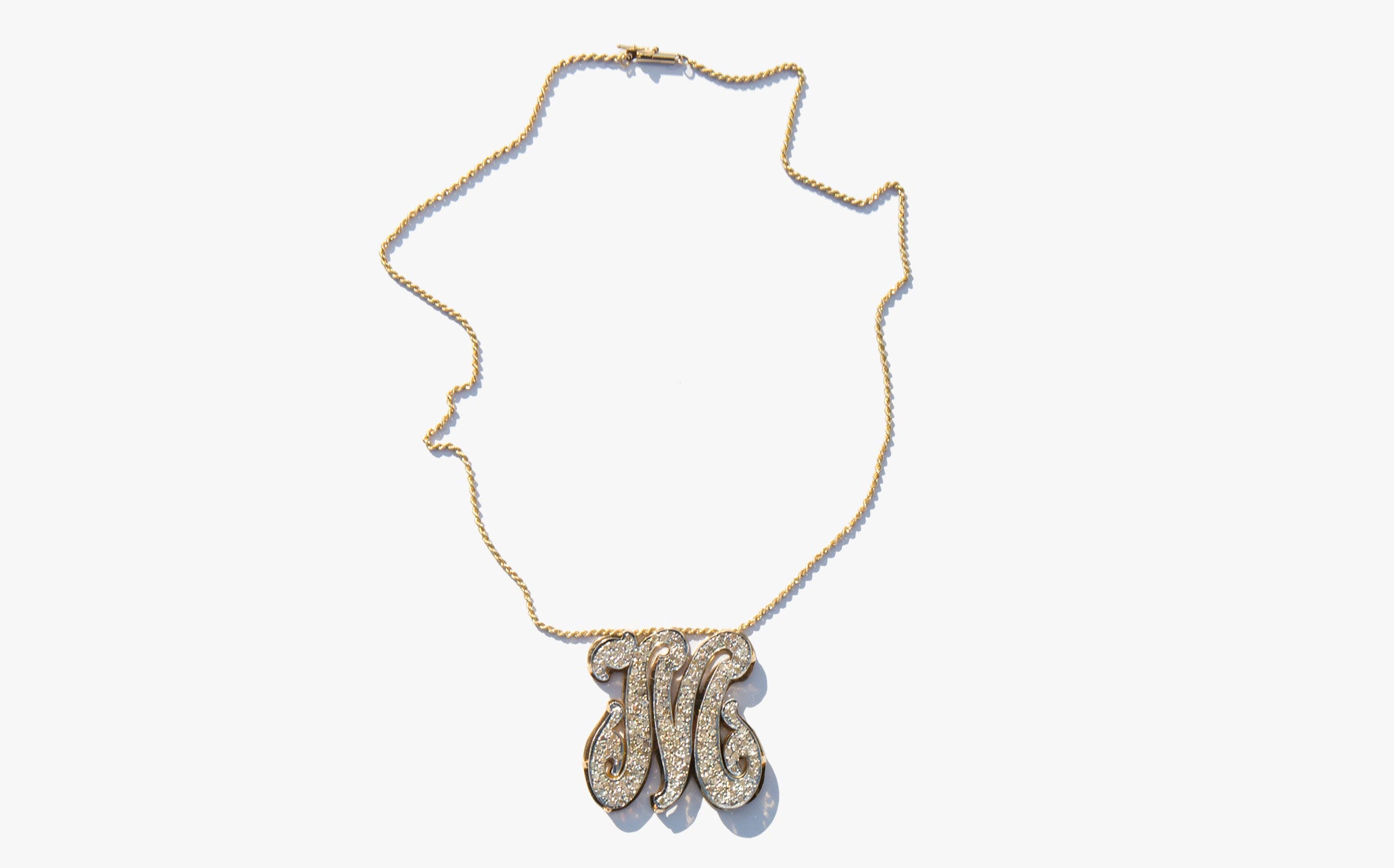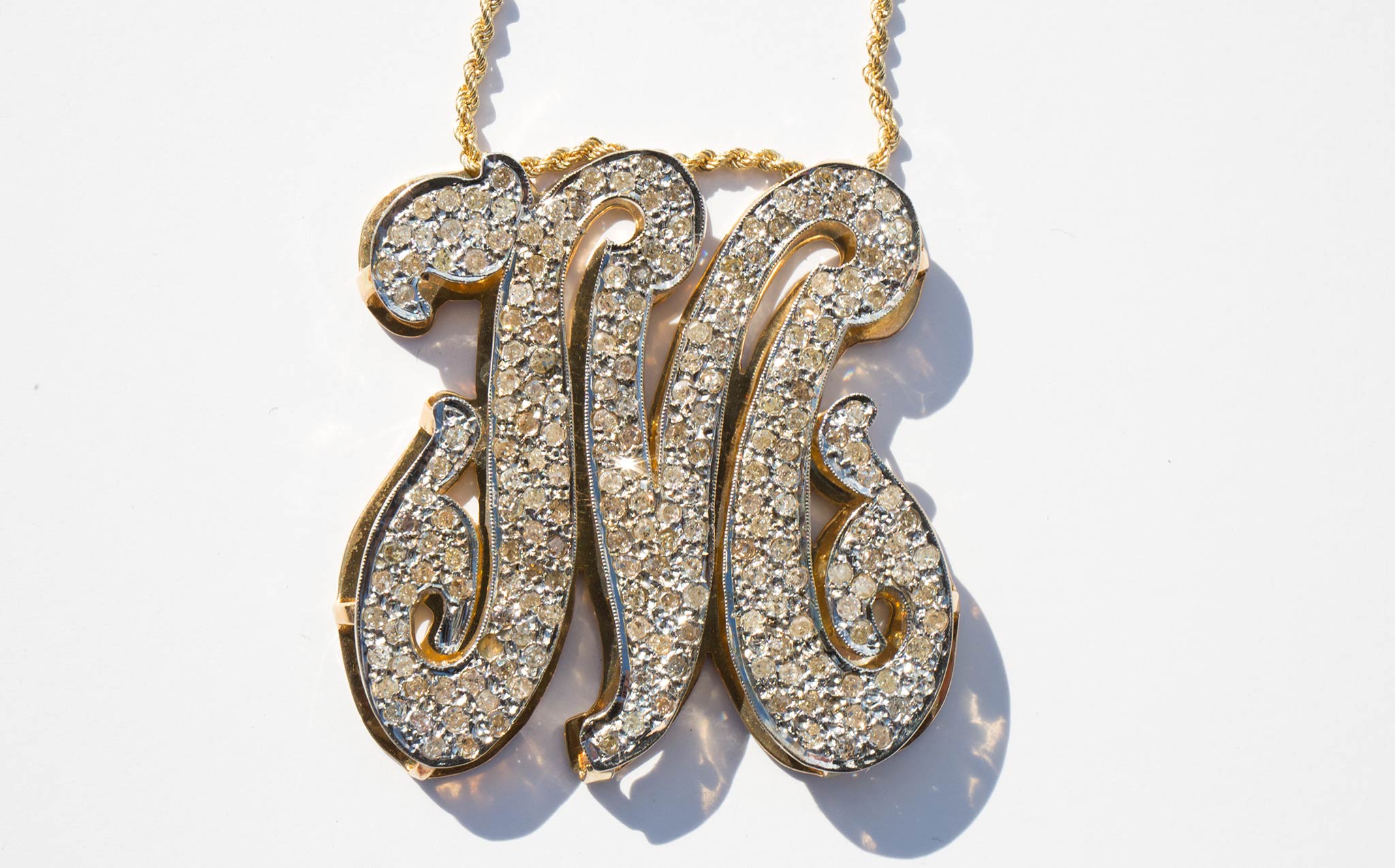 An incredible piece for just the right person (hint...you have a connection to the letter M) – a magnificent large 14k gold "M" with two carats of diamonds strung on a 14k gold rope chain.