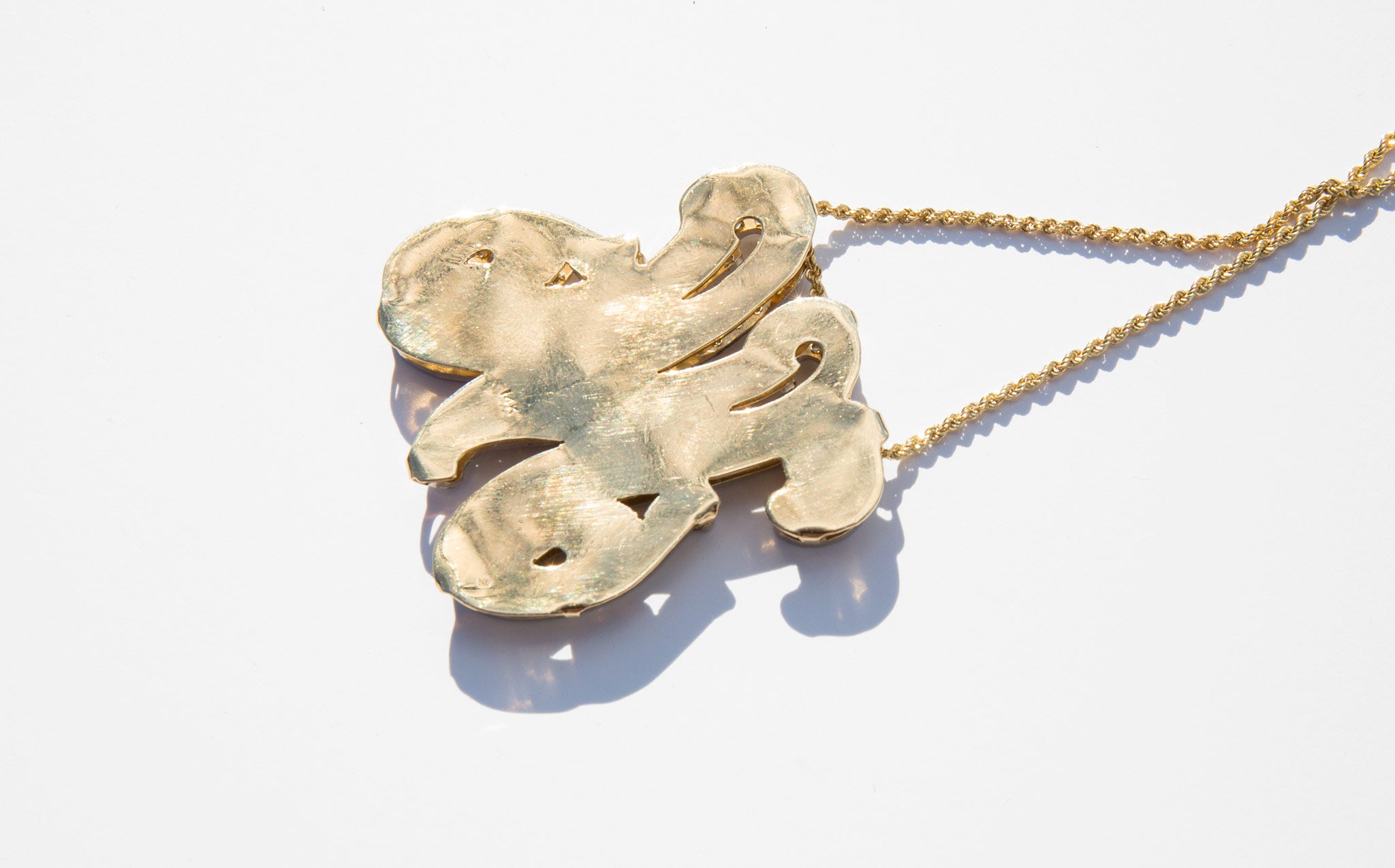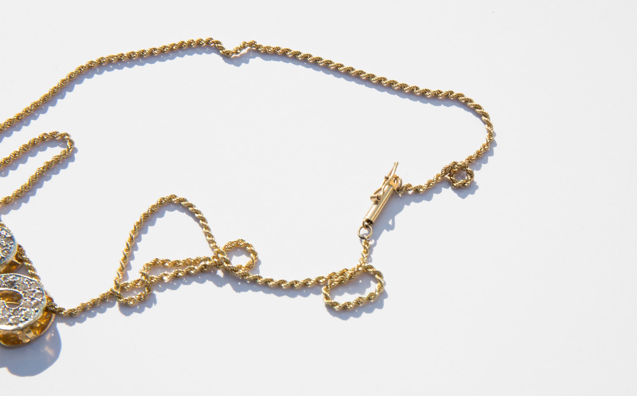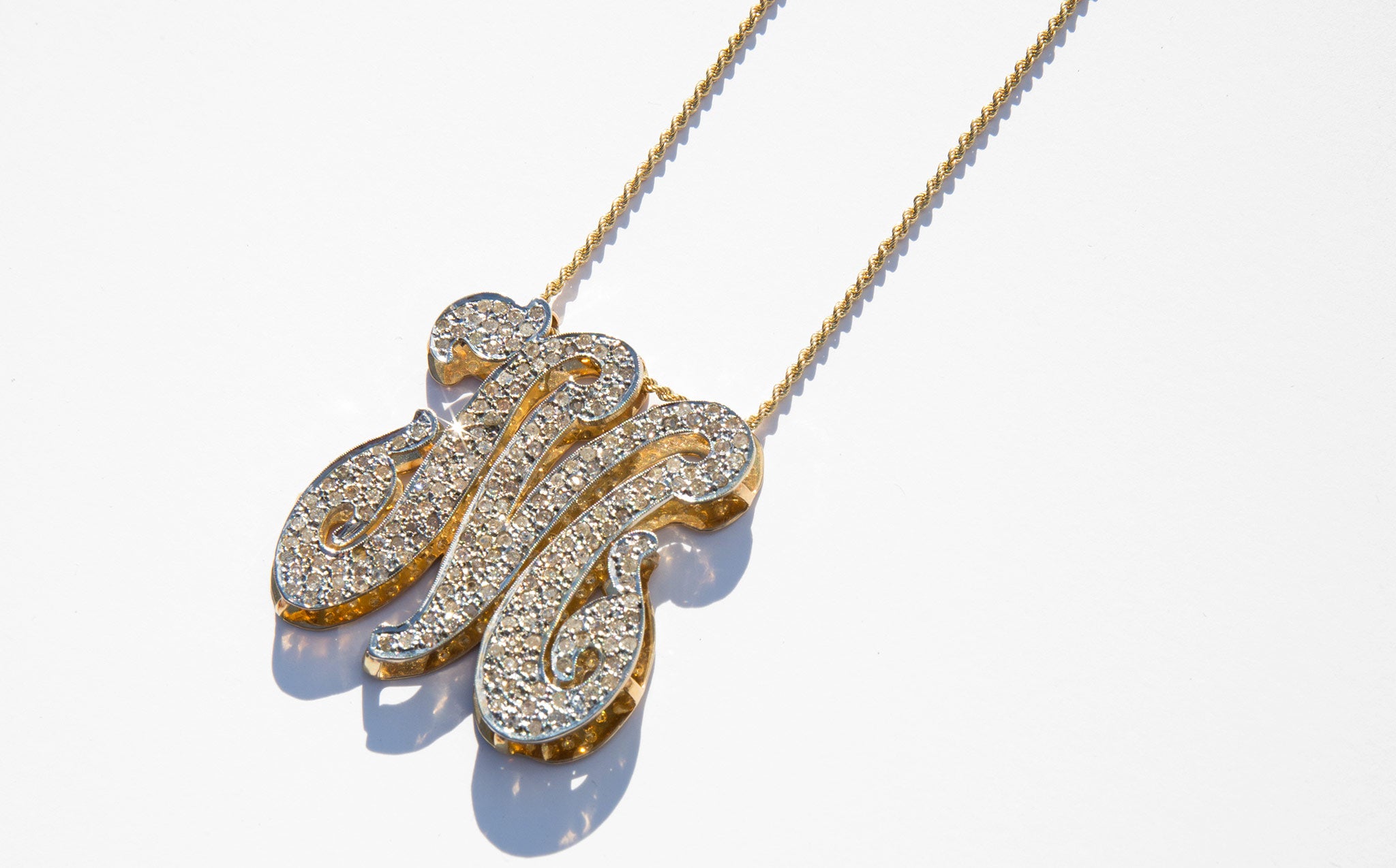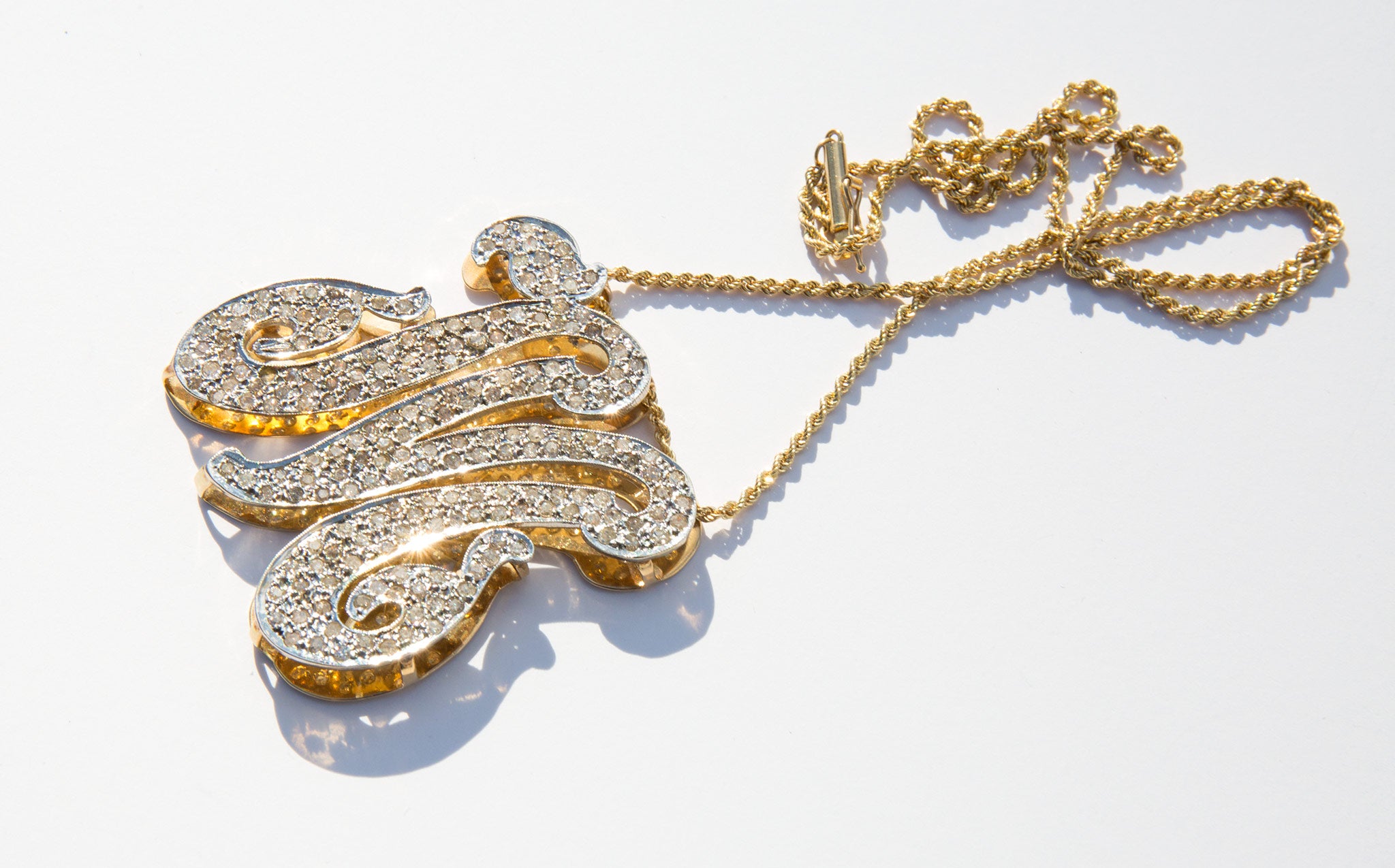 An incredible piece for just the right person (hint...you have a connection to the letter M) – a magnificent large 14k gold "M" with two carats of diamonds strung on a 14k gold rope chain.