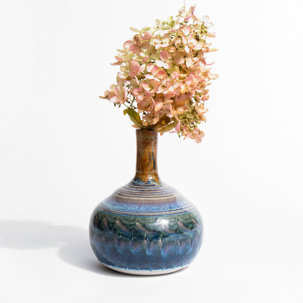 Hand fired glazed pottery bud vase with swirls of ombre pastels.