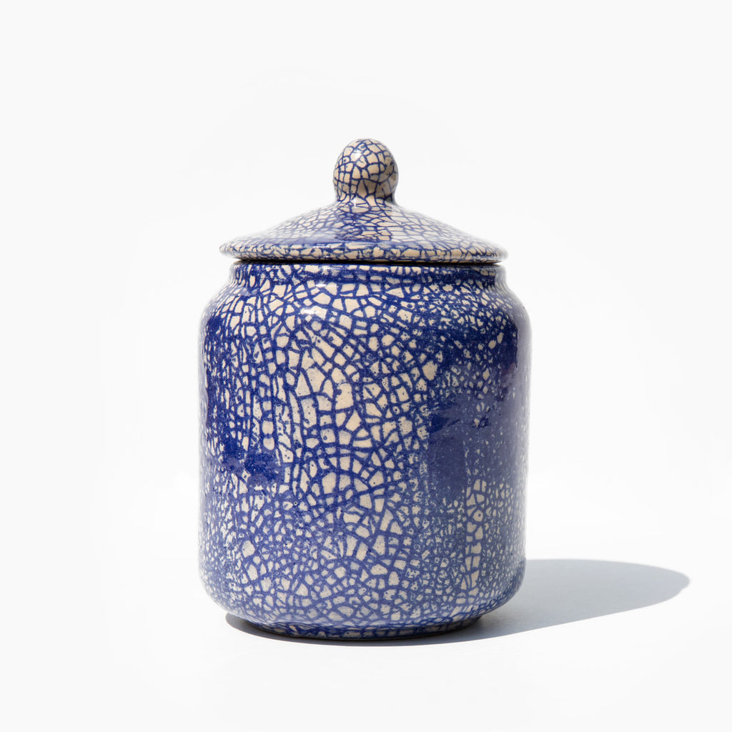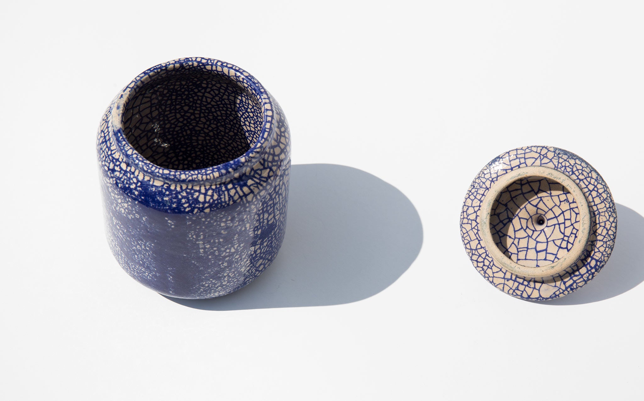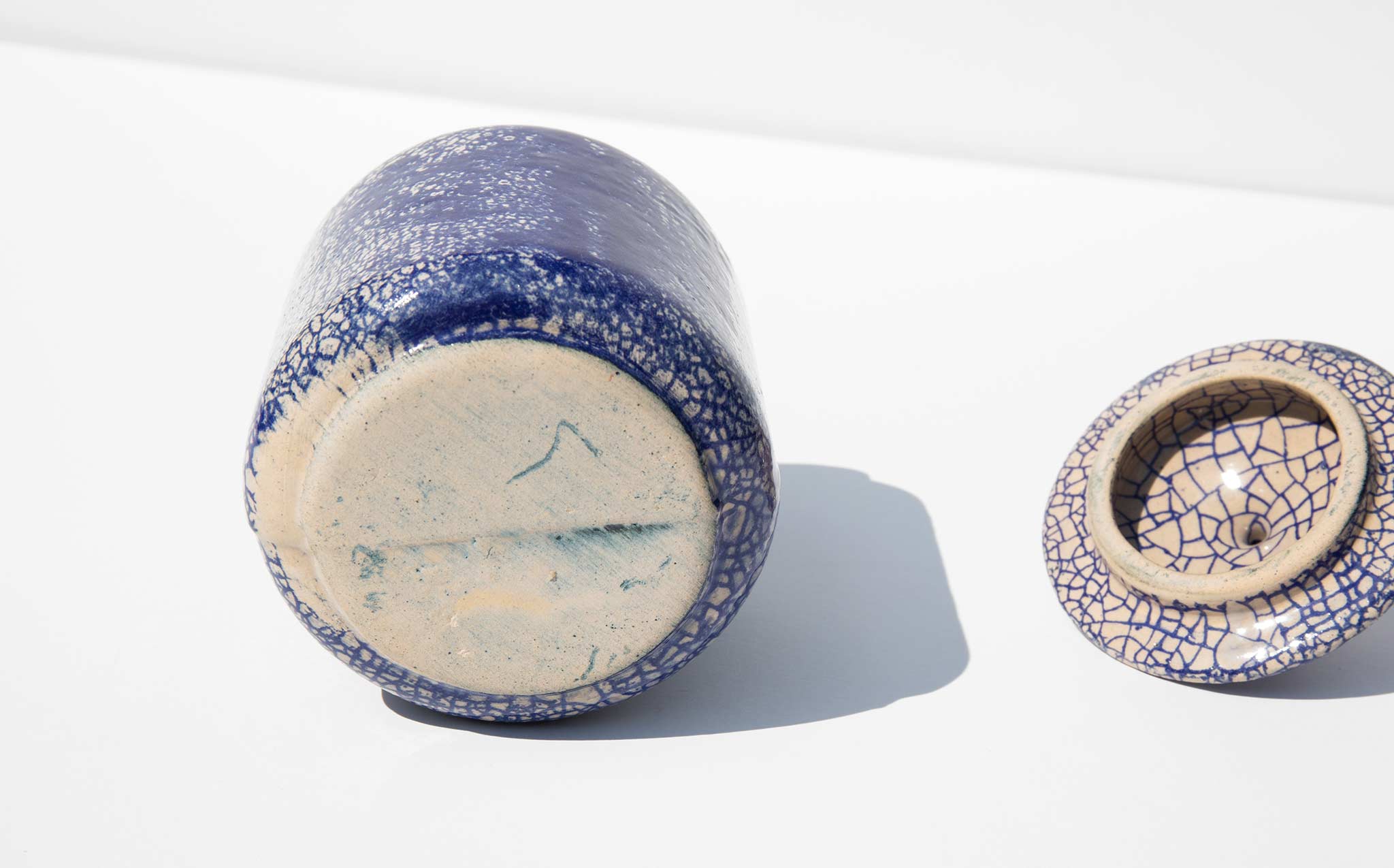 Small, lidded pottery sugar bowl with interesting, cobalt crackle glaze.