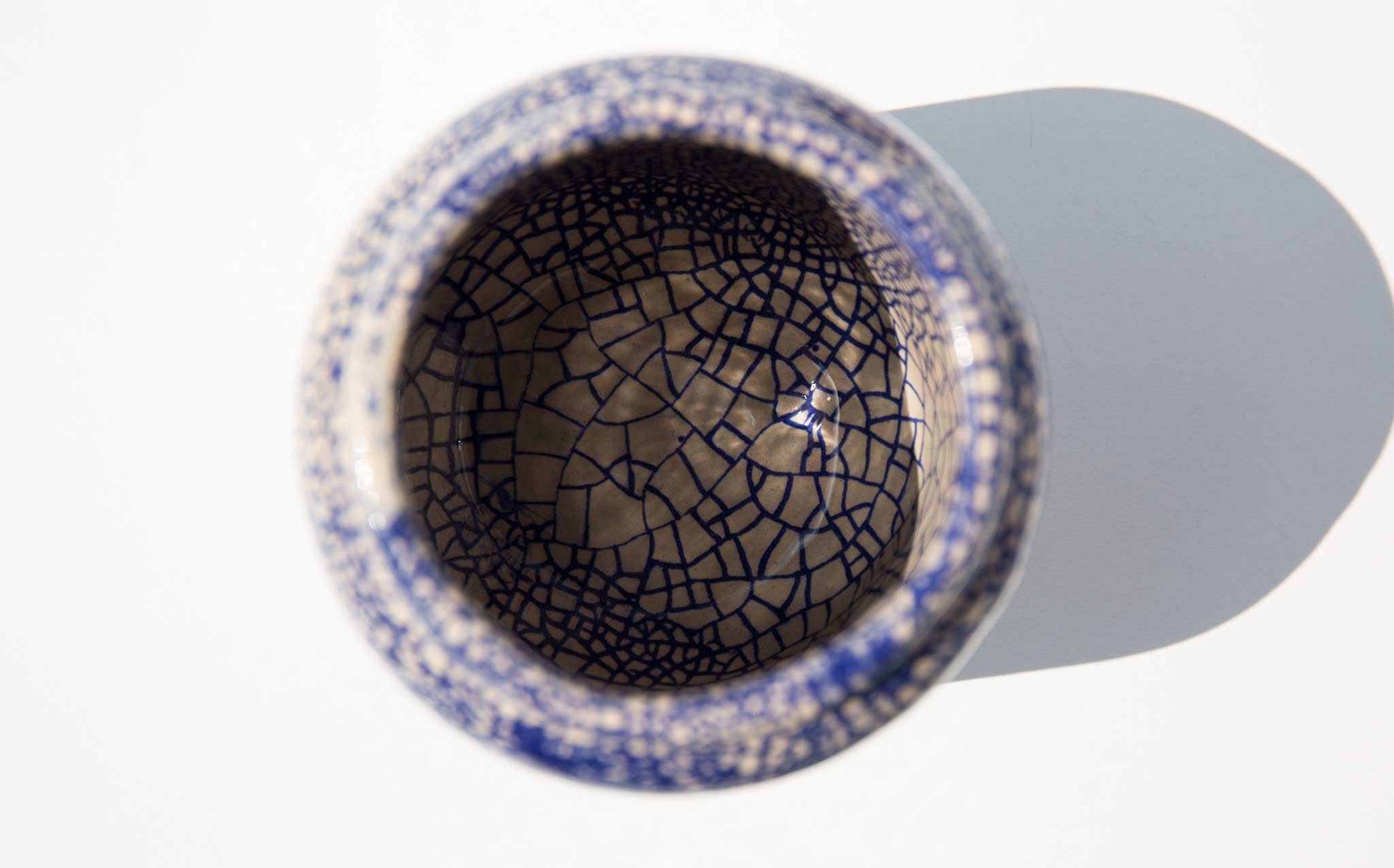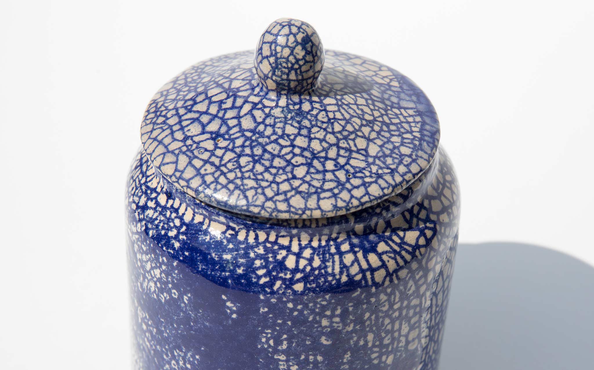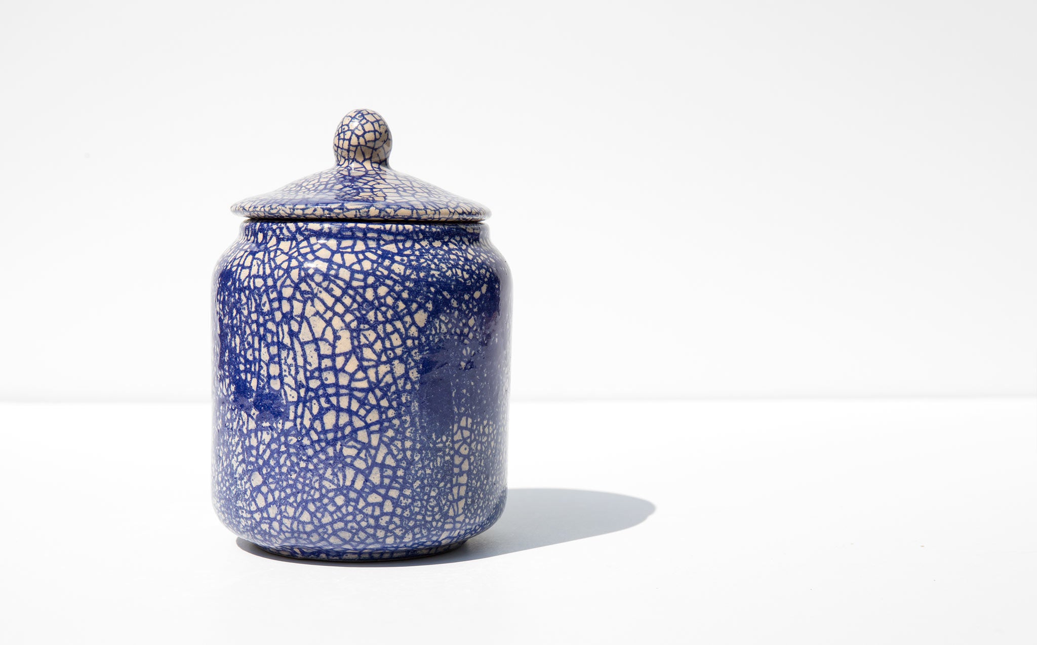 Small, lidded pottery sugar bowl with interesting, cobalt crackle glaze.