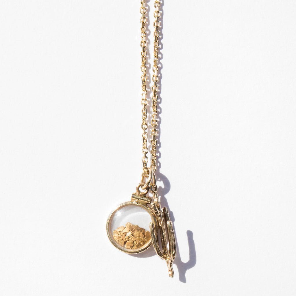 Dreams of the American Southwest – vintage 14k cactus charm and an antique 10k and glass window charm with gold rush flake strung on a vintage 14k link chain.