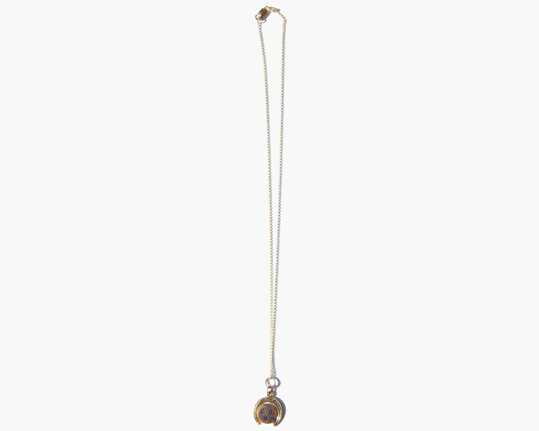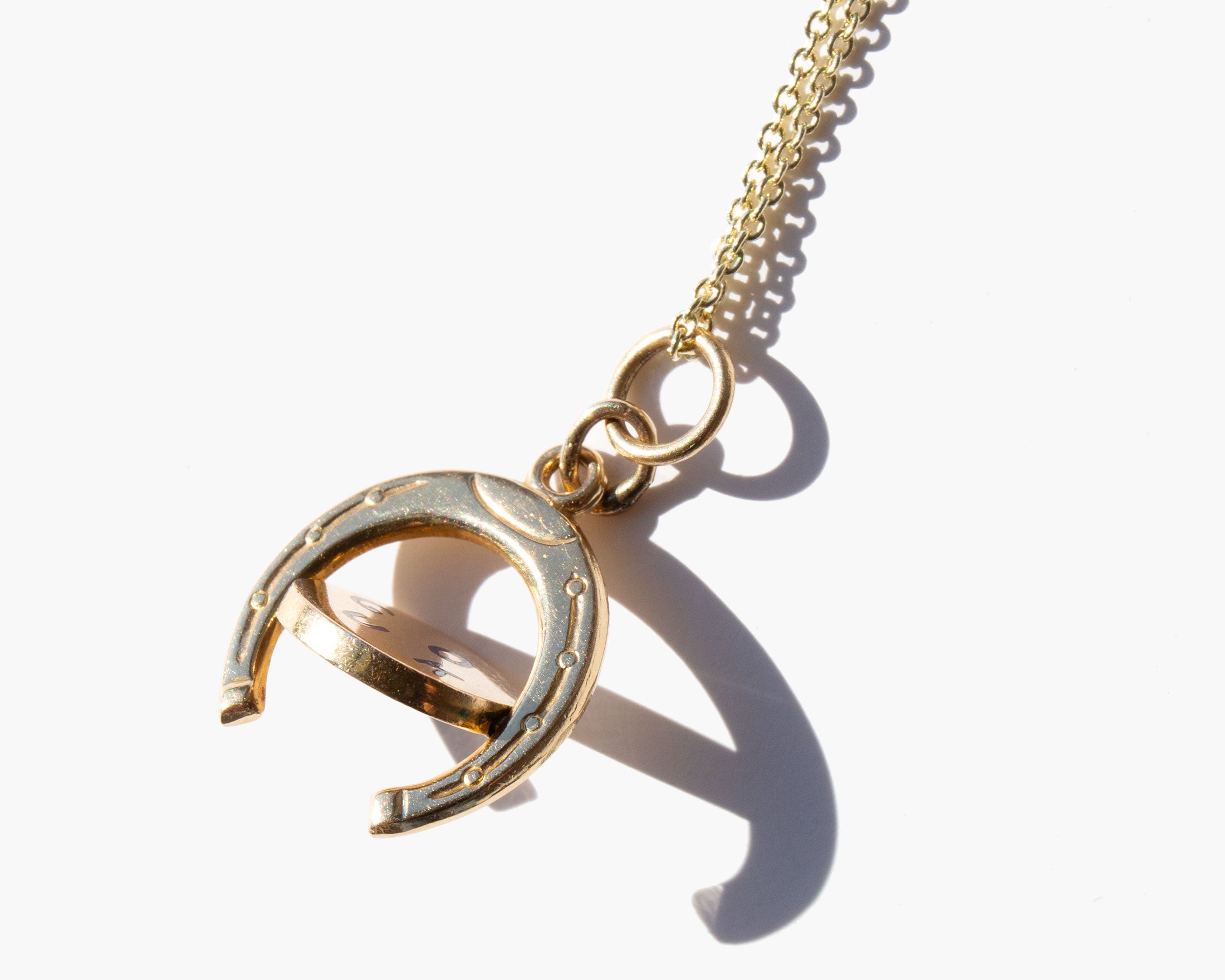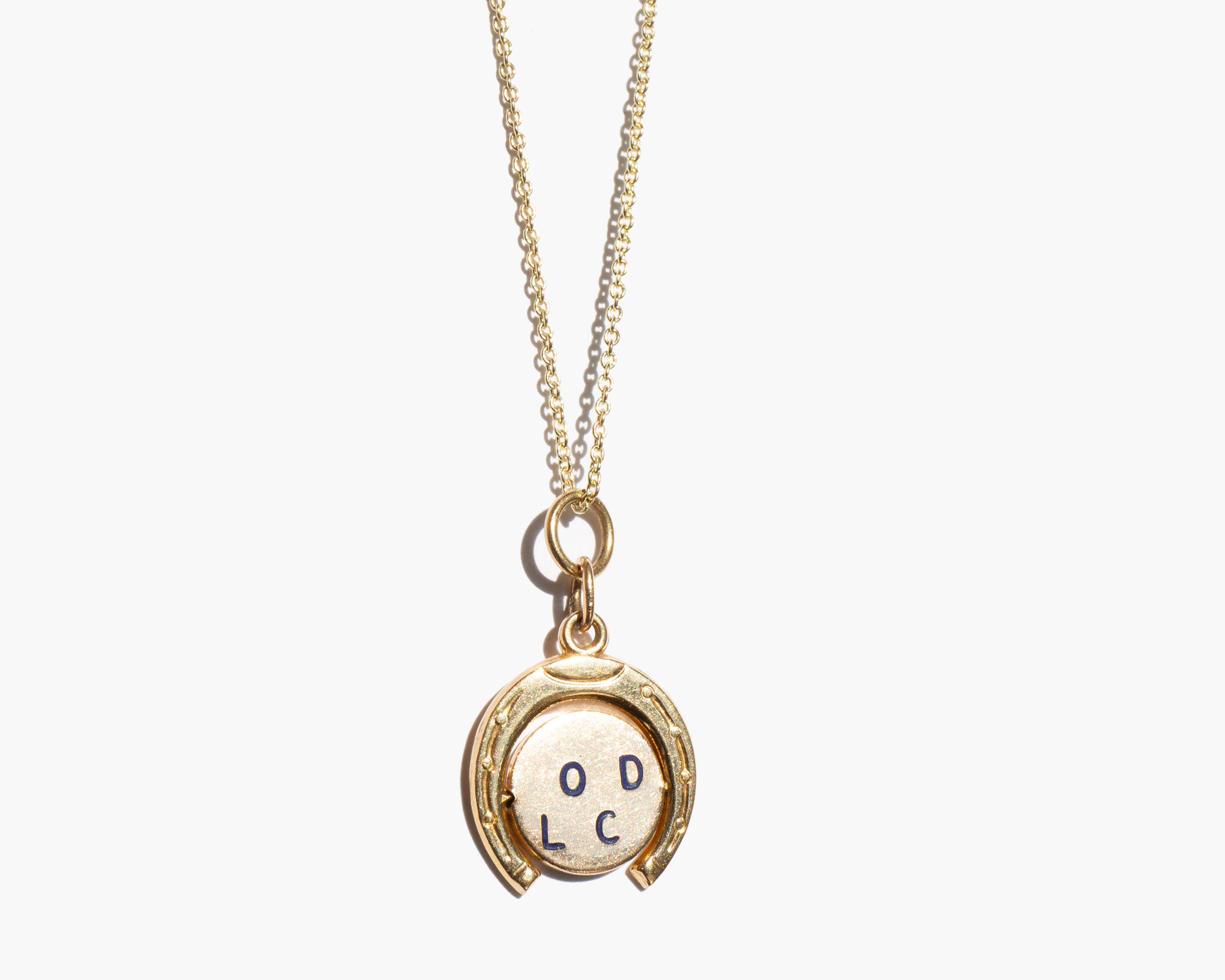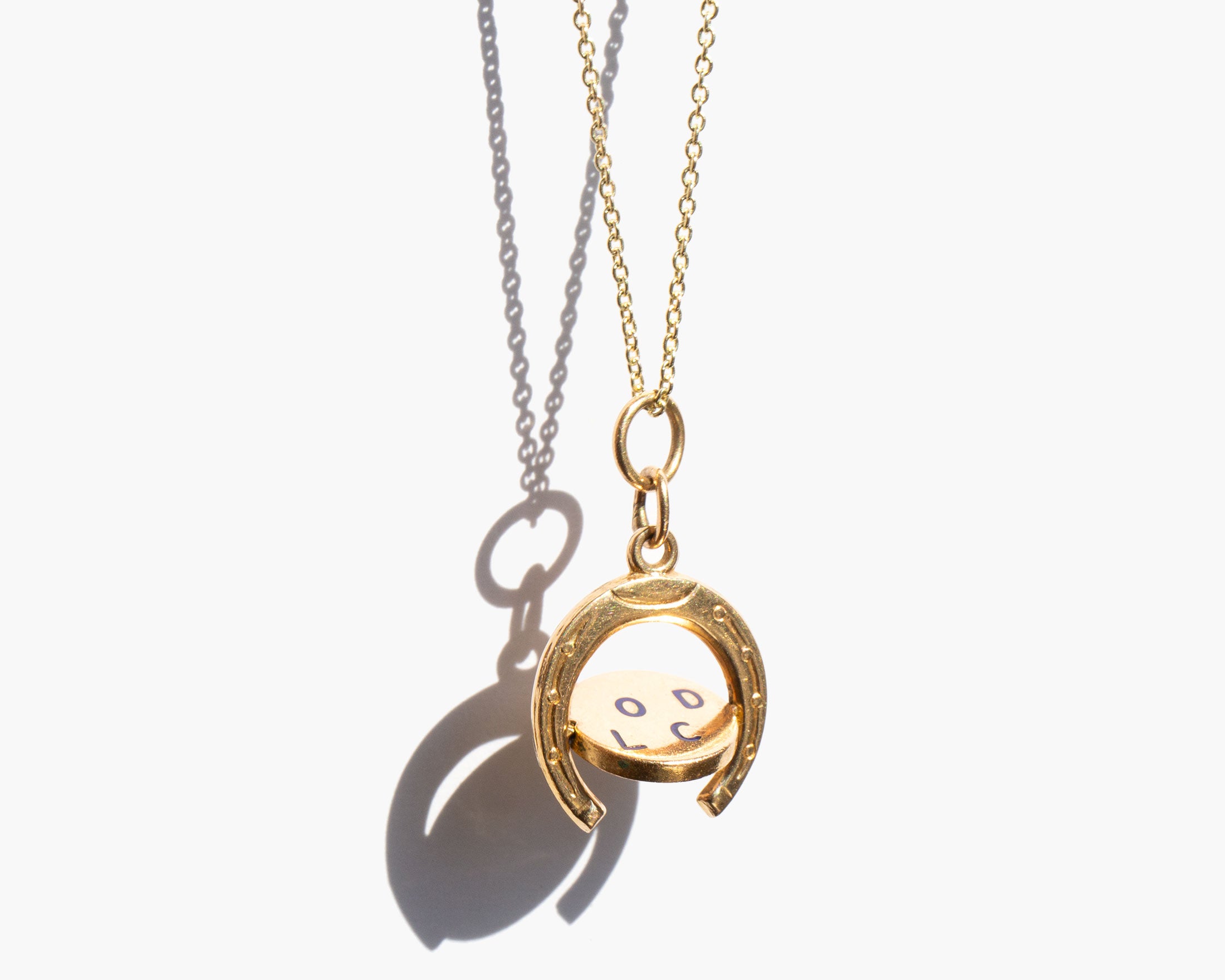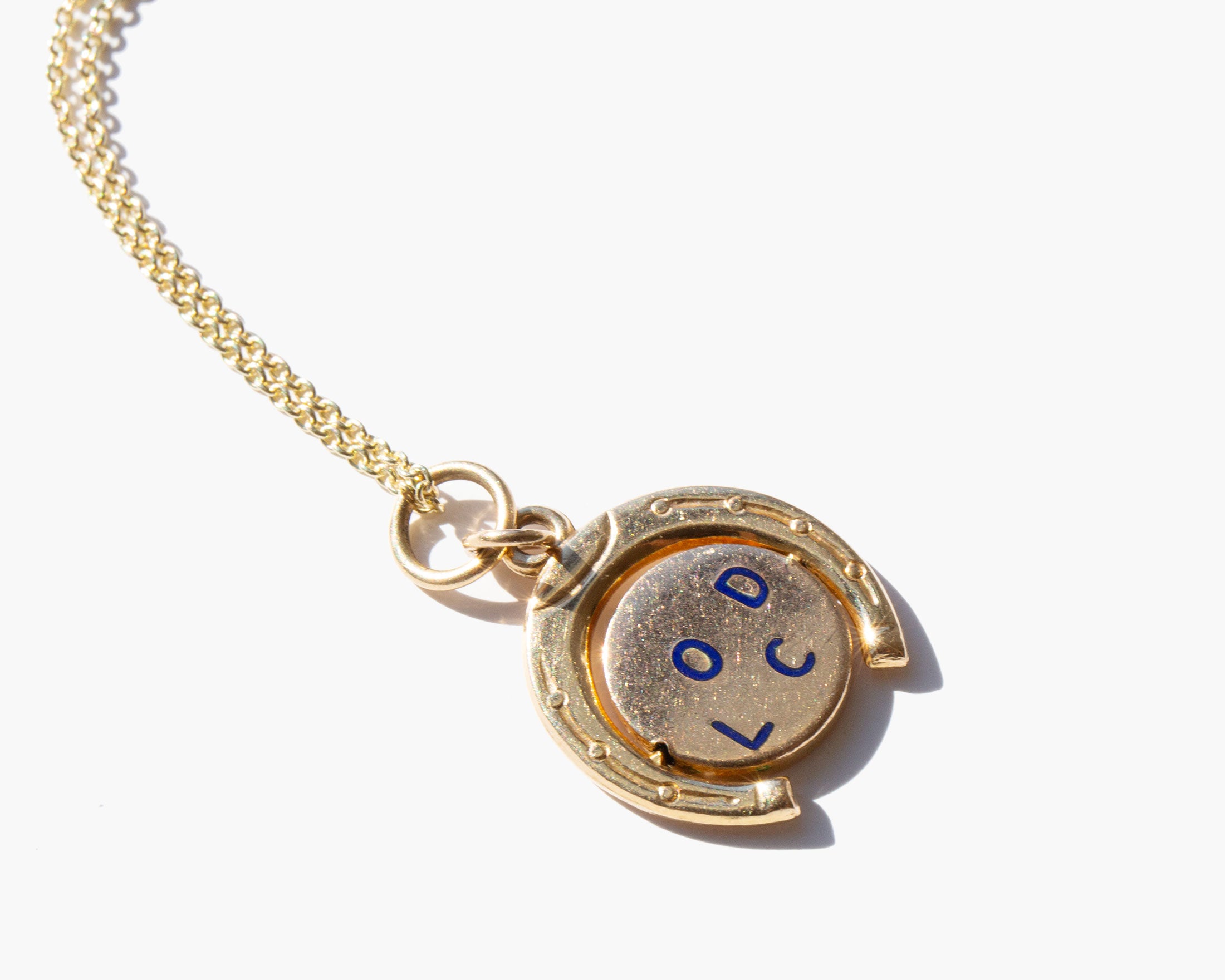 Horseshoe encased 10k gold spinner charm that says "Good Luck" when rotating on a delicate 14k gold chain.