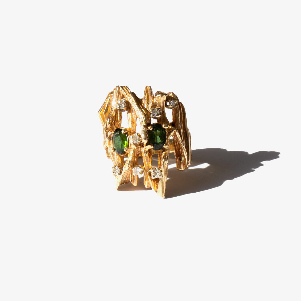 Unique brutalist style ring of 14k gold with diamonds and tourmaline. Green tourmaline is considered a lucky stone and is said to aid the manifesting of wishes and desires.