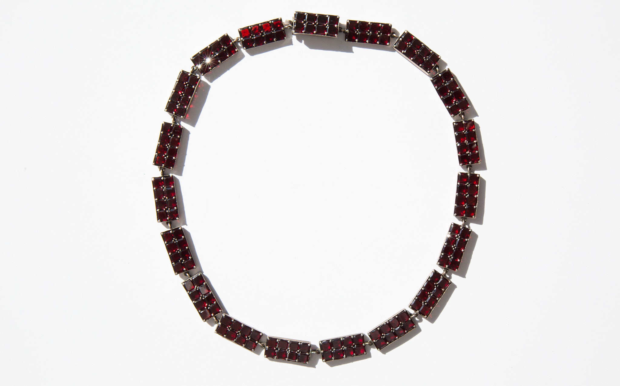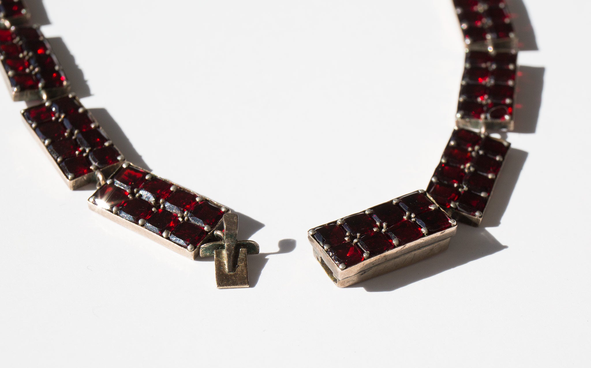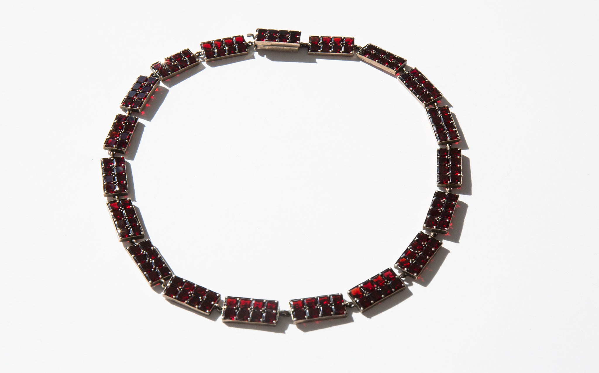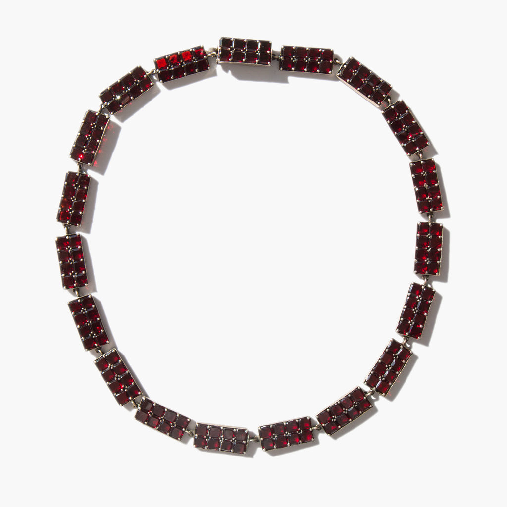 Elegant, geometric sterling silver and garnet gemstone collar. A popular amulet of the middle ages, the garnet was thought to guard against evil spirits in the night and was a stone used for general protection against malevolent spiritual forces, that would guide the wearer through darkness, and even protect from poisoning. In more modern times the garnet is often gifted between friends and loved ones for protection before a period of extended separation.