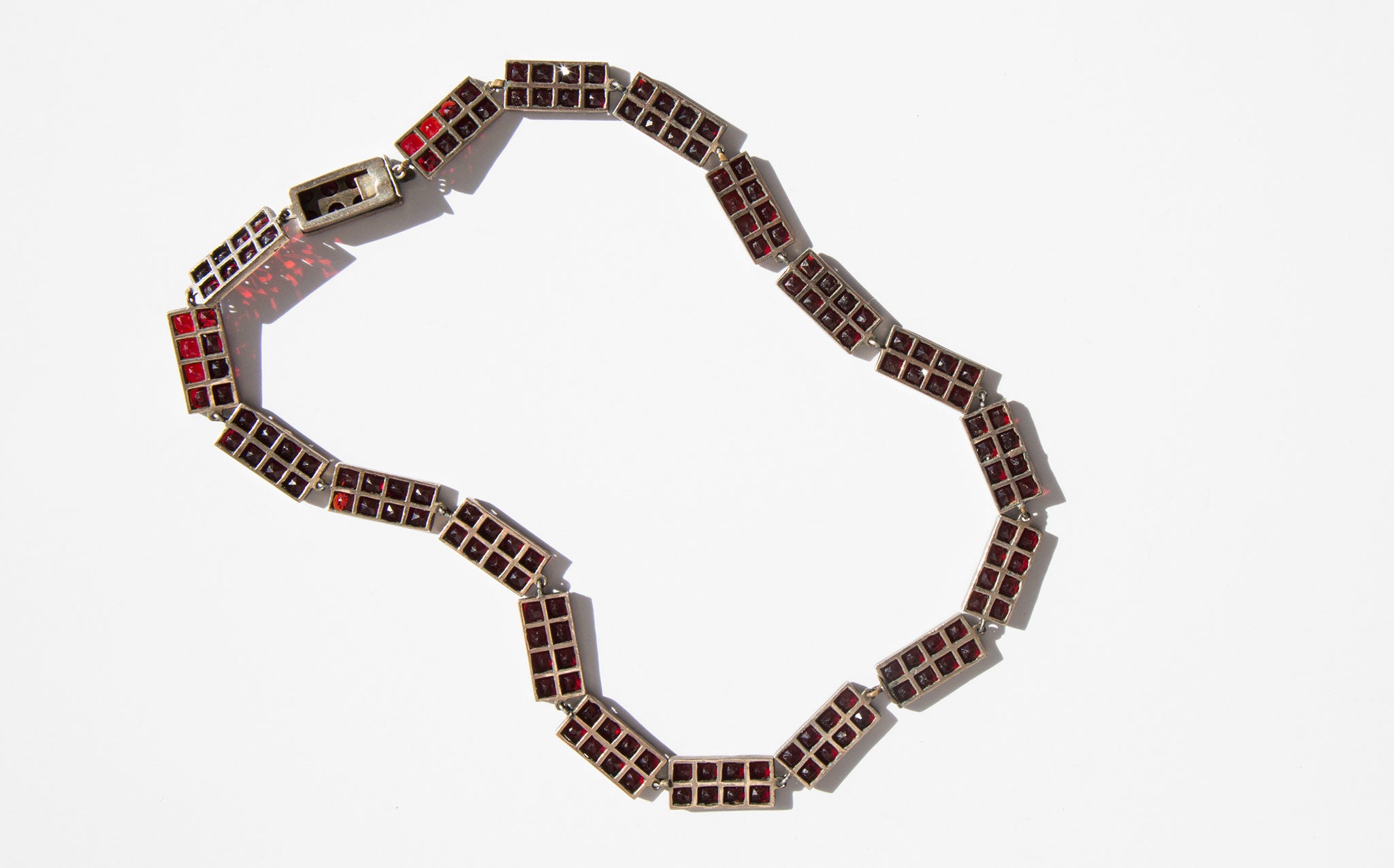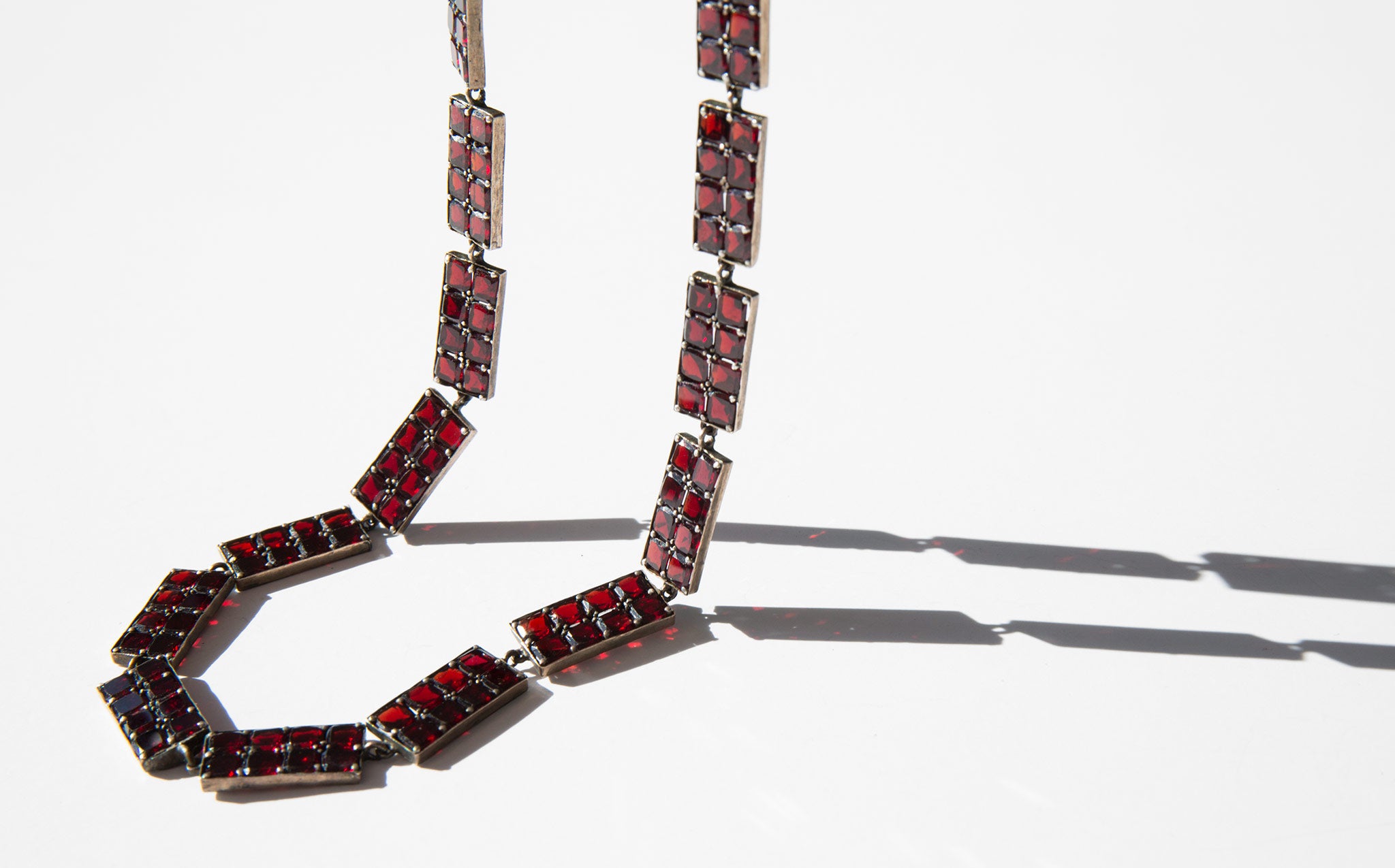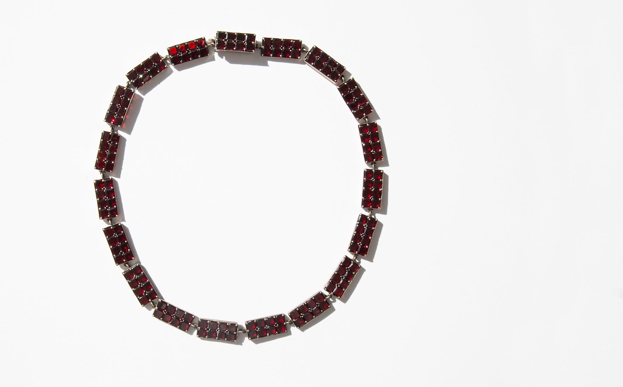 Elegant, geometric sterling silver and garnet gemstone collar. A popular amulet of the middle ages, the garnet was thought to guard against evil spirits in the night and was a stone used for general protection against malevolent spiritual forces, that would guide the wearer through darkness, and even protect from poisoning. In more modern times the garnet is often gifted between friends and loved ones for protection before a period of extended separation.