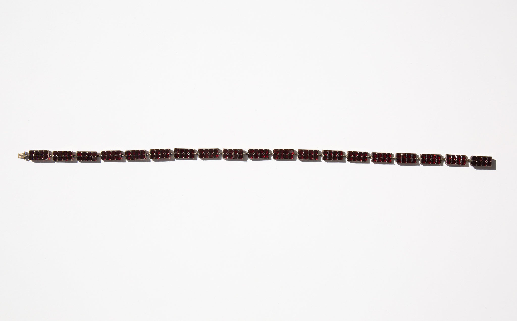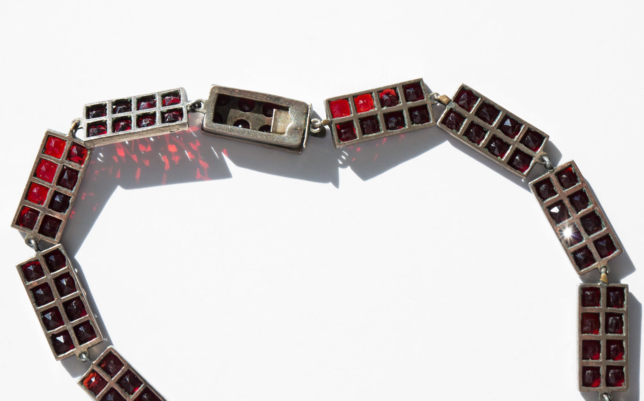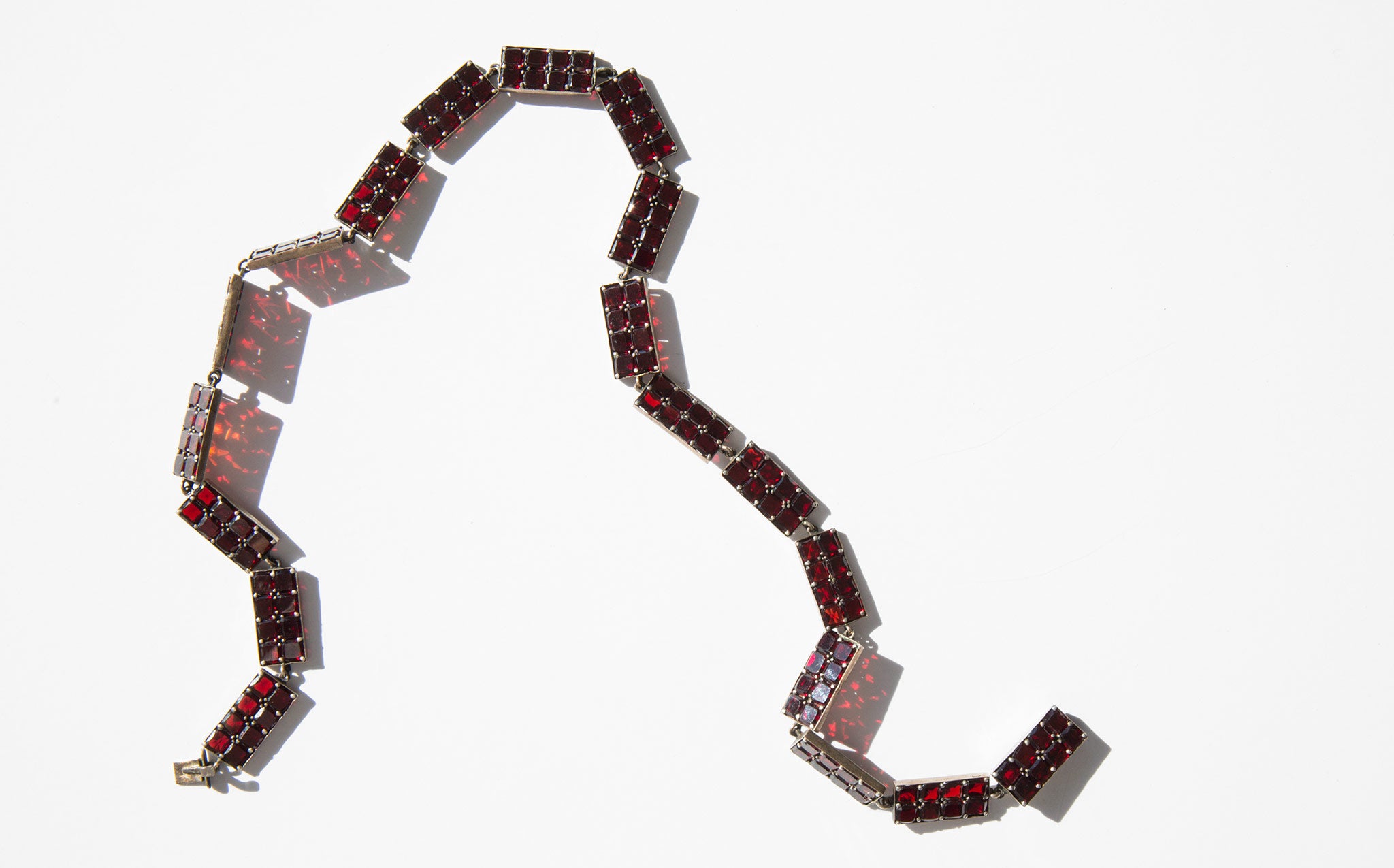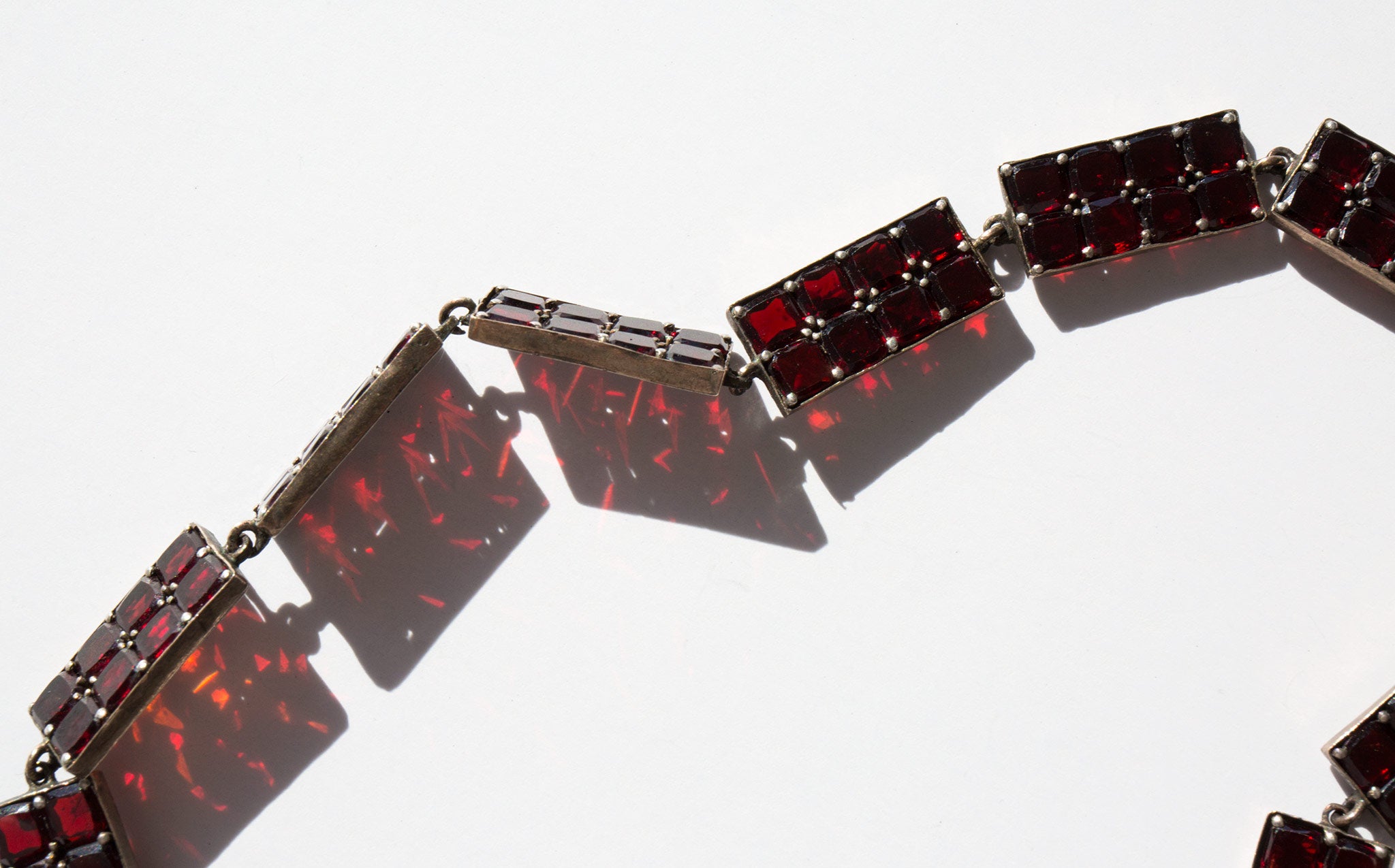 Elegant, geometric sterling silver and garnet gemstone collar. A popular amulet of the middle ages, the garnet was thought to guard against evil spirits in the night and was a stone used for general protection against malevolent spiritual forces, that would guide the wearer through darkness, and even protect from poisoning. In more modern times the garnet is often gifted between friends and loved ones for protection before a period of extended separation.