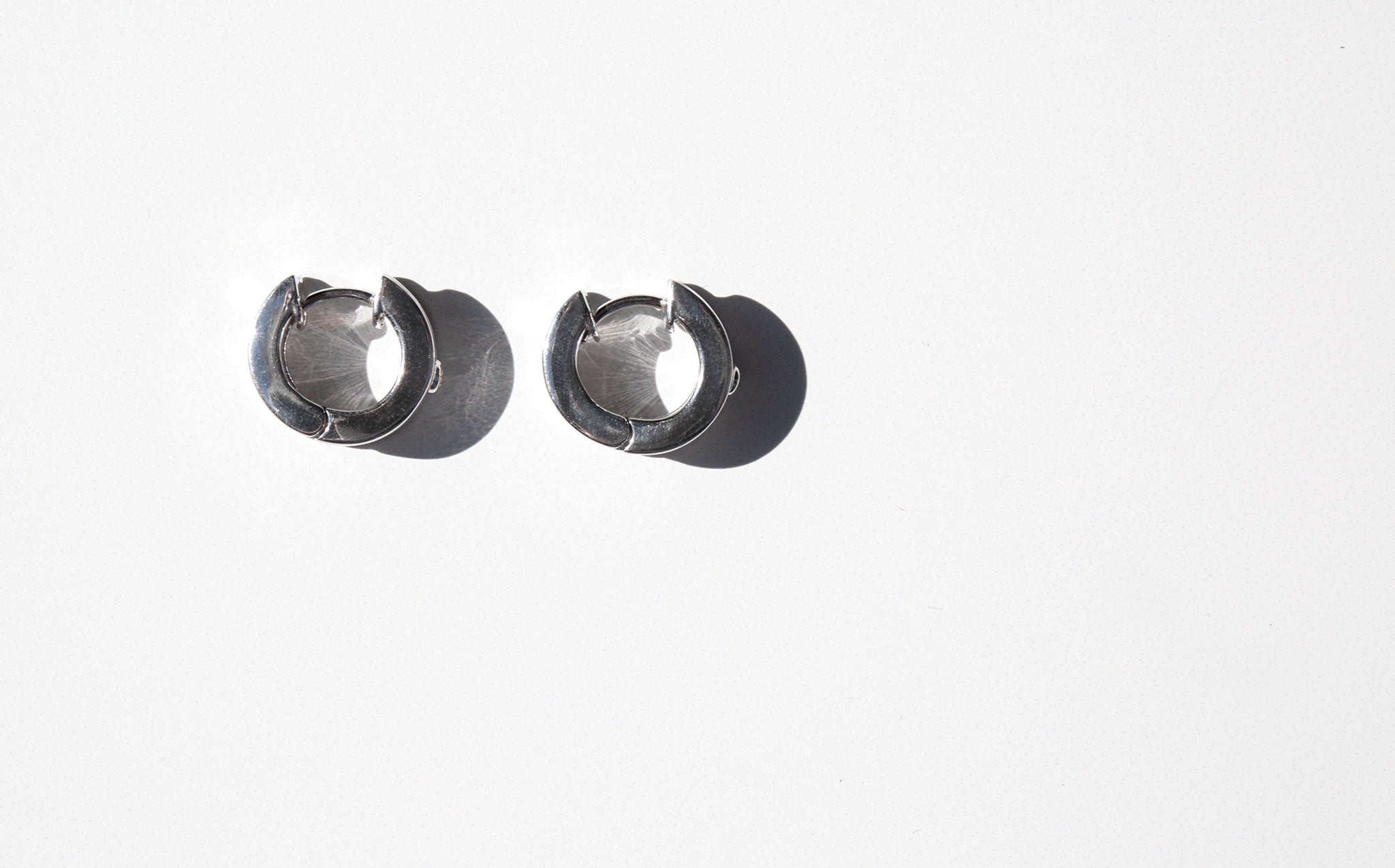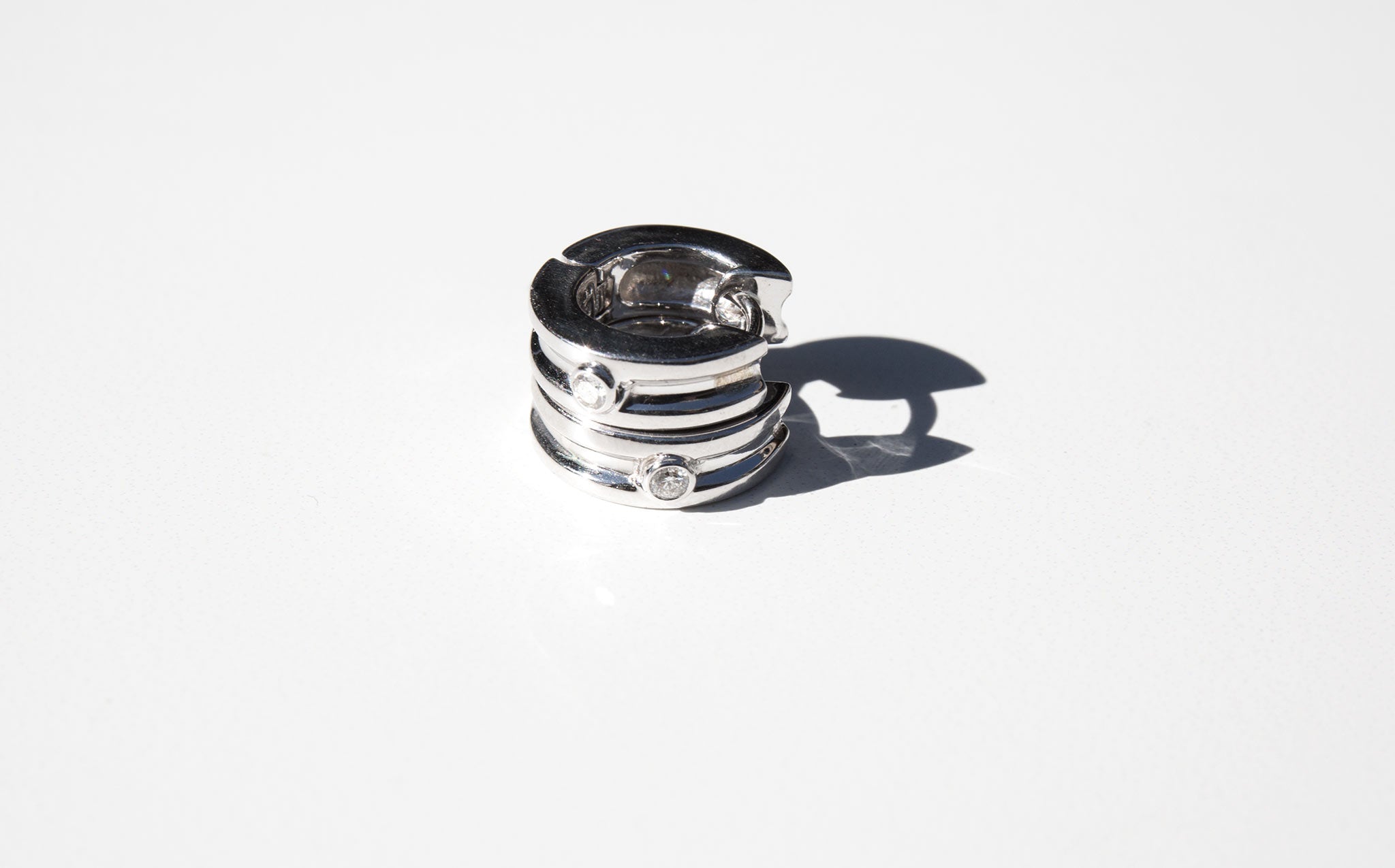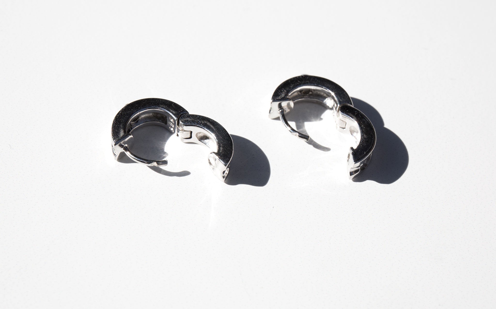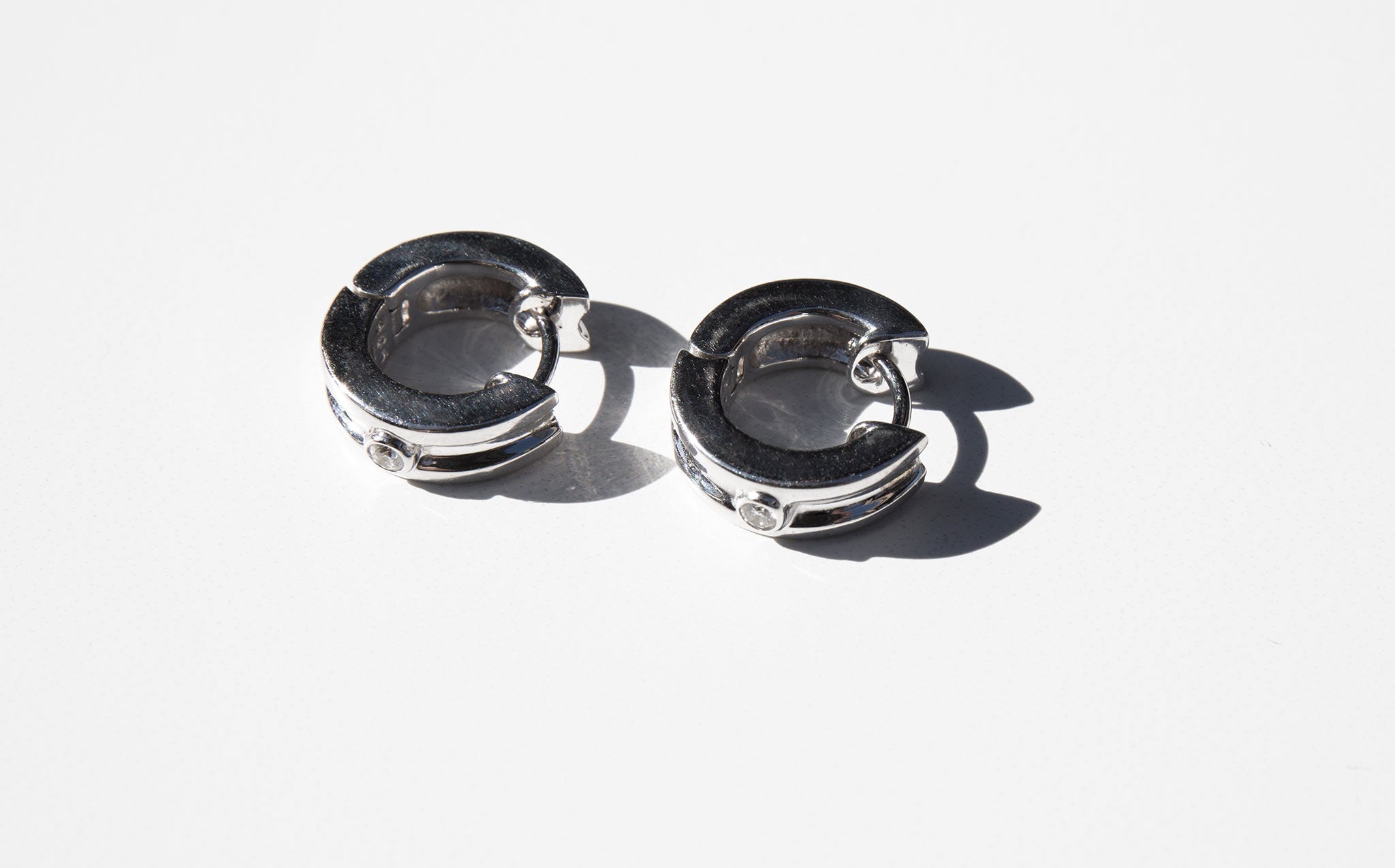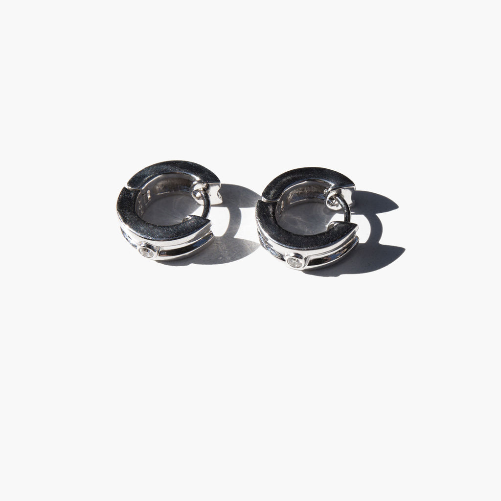 Luxurious 18k white gold huggie hoops accented with a small elegant diamond.
