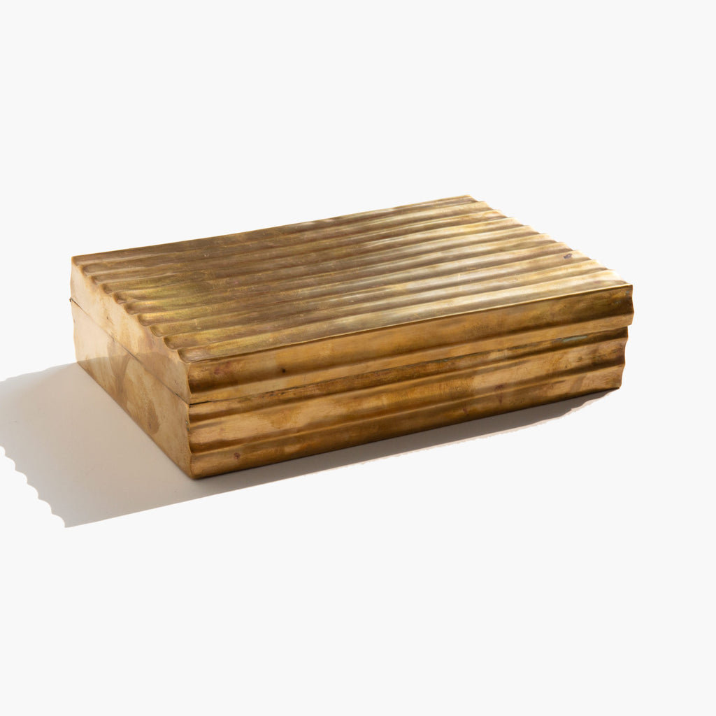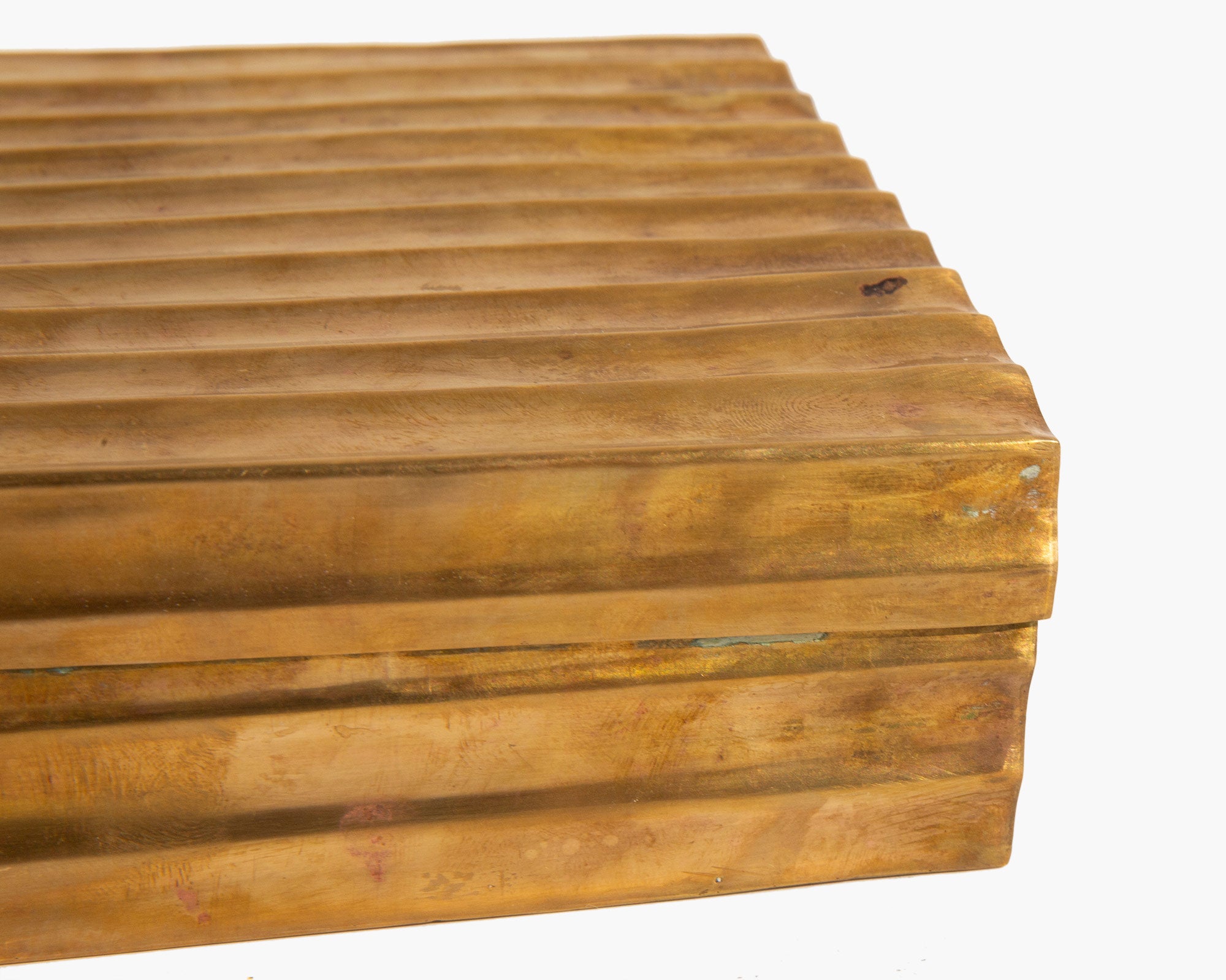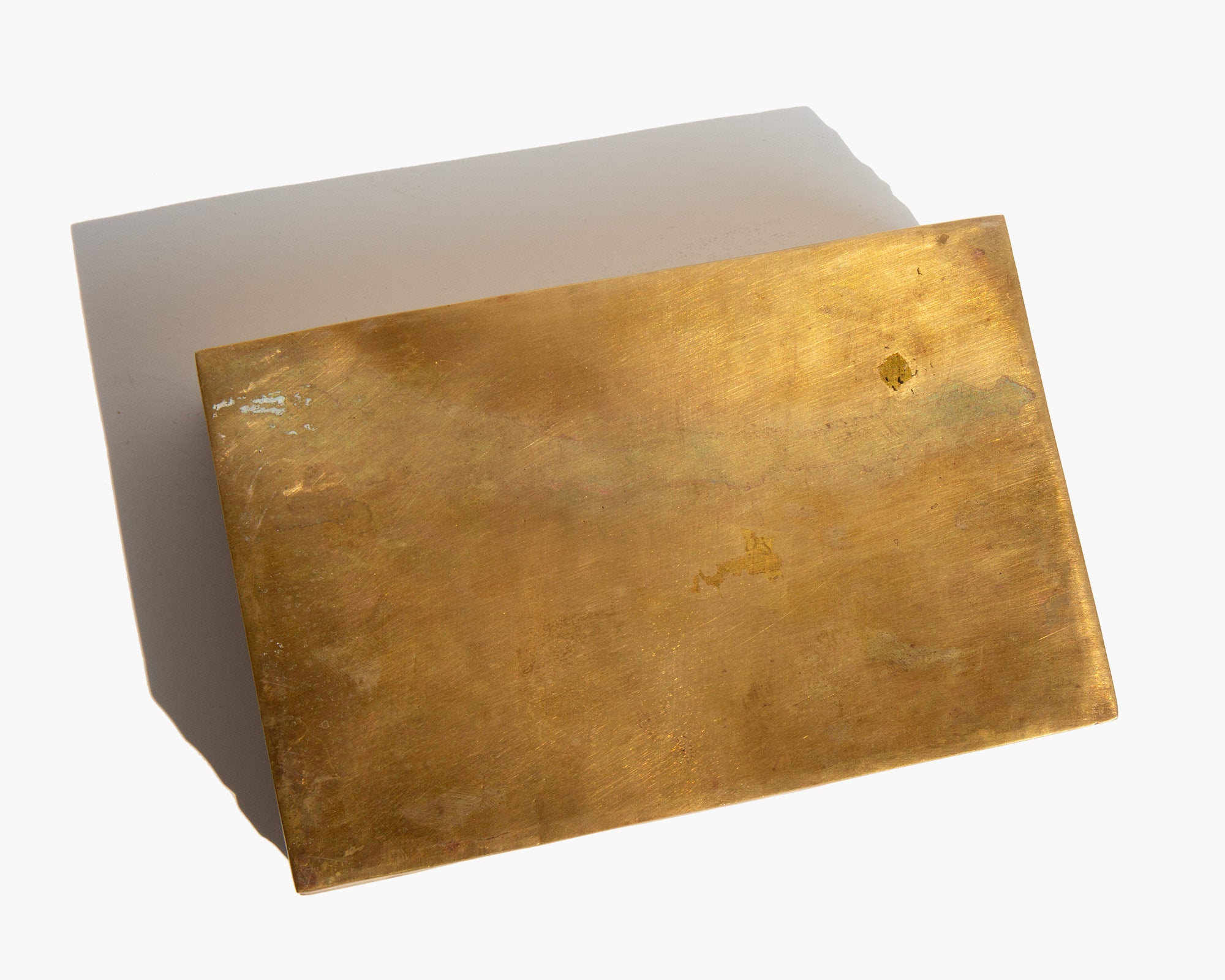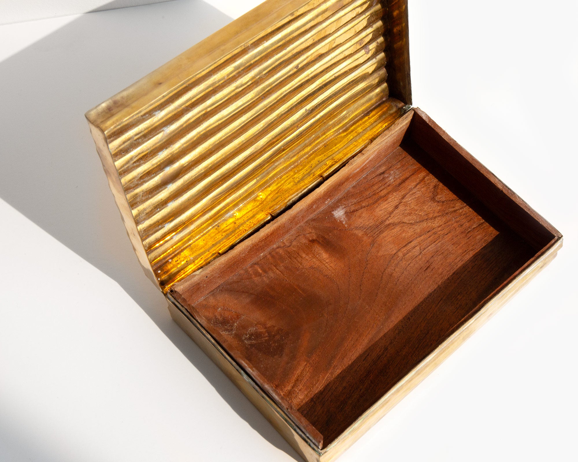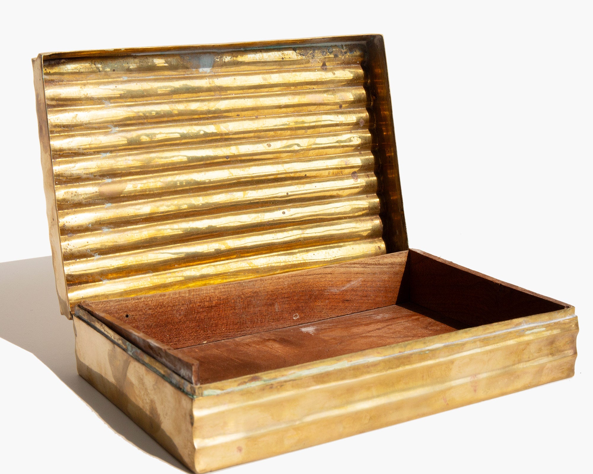 Aged brass treasures box lined in wood.
