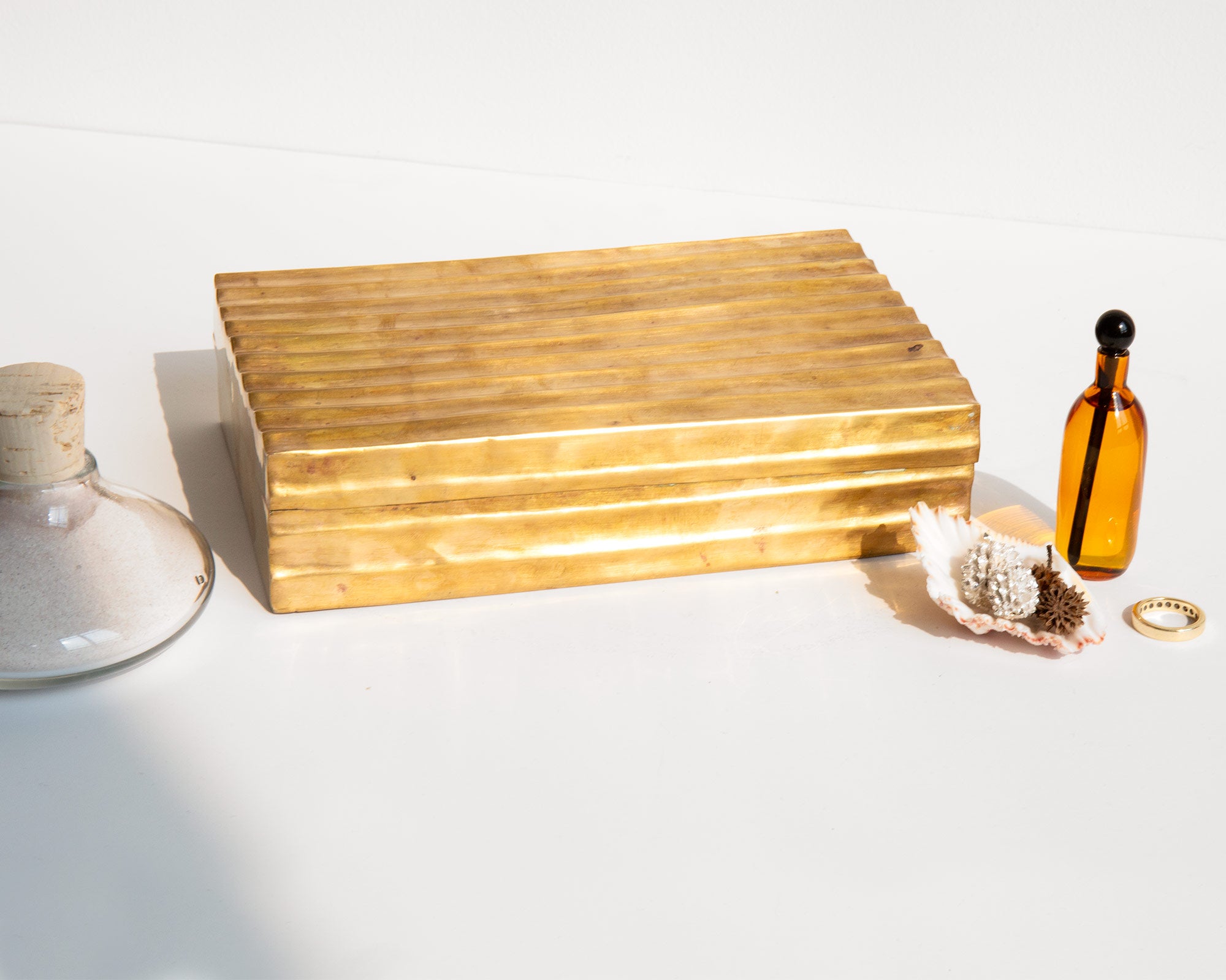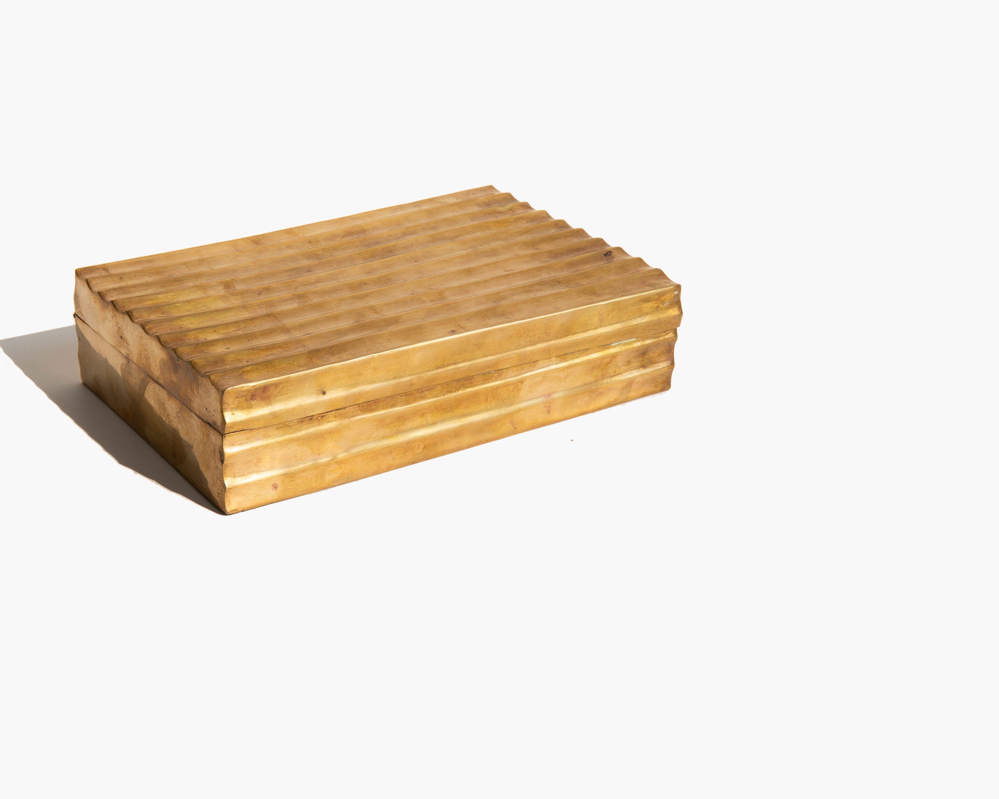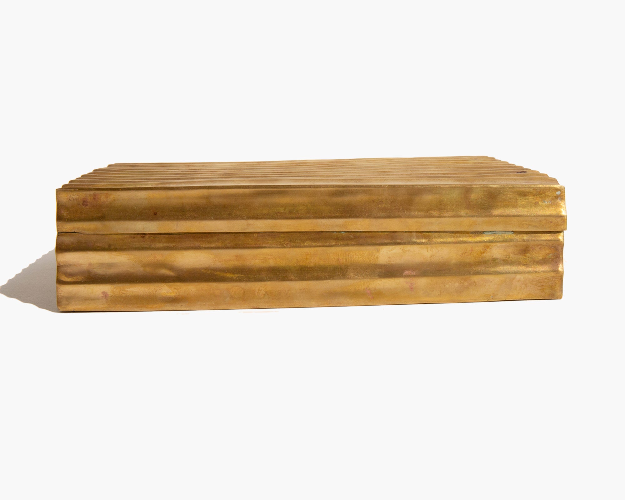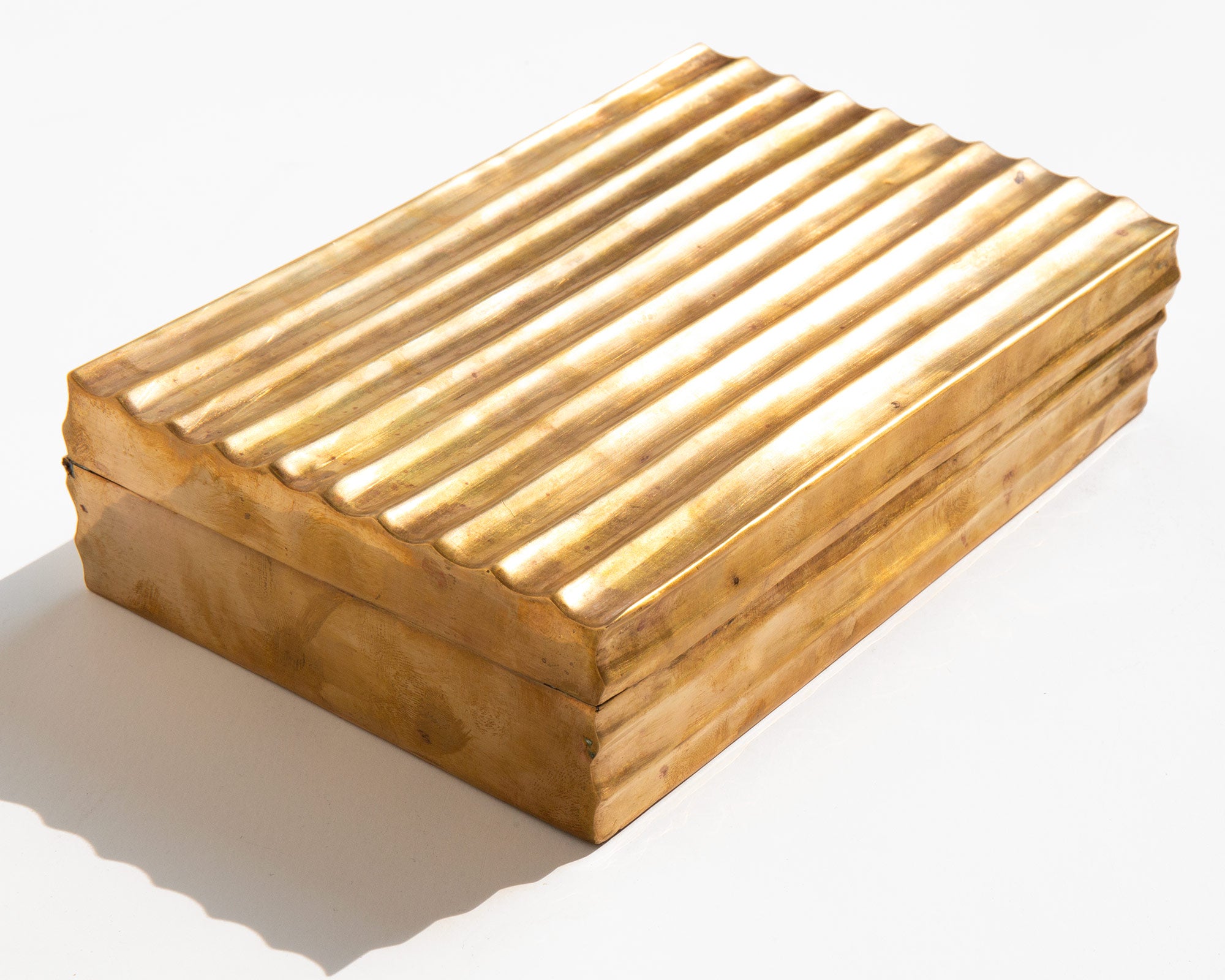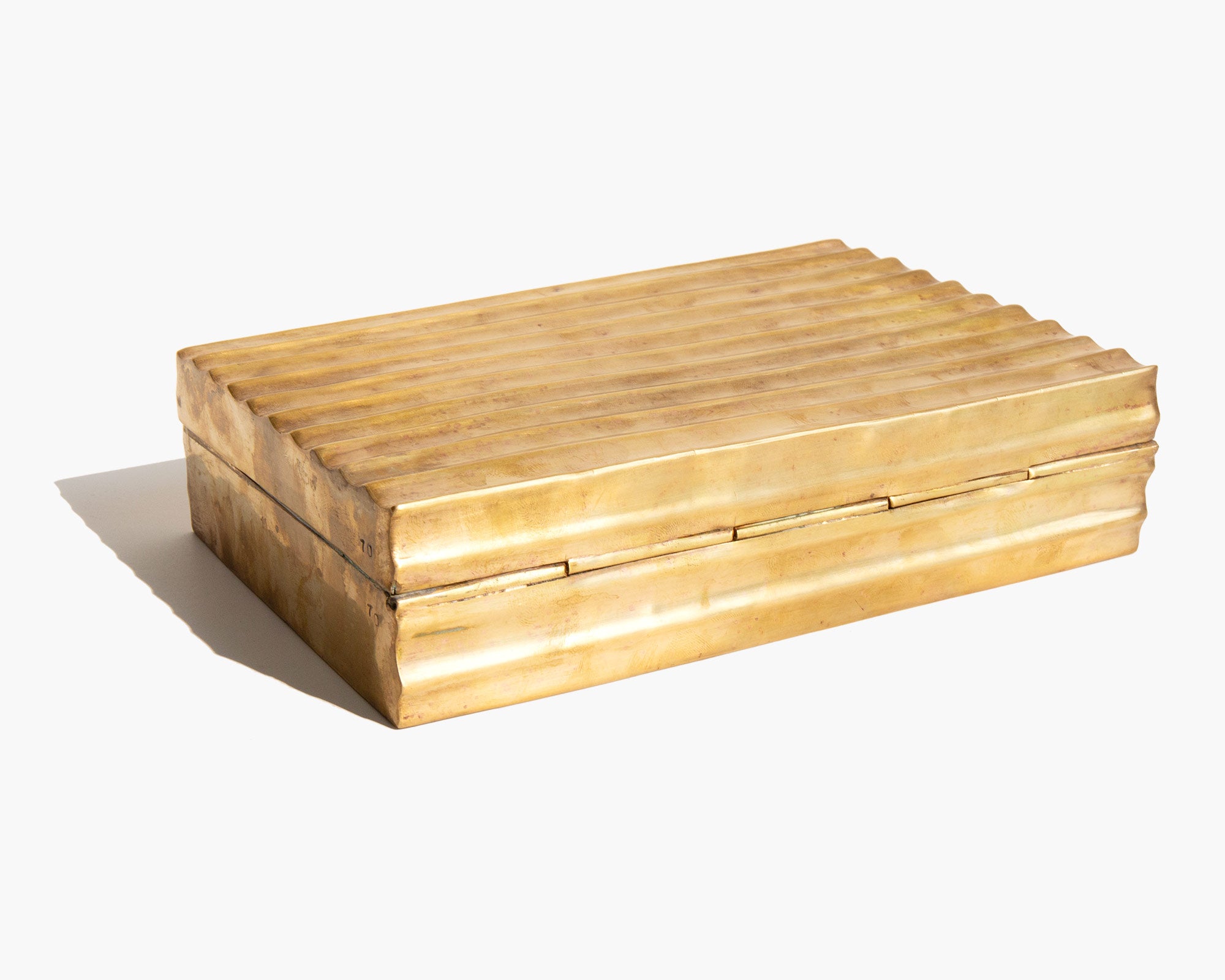 Aged brass treasures box lined in wood.