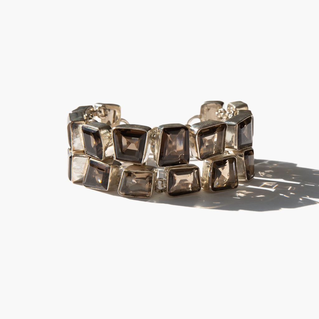 Sterling silver link bracelet with large and sparkling faceted smoky topaz stones. Topaz is used to remove energy barriers so that ones hidden talents, strengths, and energies can be released.