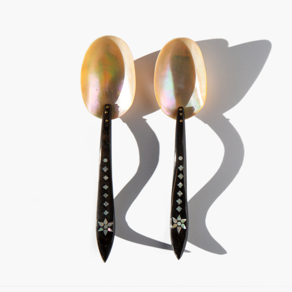 Set of two large serving spoons with rainbow iridescent mother of pearl head and inlaid handle.