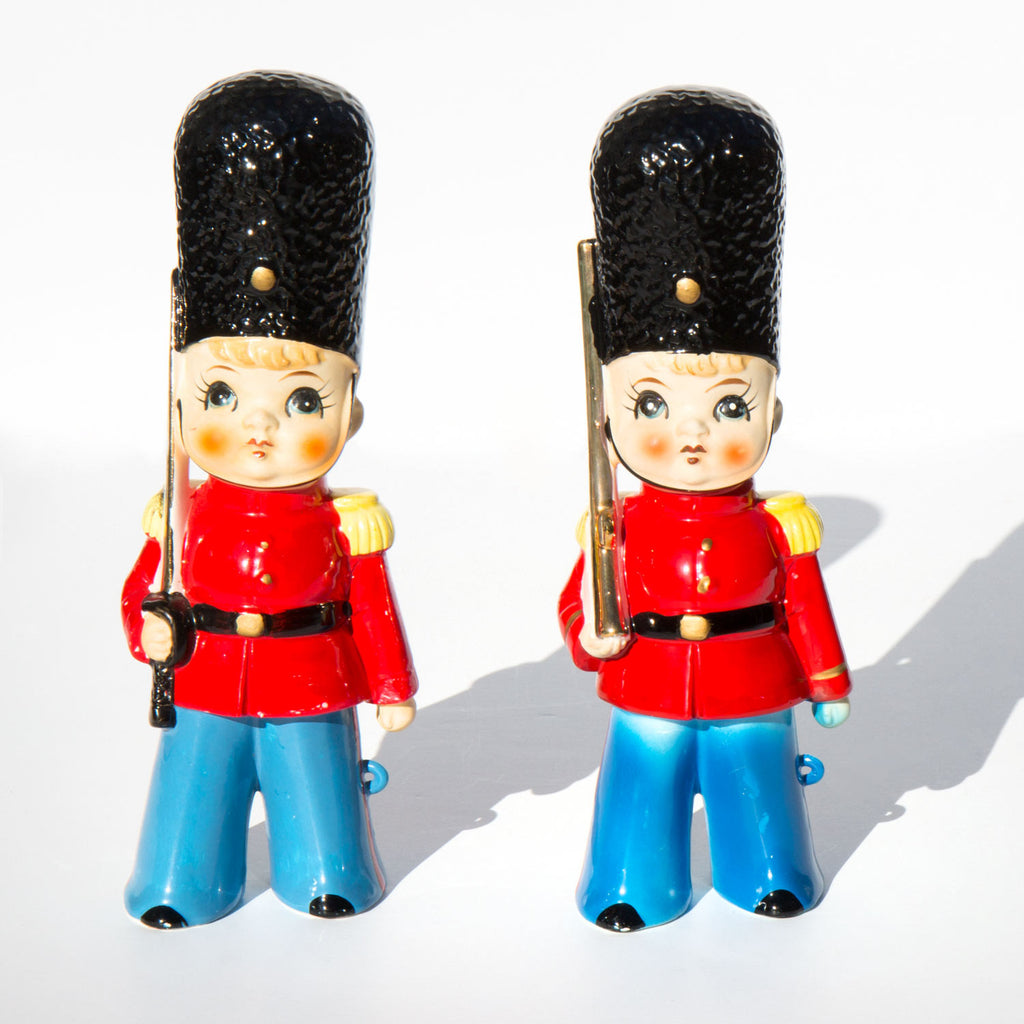 Painted ceramic holiday soldier boys, made in Japan. Set of 2.