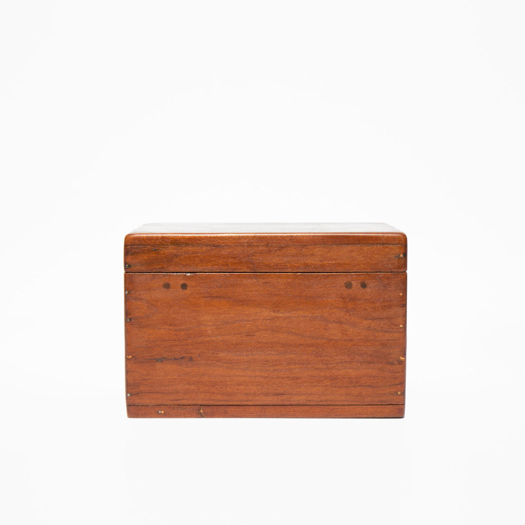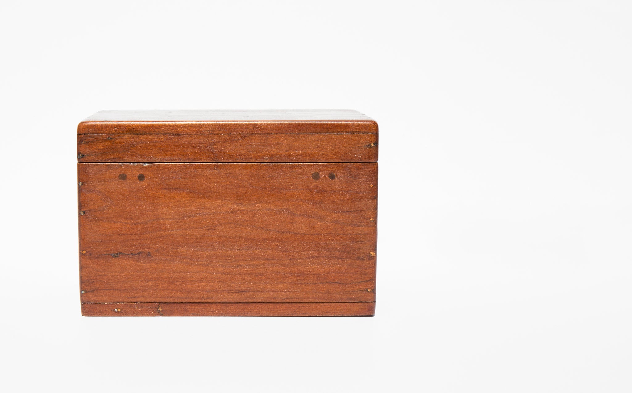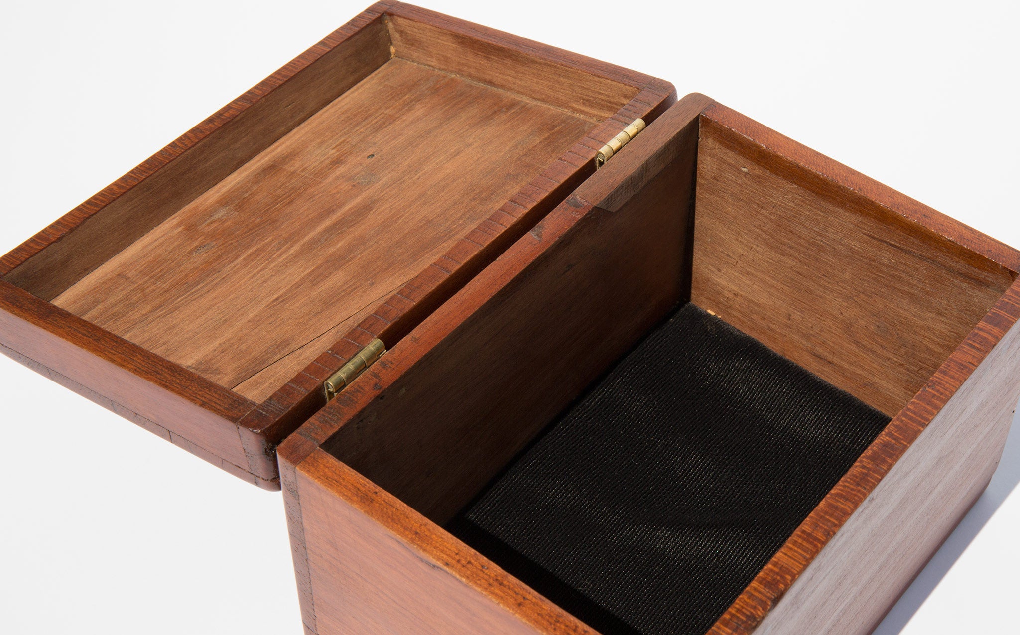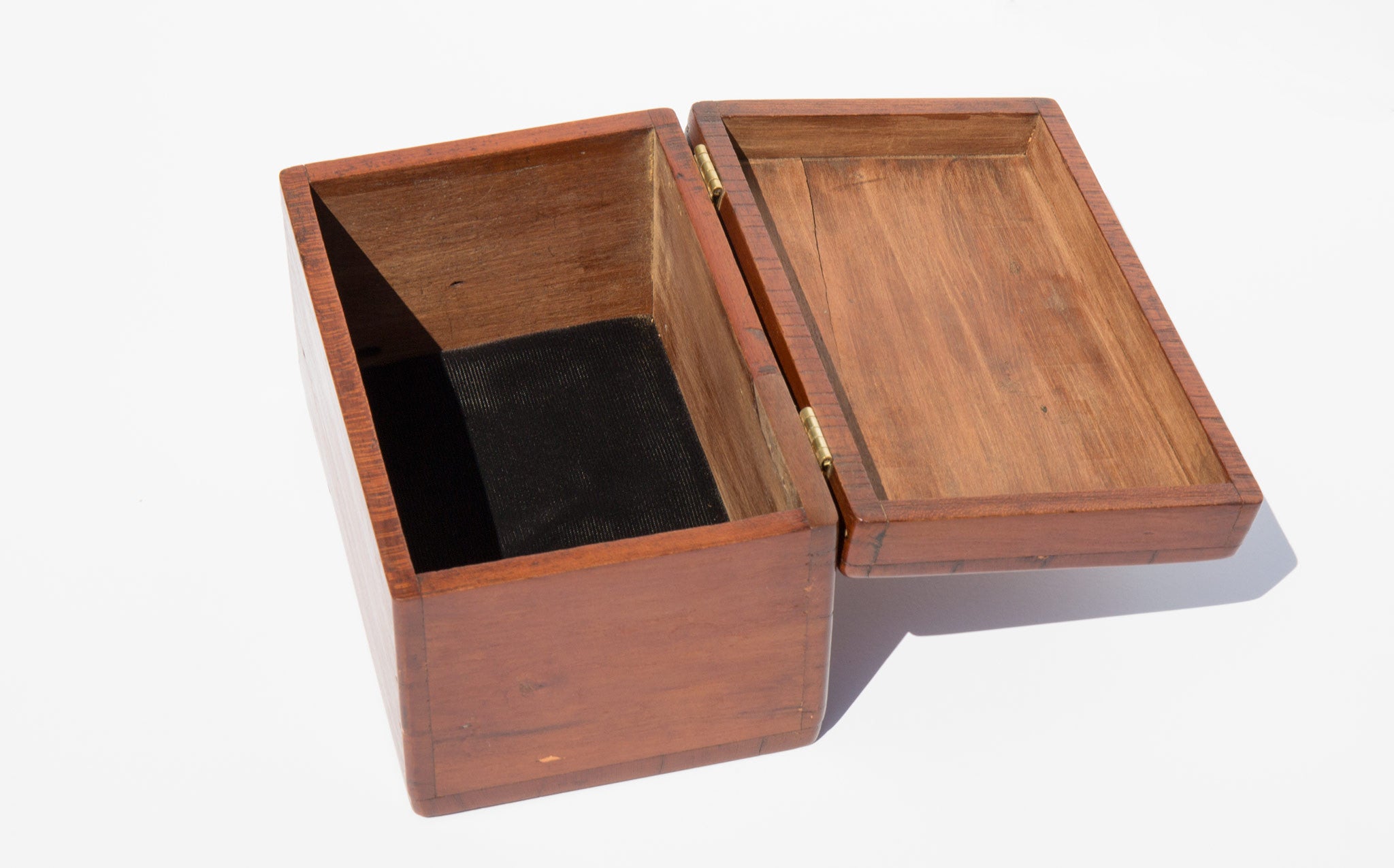 Solid cherry wood secrets box, hand restored in Pennsylvania. The box was originally handmade in the 1930s and restored with brass hinges and black velvet lining.
