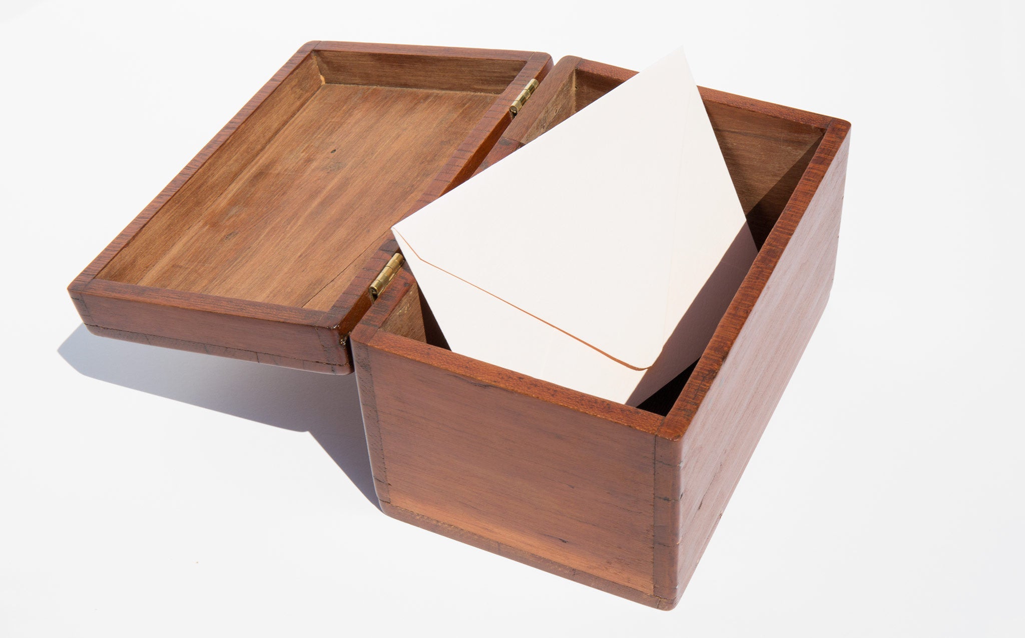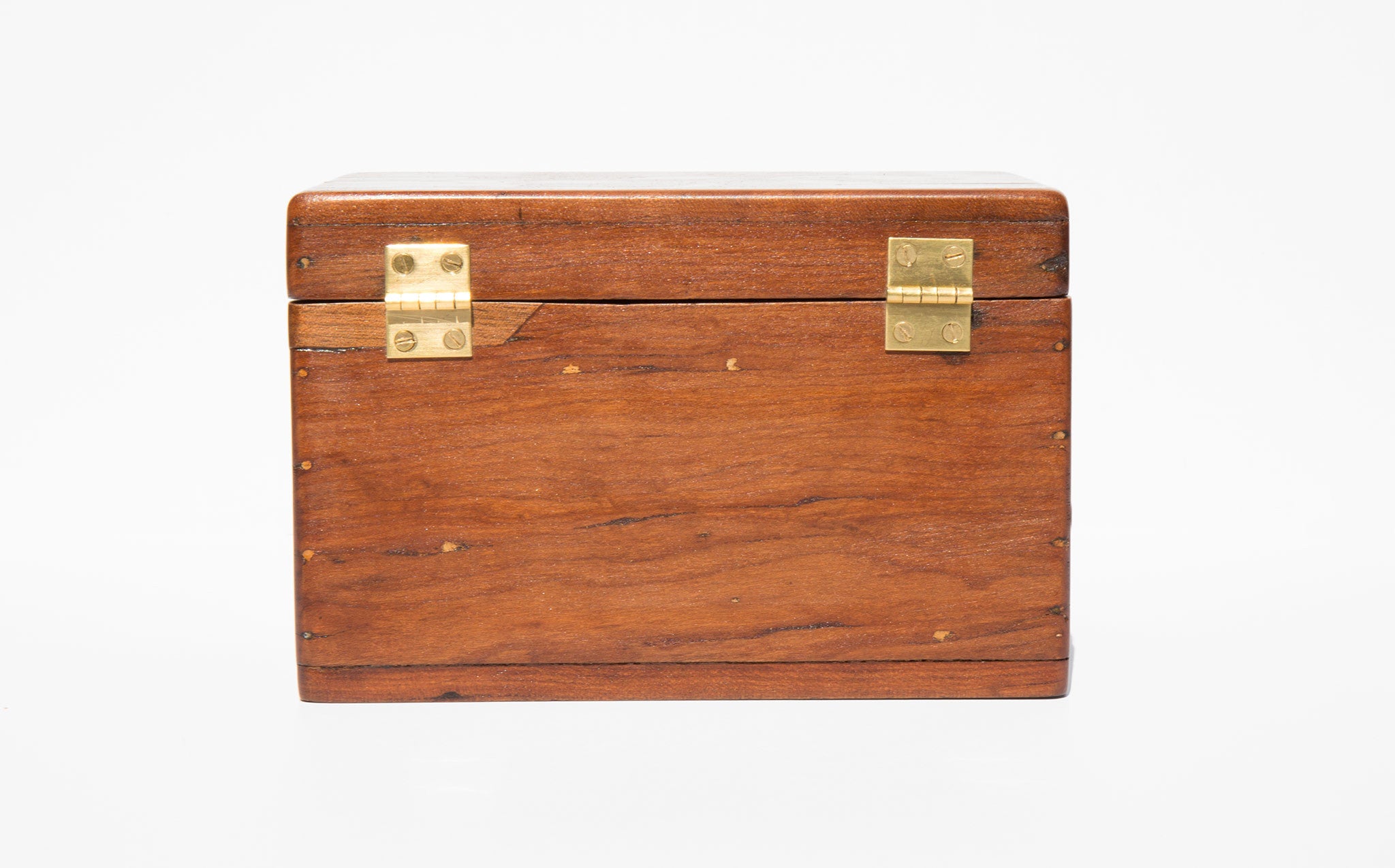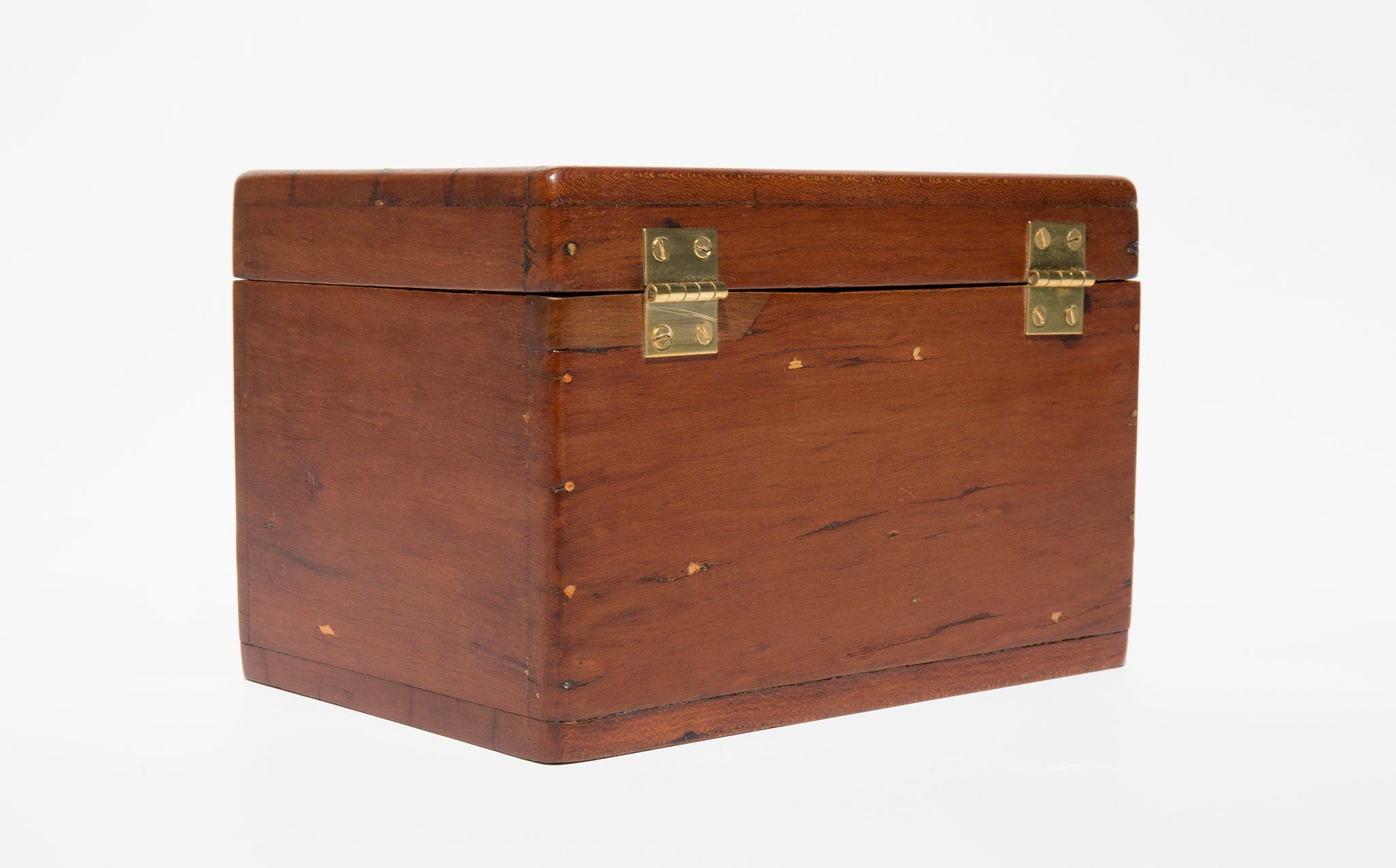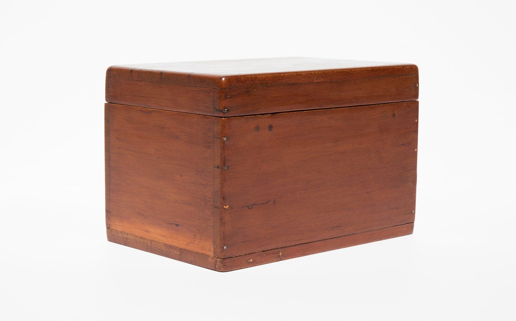 Solid cherry wood secrets box, hand restored in Pennsylvania. The box was originally handmade in the 1930s and restored with brass hinges and black velvet lining.