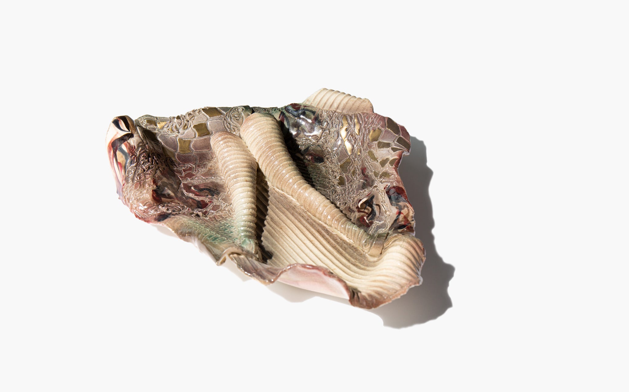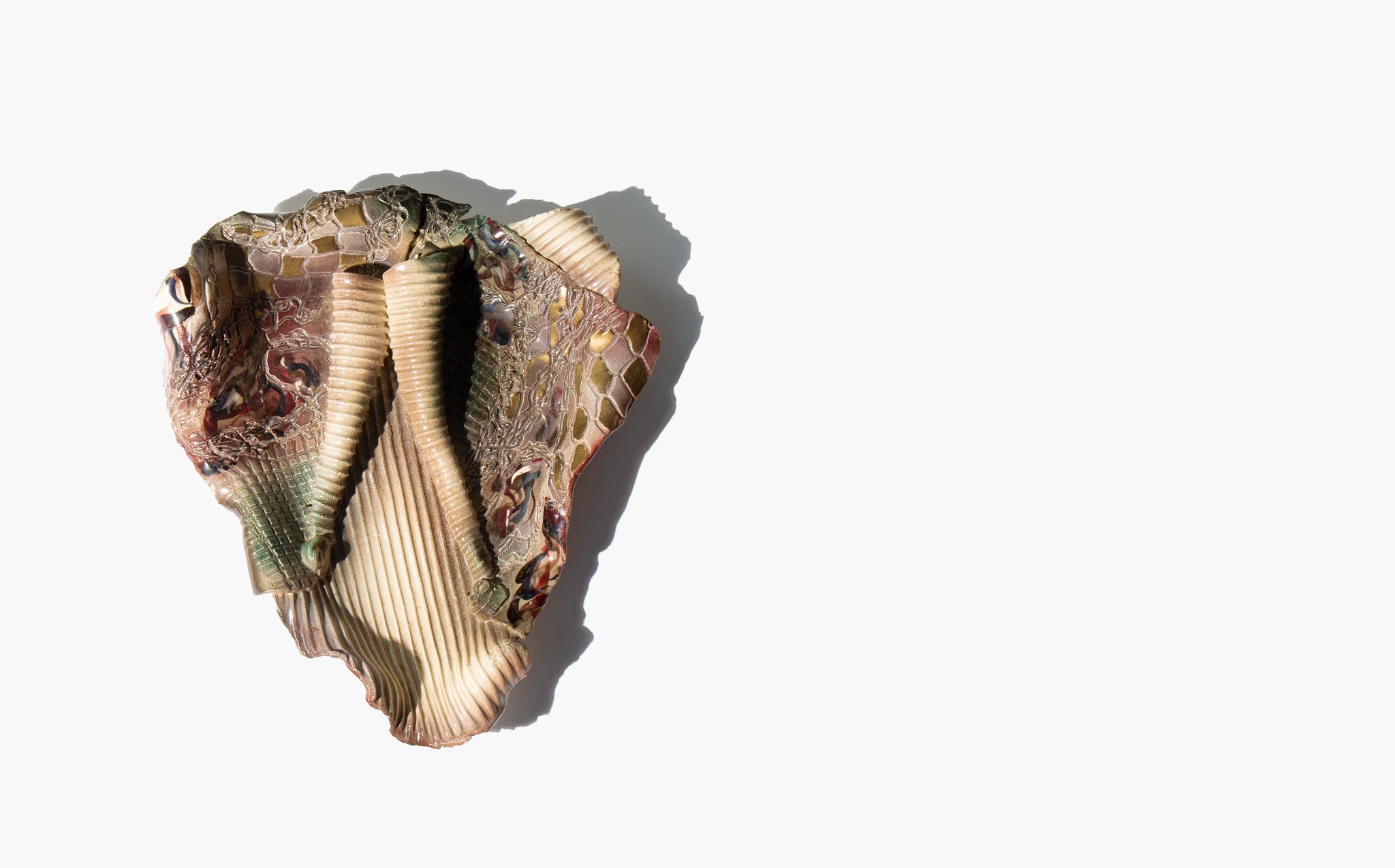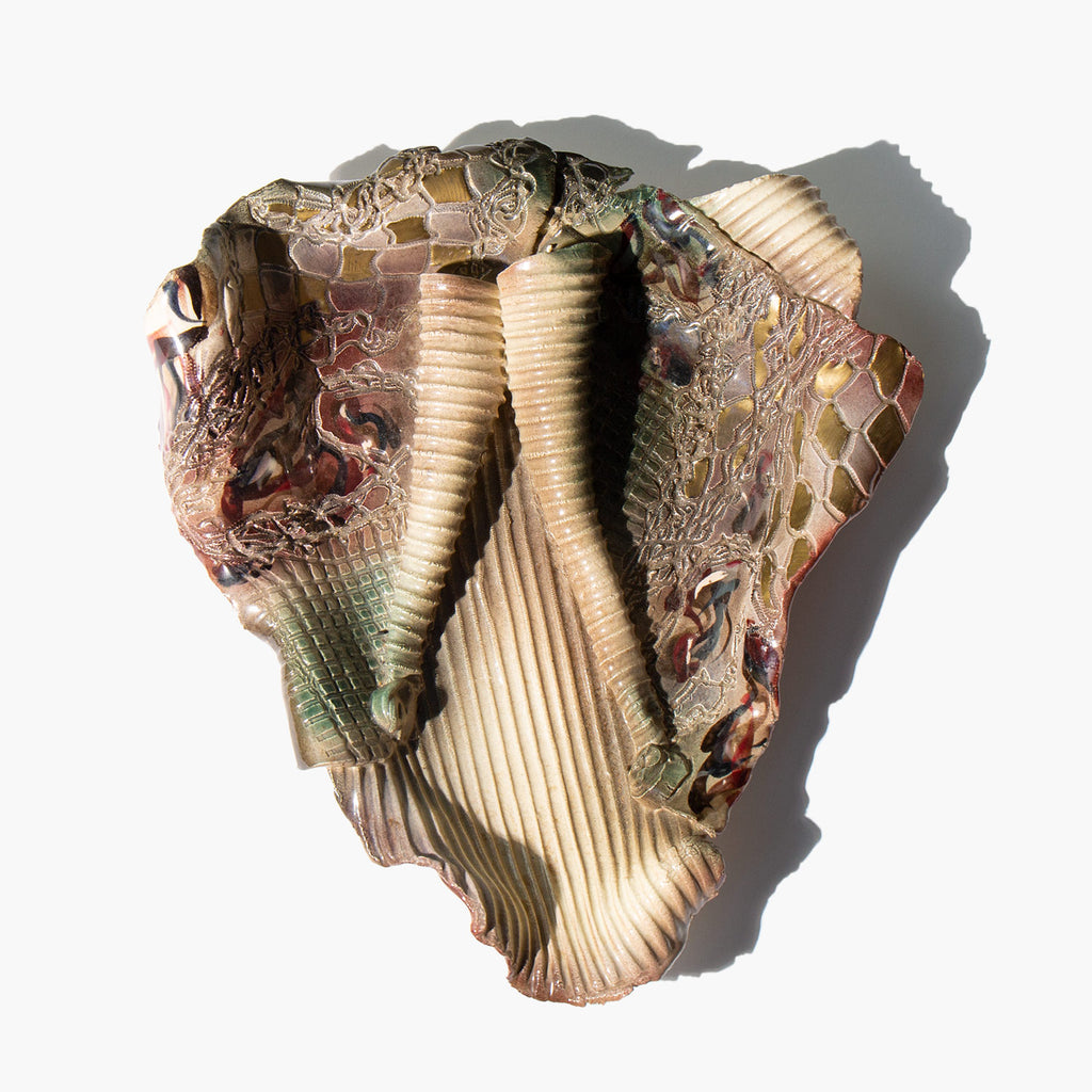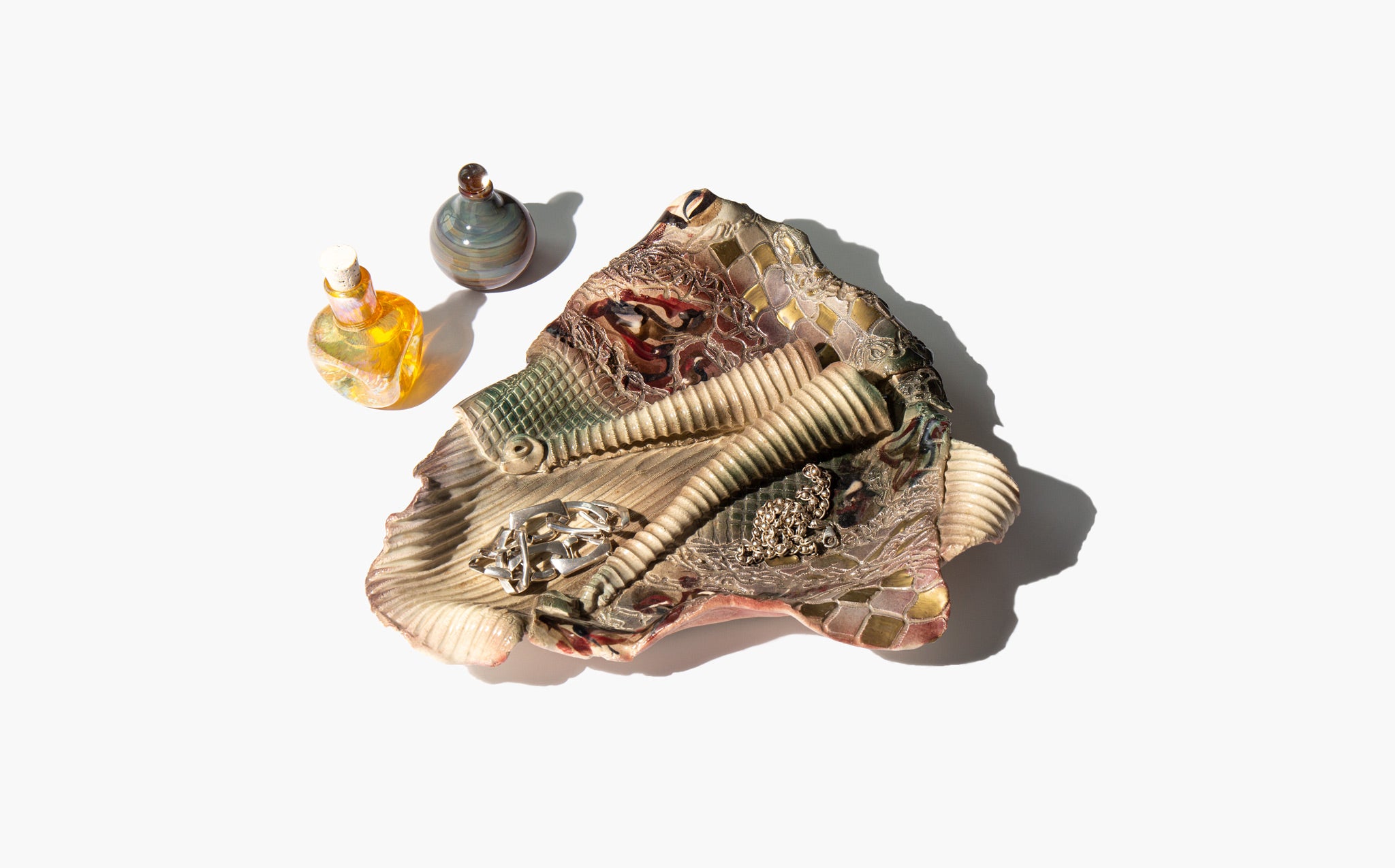 Artist's hand-sculpted, hand-painted tray blends textures, colors, and tones to create an object that is visually fascinating.