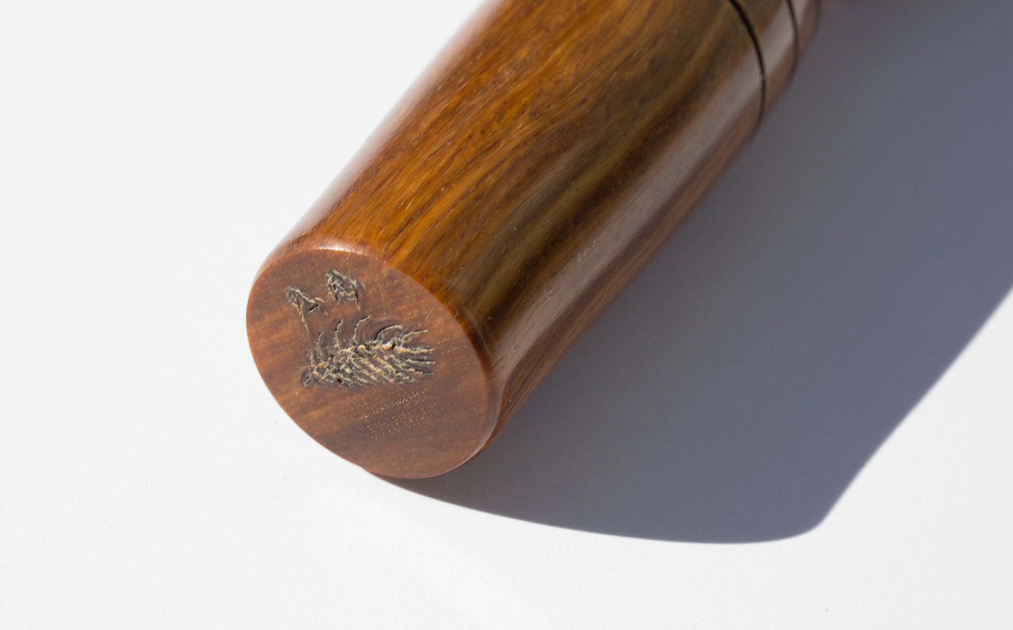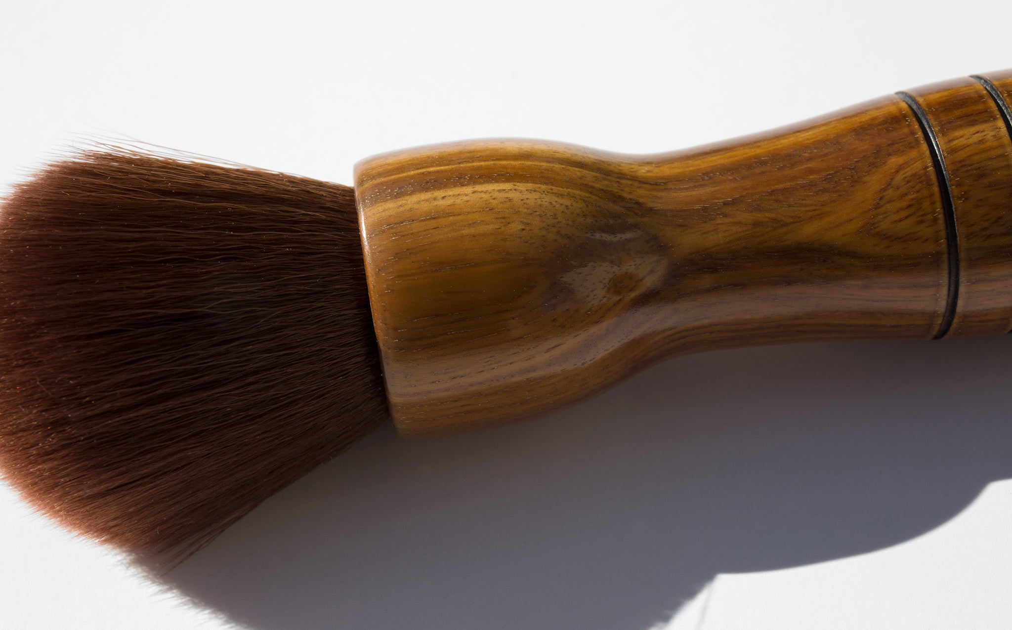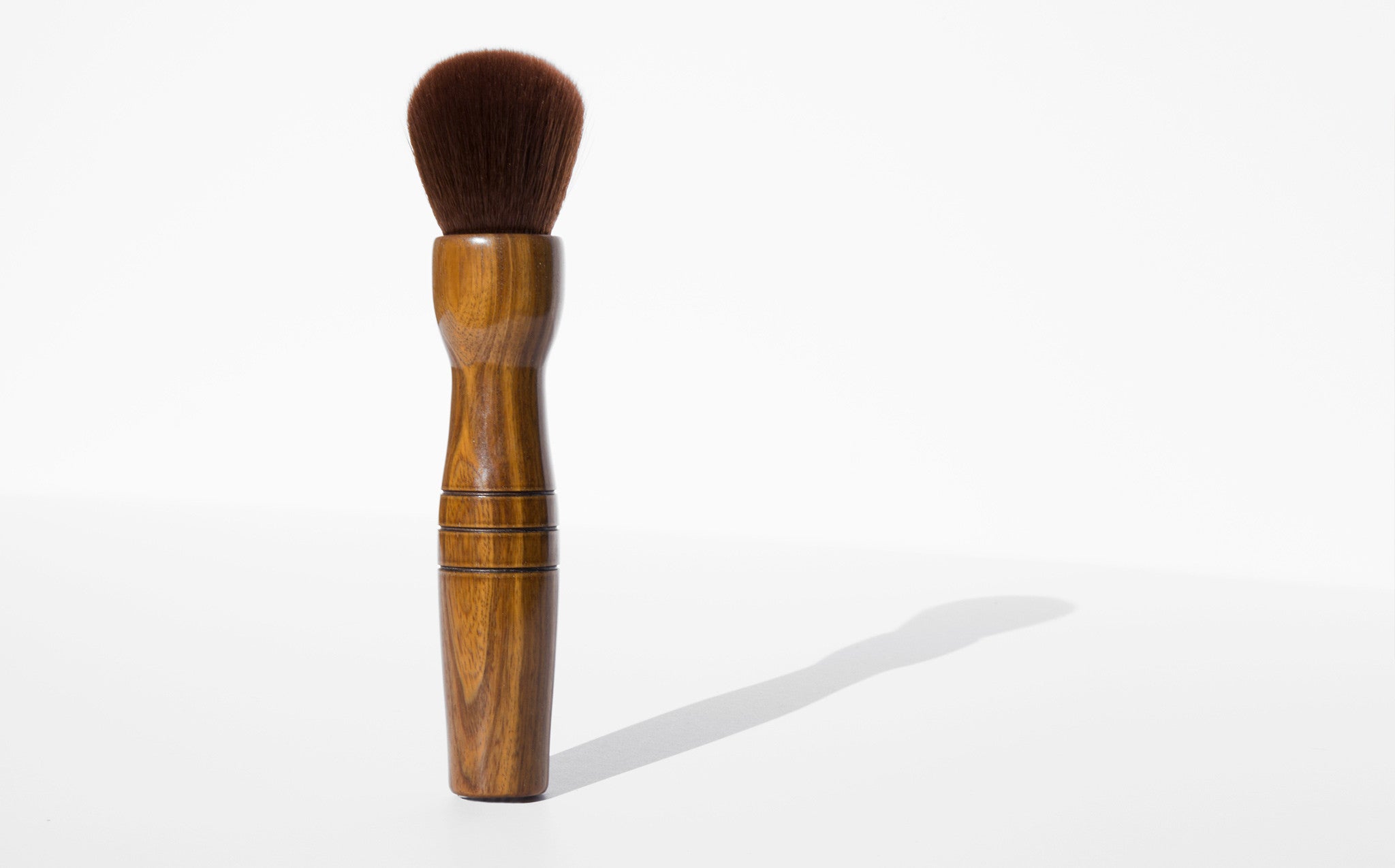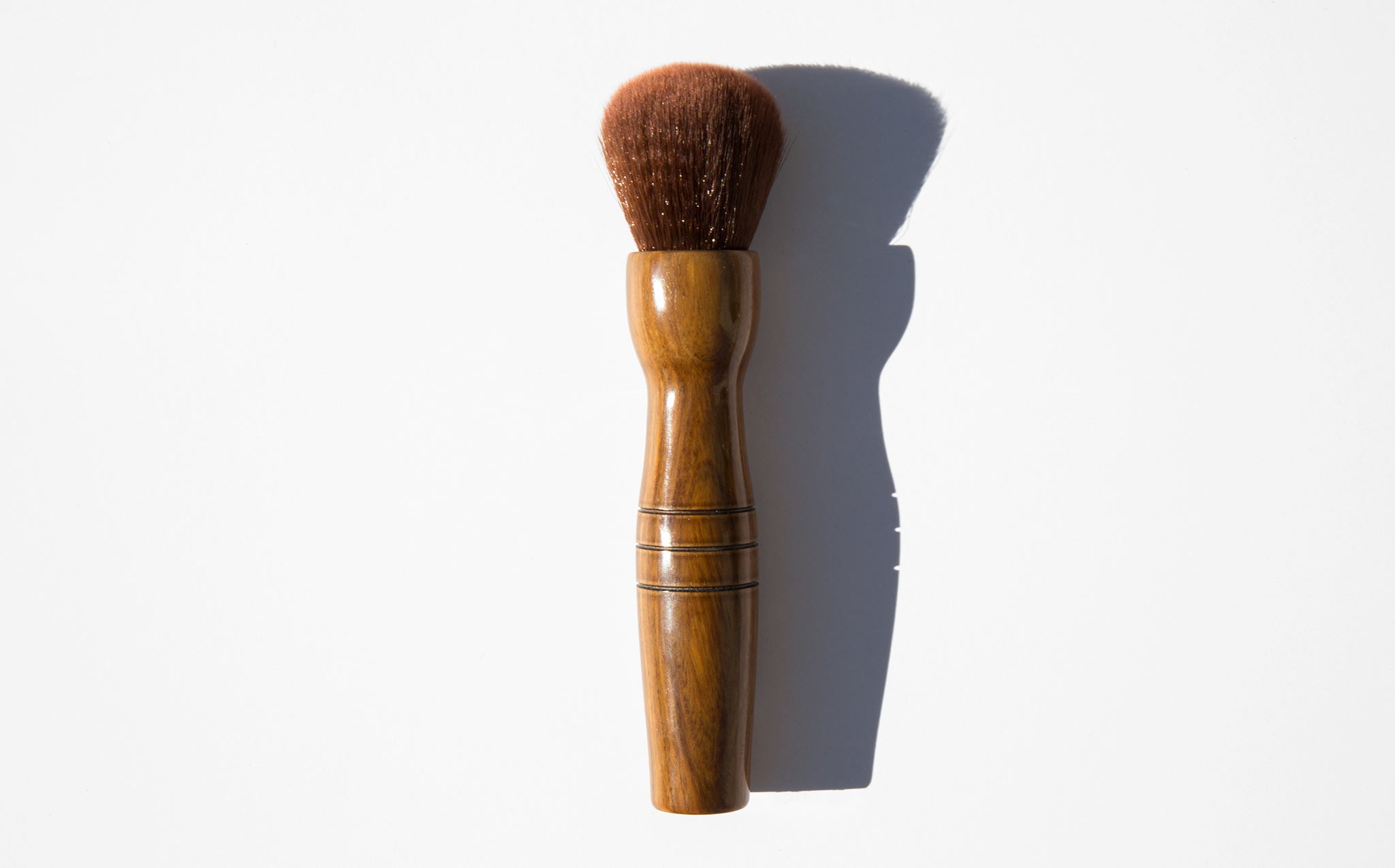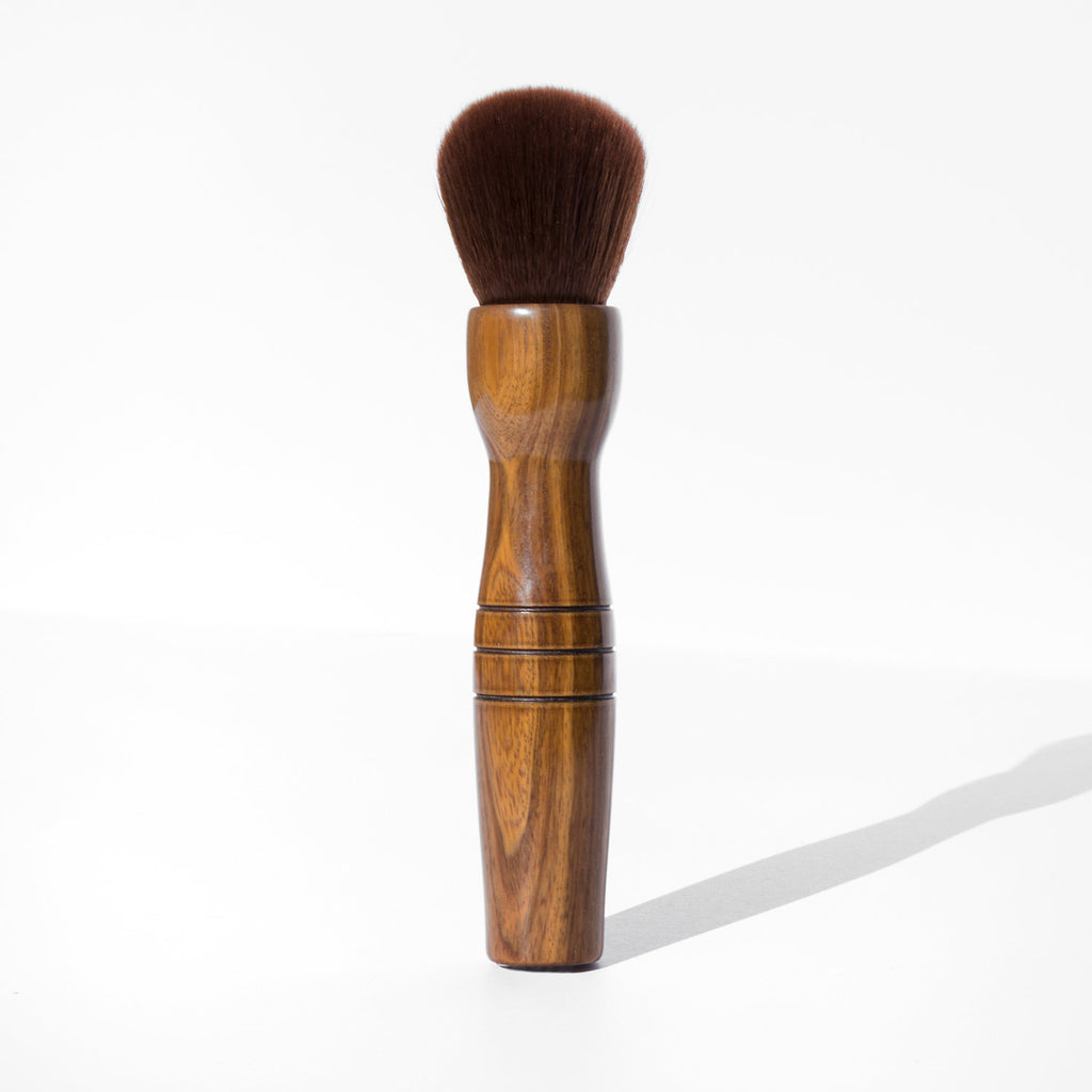 Powder and blush application brush, hand turned in CT from a solid piece of the hardwood lignum vitae, known as the “wood of life” in Latin because of its medicinal properties, and feather light and soft, animal friendly synthetic bristles. Made exclusively for Kindred Black.