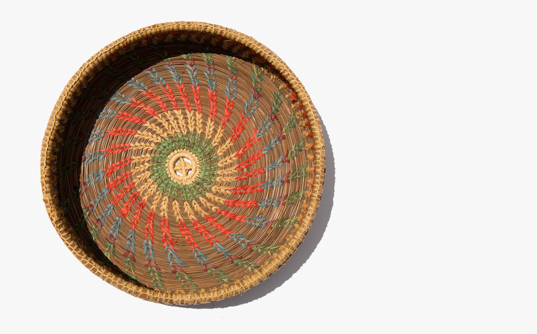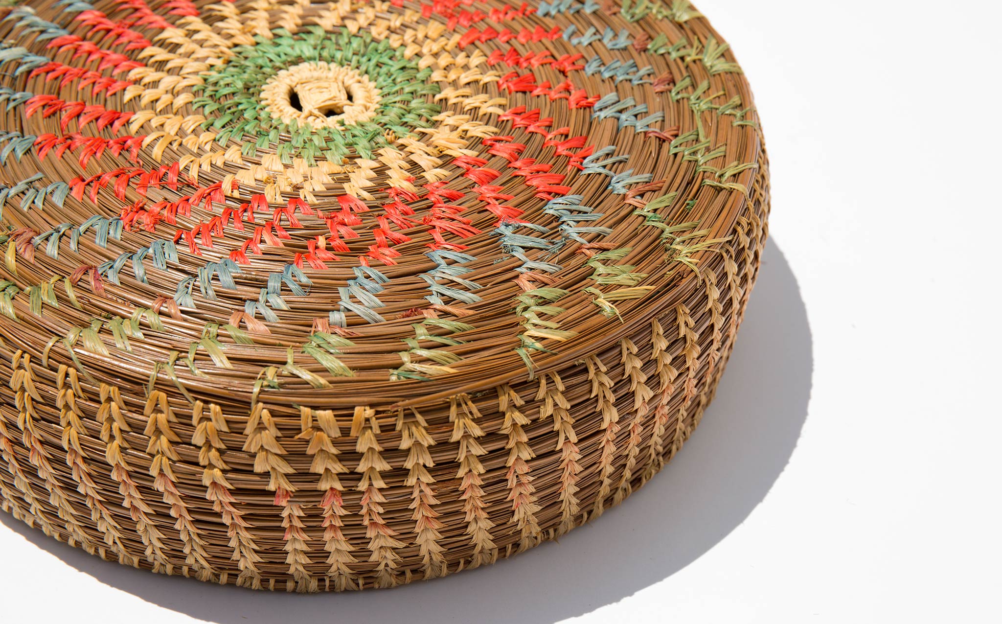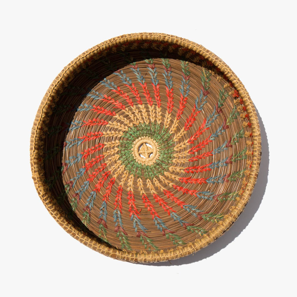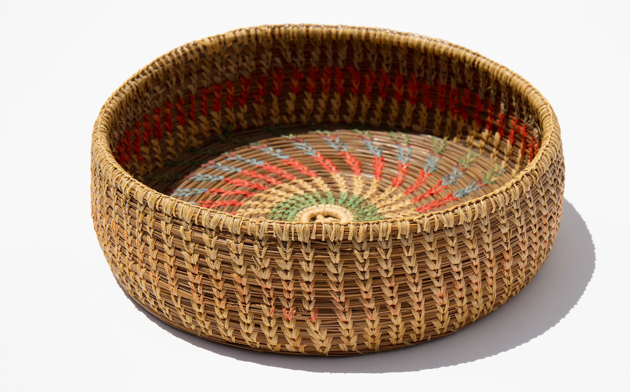 Hand woven pine needle trinket, fruit, or kitchen basket with bright pops of crimson, sage, periwinkle, and wheat raffia.