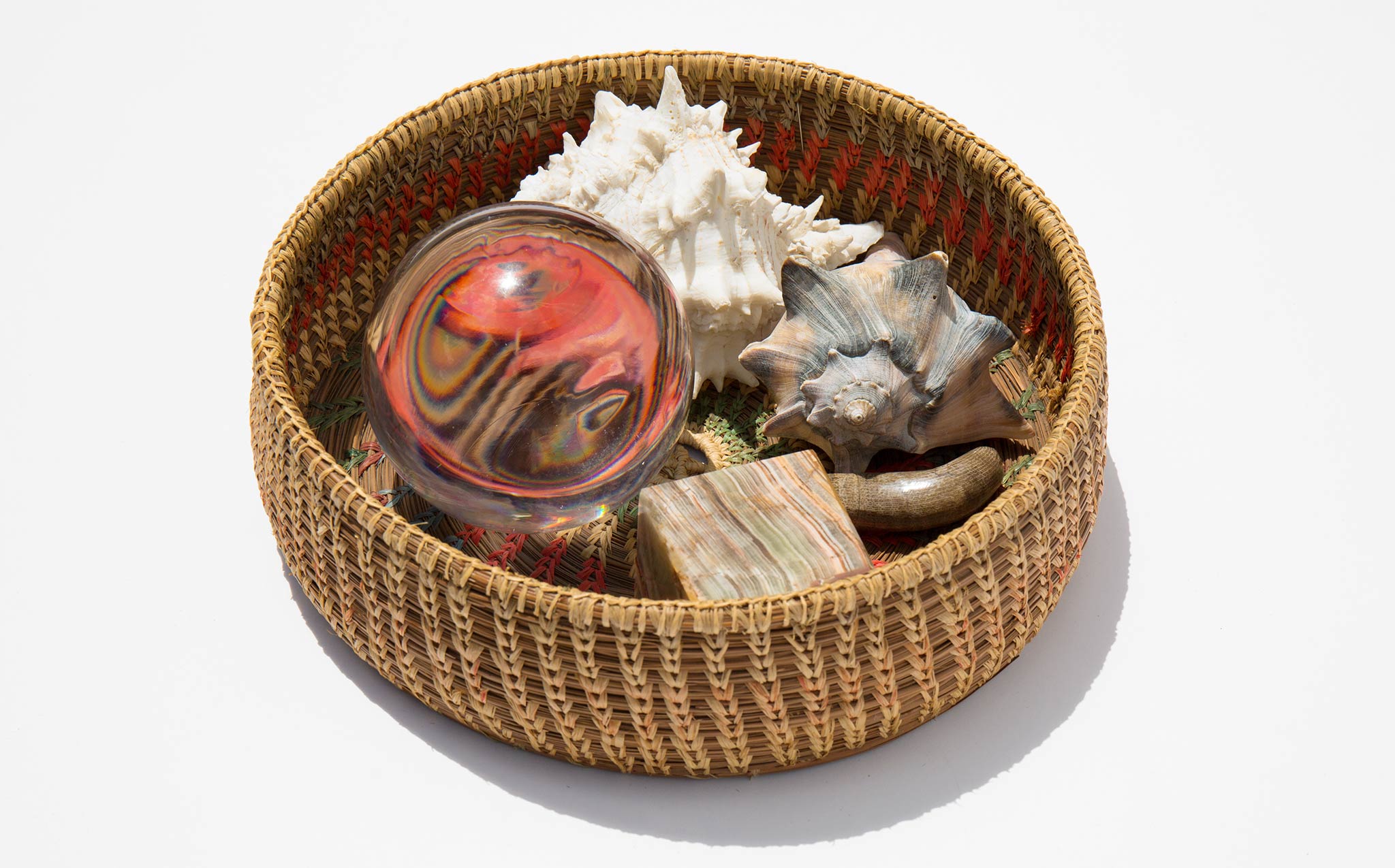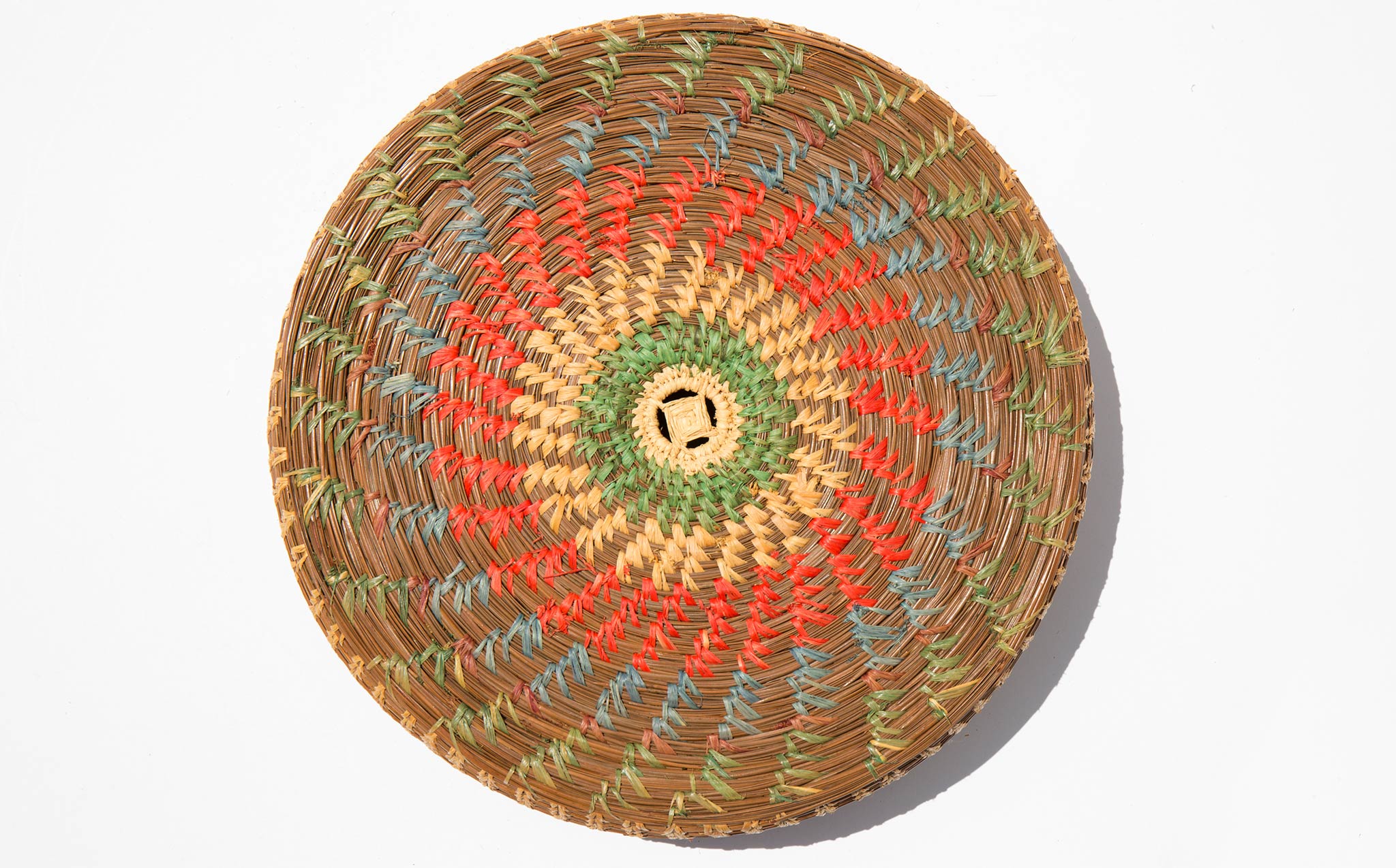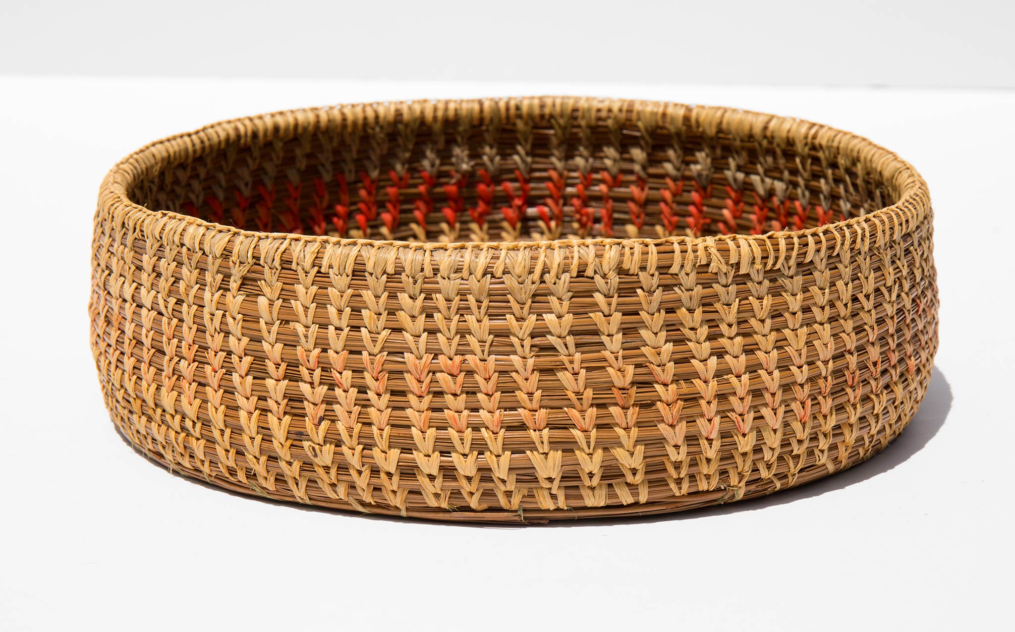 Hand woven pine needle trinket, fruit, or kitchen basket with bright pops of crimson, sage, periwinkle, and wheat raffia.