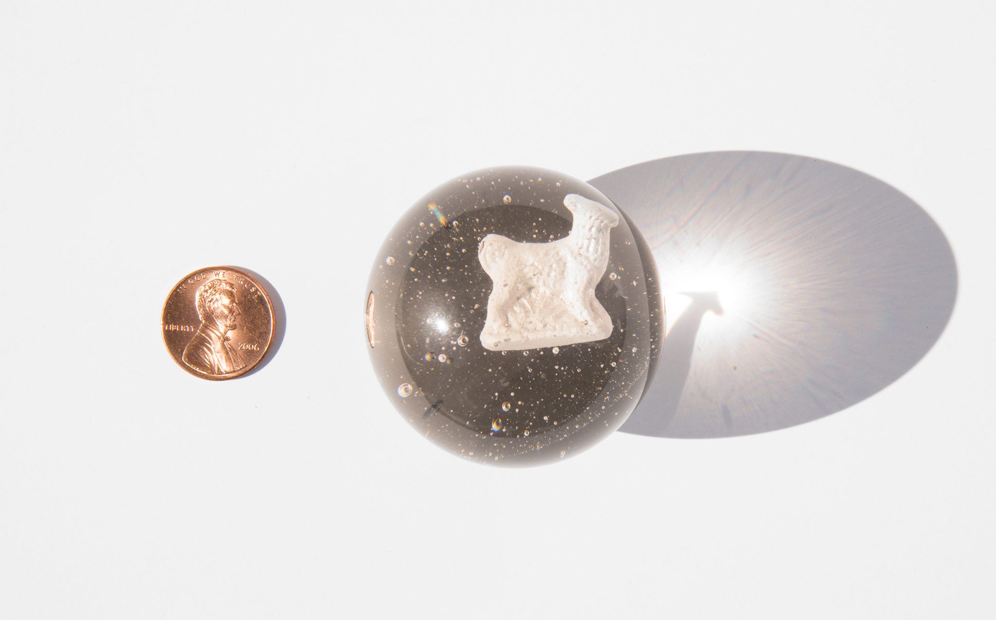 Handblown late nineteenth century sulphide marble made in Germany. Decorative white clay sheep figurine set in handblown glass. Sulphide marbles were meant to be played with, and this marble was no exception. Chips from past use have been polished out.