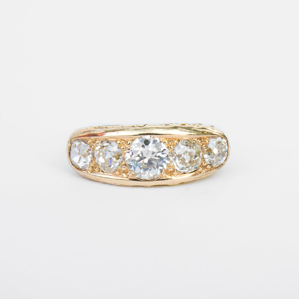 Early Edwardian era ring with five near colorless, old mine cut diamonds in a handmade 14k gold setting. The diamonds in this rare setting total approximately 2.5 - 3 carats and are exceptionally high quality.