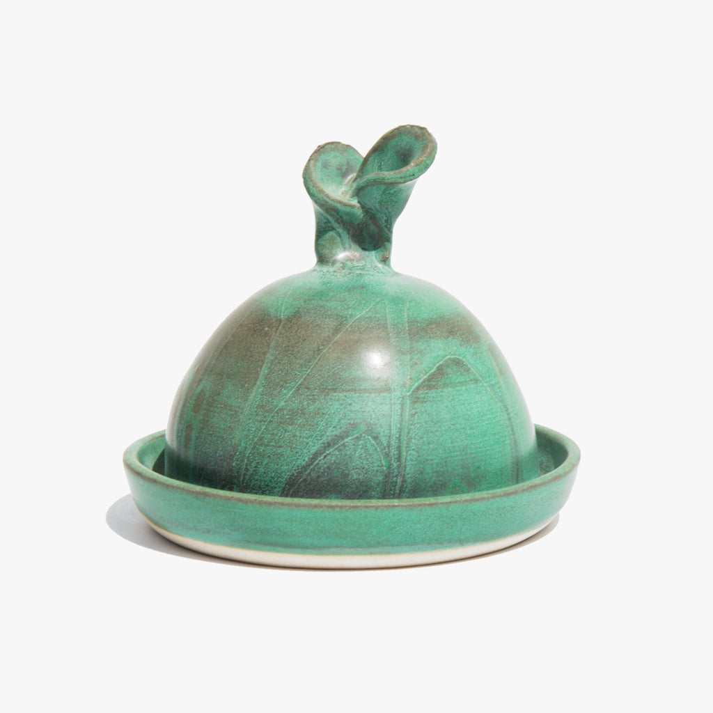Covered pottery butter or cheese dish with a pale teal blue and chestnut finish.
