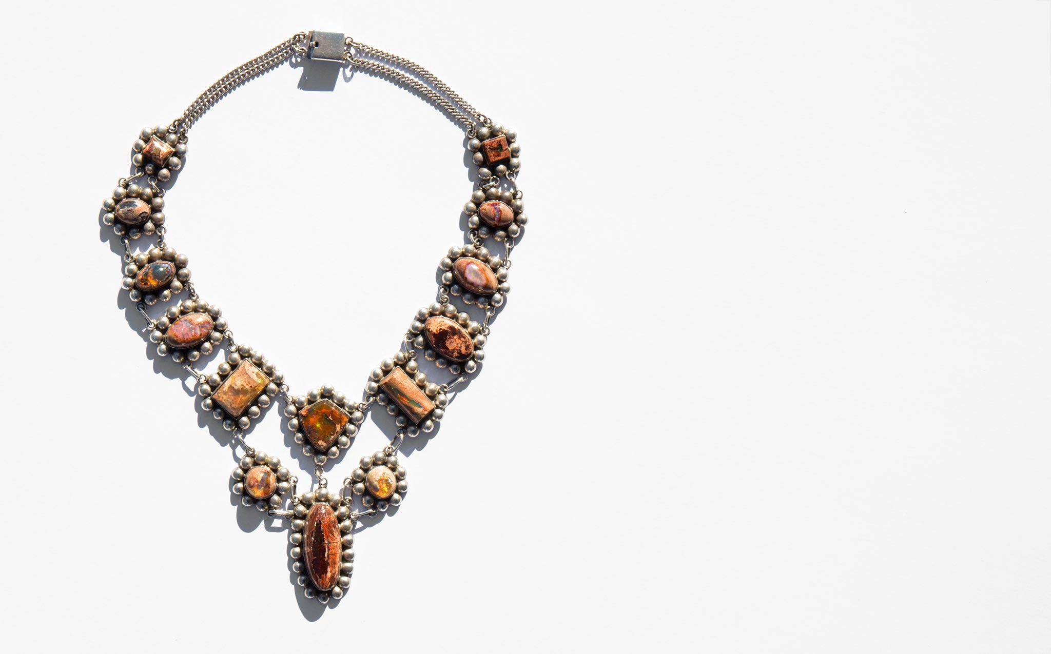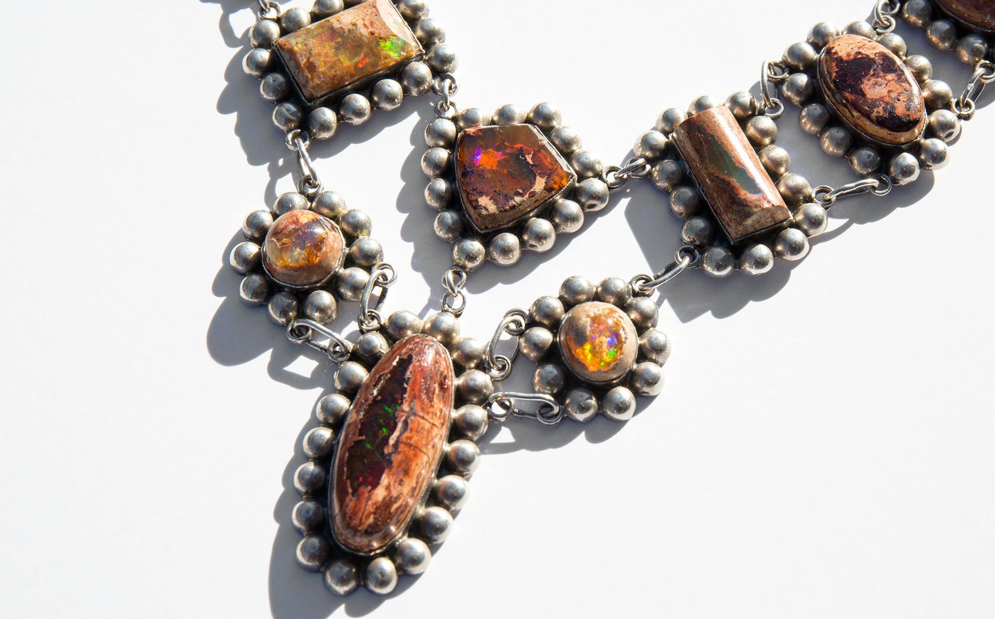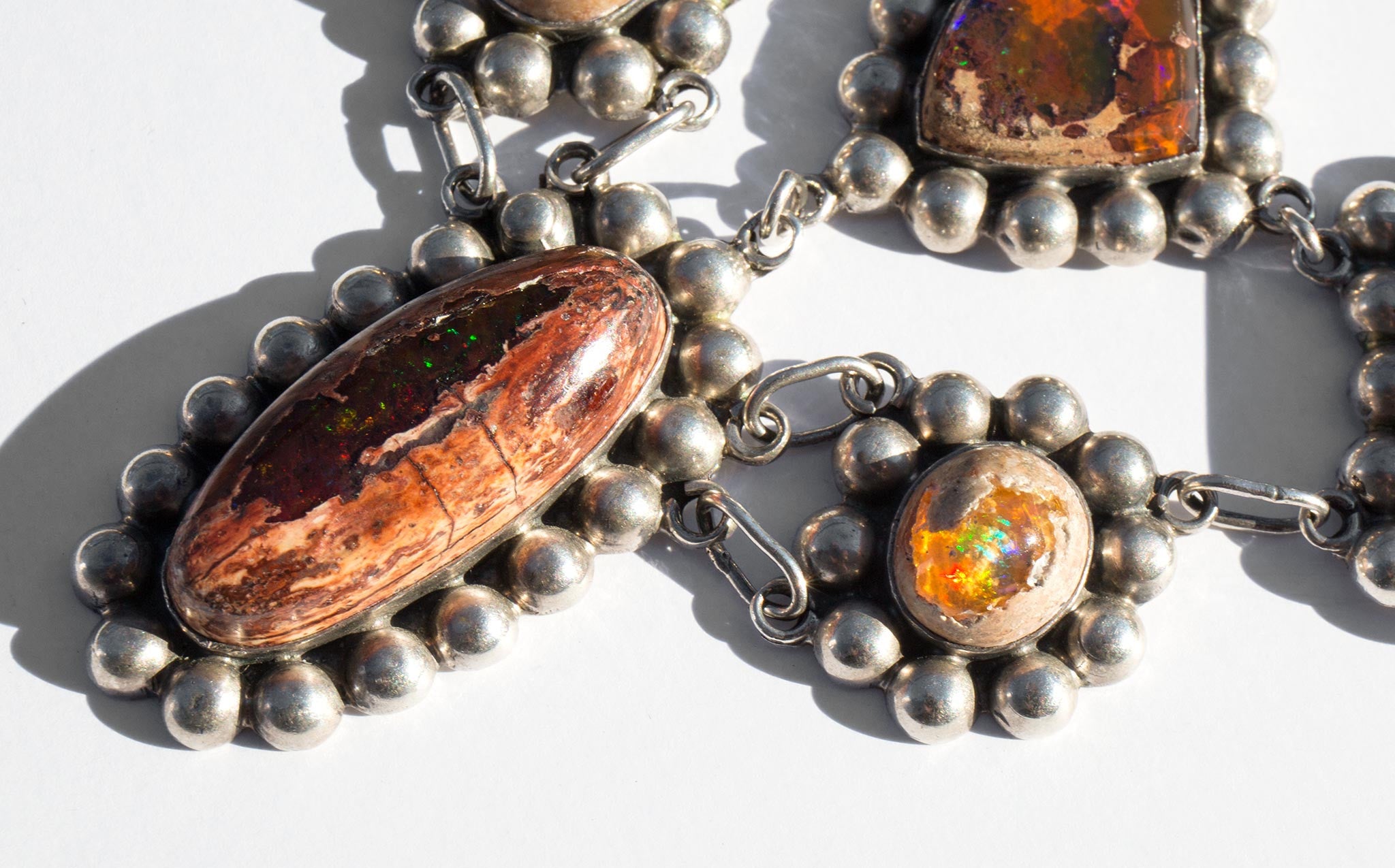 WW1 era sterling silver necklace with hand cut fire agate stones, crafted in Taxco, Mexico. With its deep flashes of orange, red, pink and gold, fire agate was historically thought to contain the essence of fire and believed as such to have the power to stir passions, awaken sexuality, and resurrect one's deepest desires.