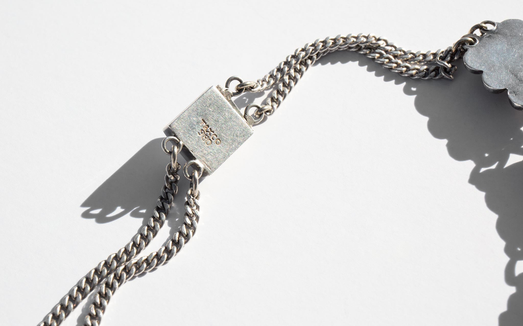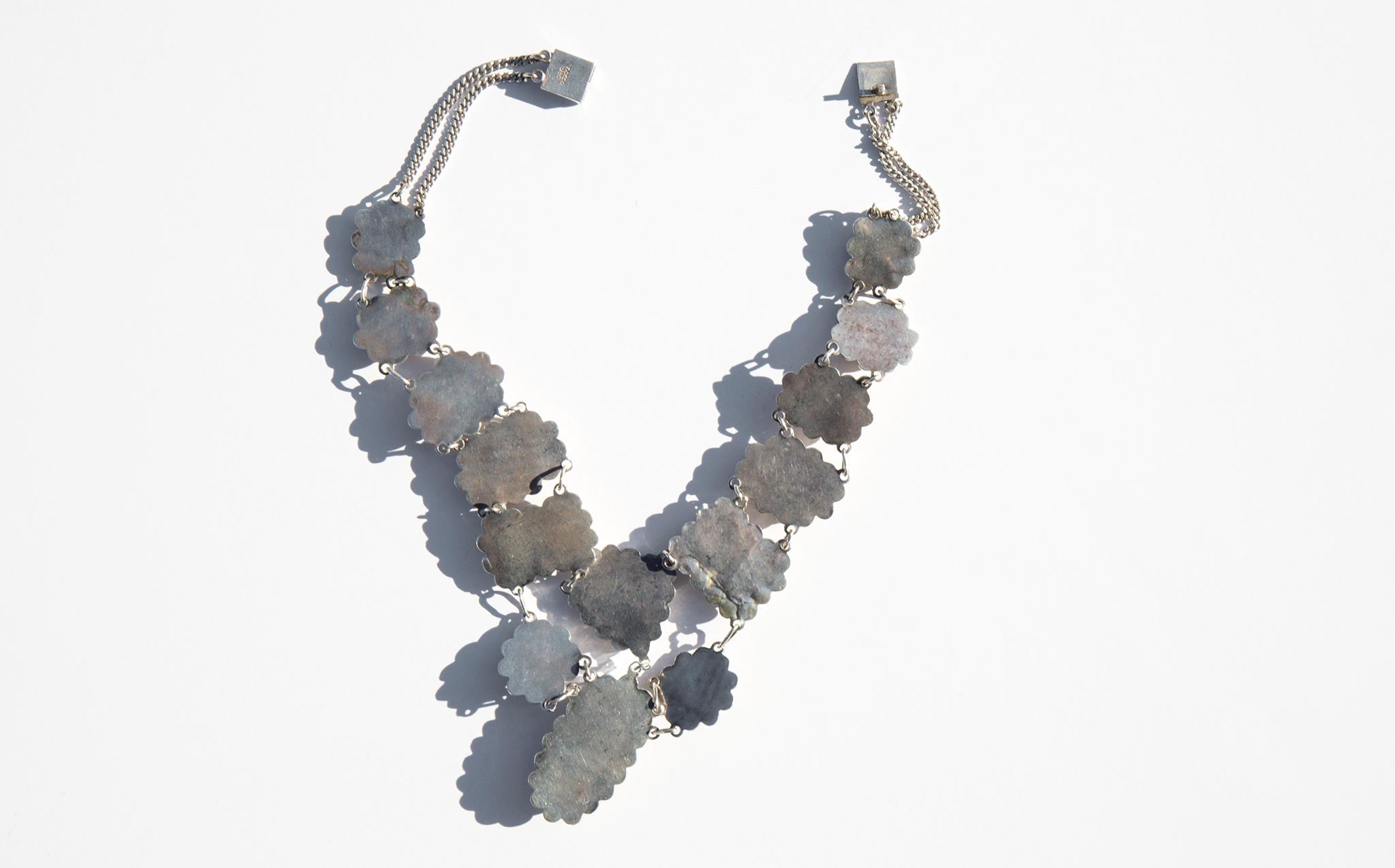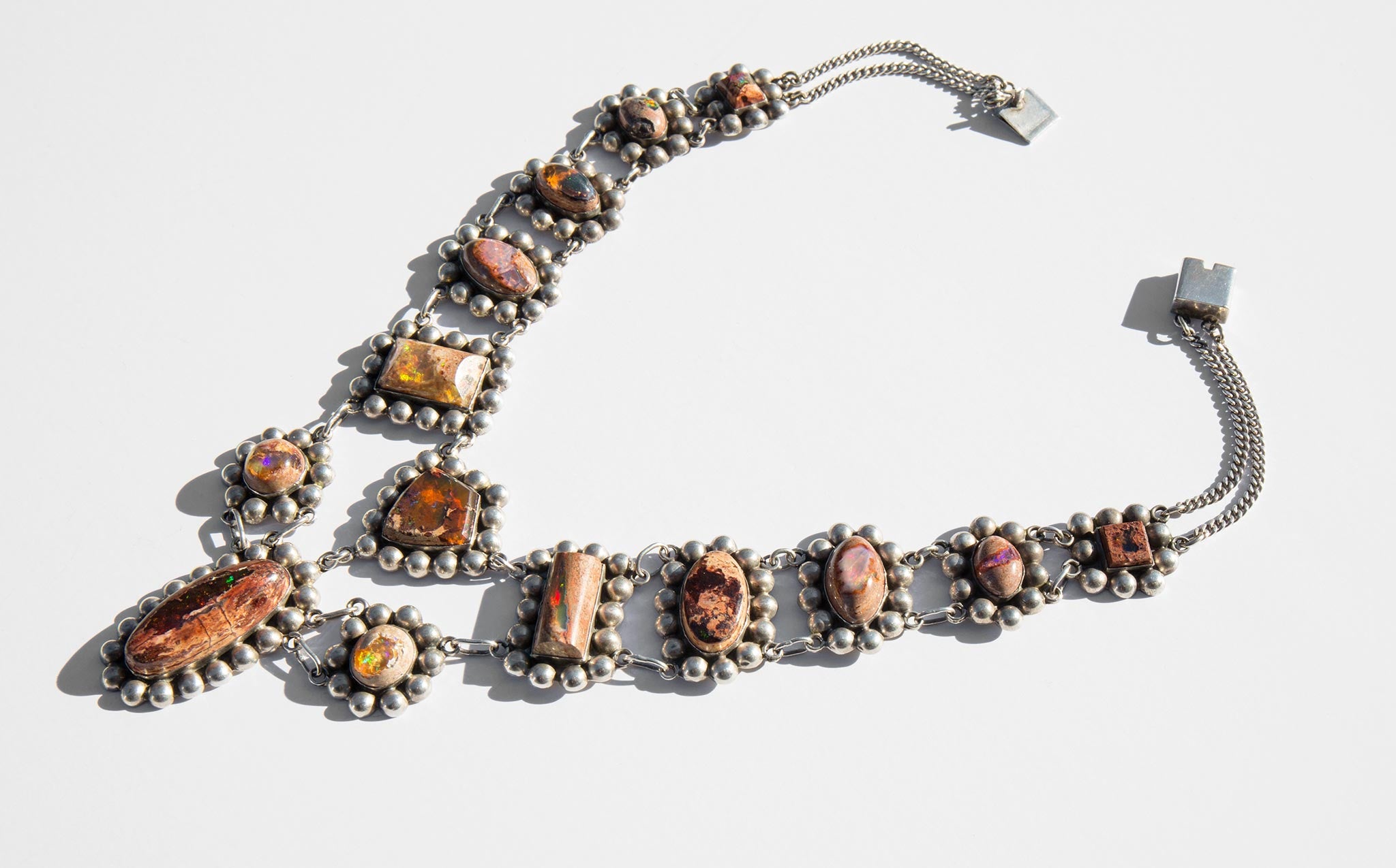 WW1 era sterling silver necklace with hand cut fire agate stones, crafted in Taxco, Mexico. With its deep flashes of orange, red, pink and gold, fire agate was historically thought to contain the essence of fire and believed as such to have the power to stir passions, awaken sexuality, and resurrect one's deepest desires.