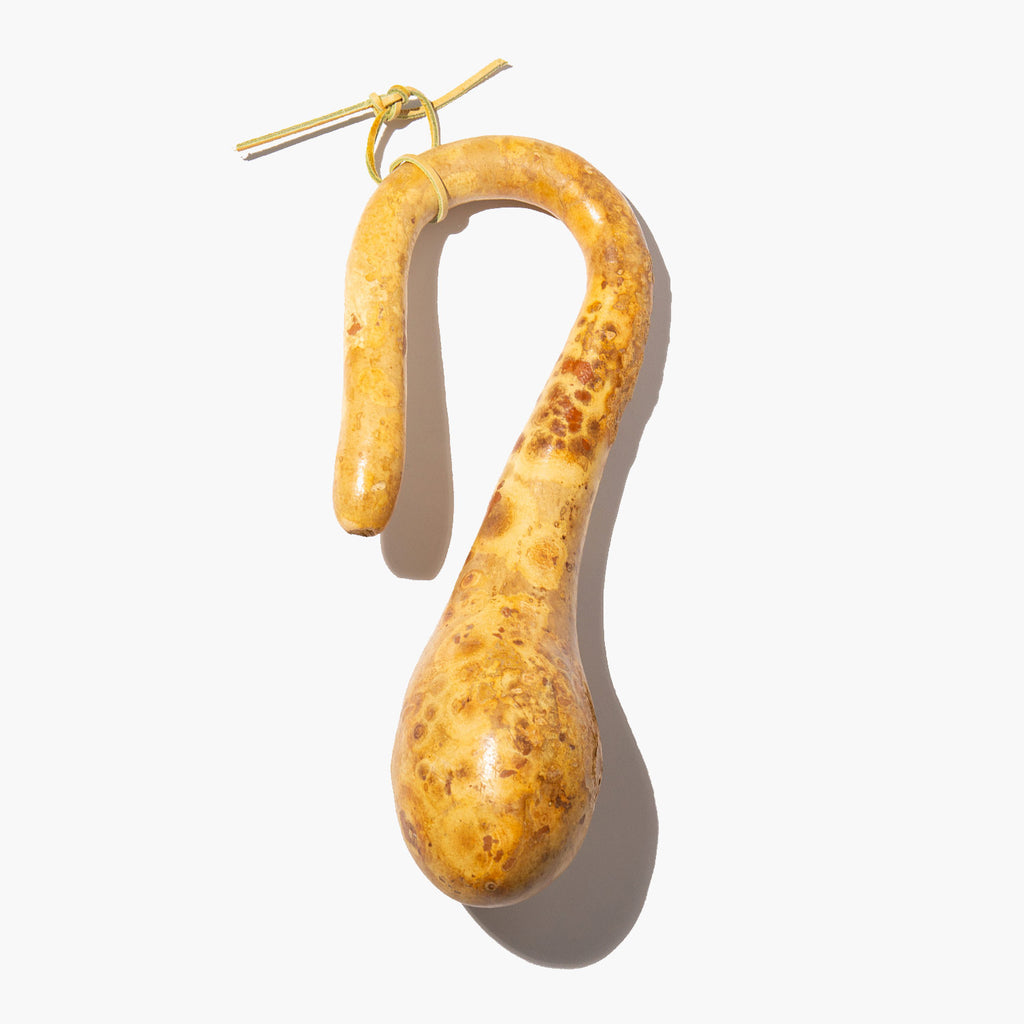 Irregularly shaped gourd with leather cord for hanging. The folk symbolism of a gourd is that of abundance and prosperity.