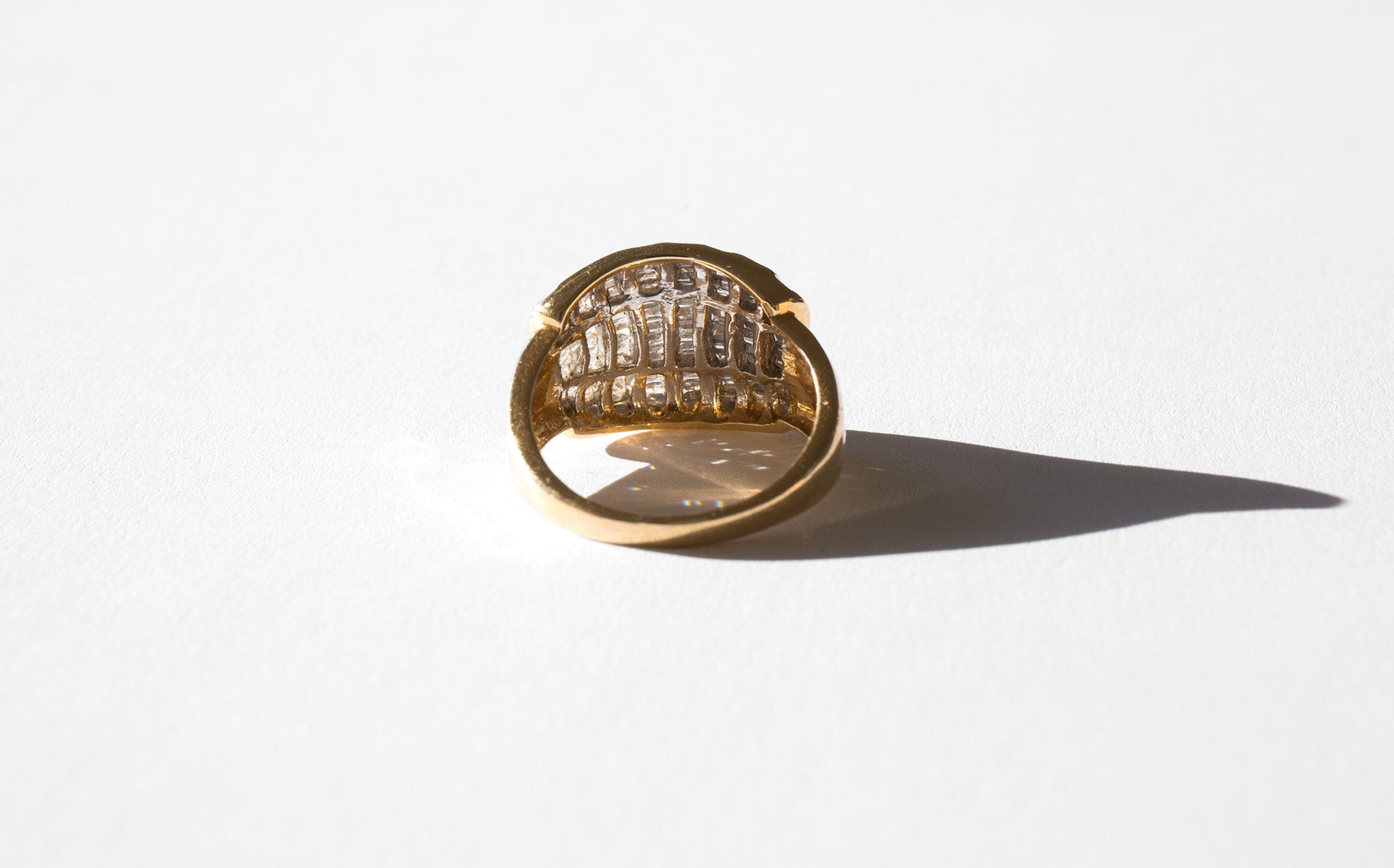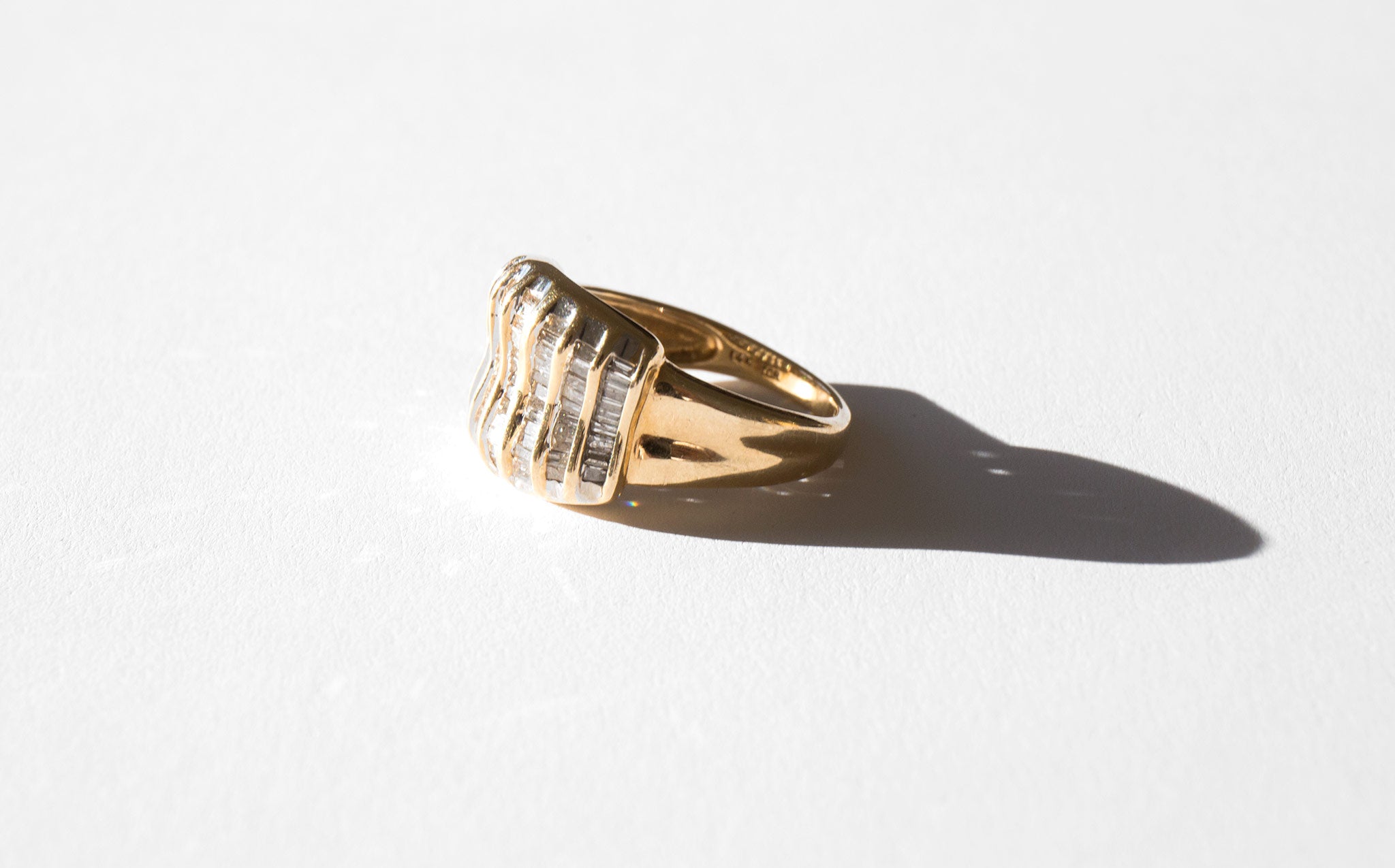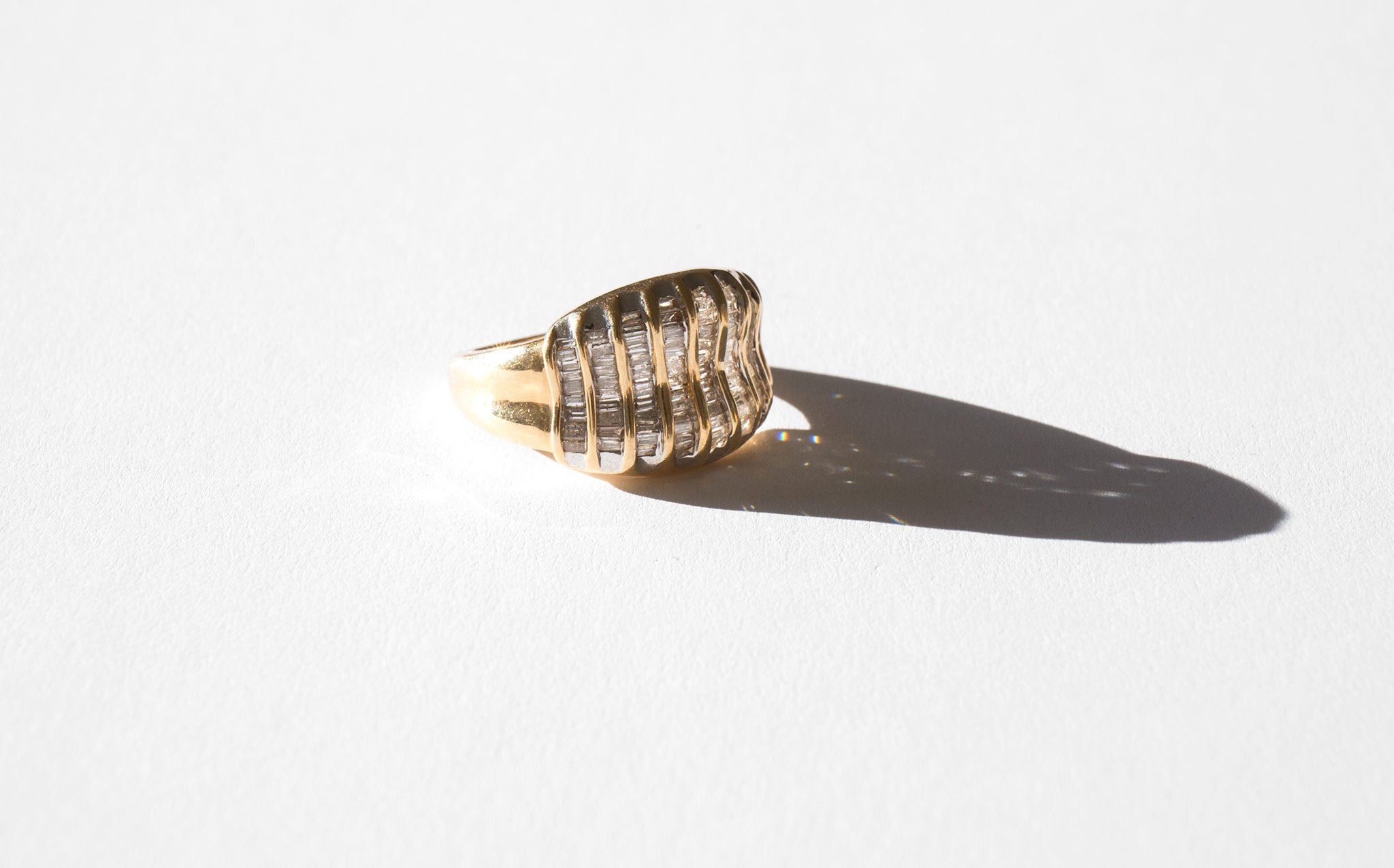 A starburst of small rectangular diamonds set in 14k gold.