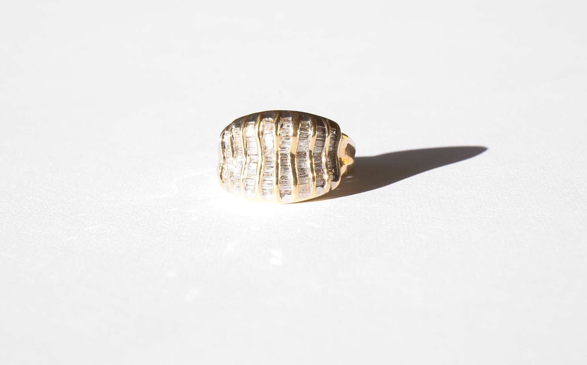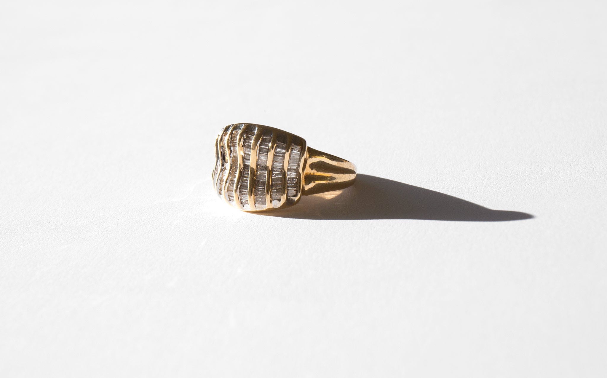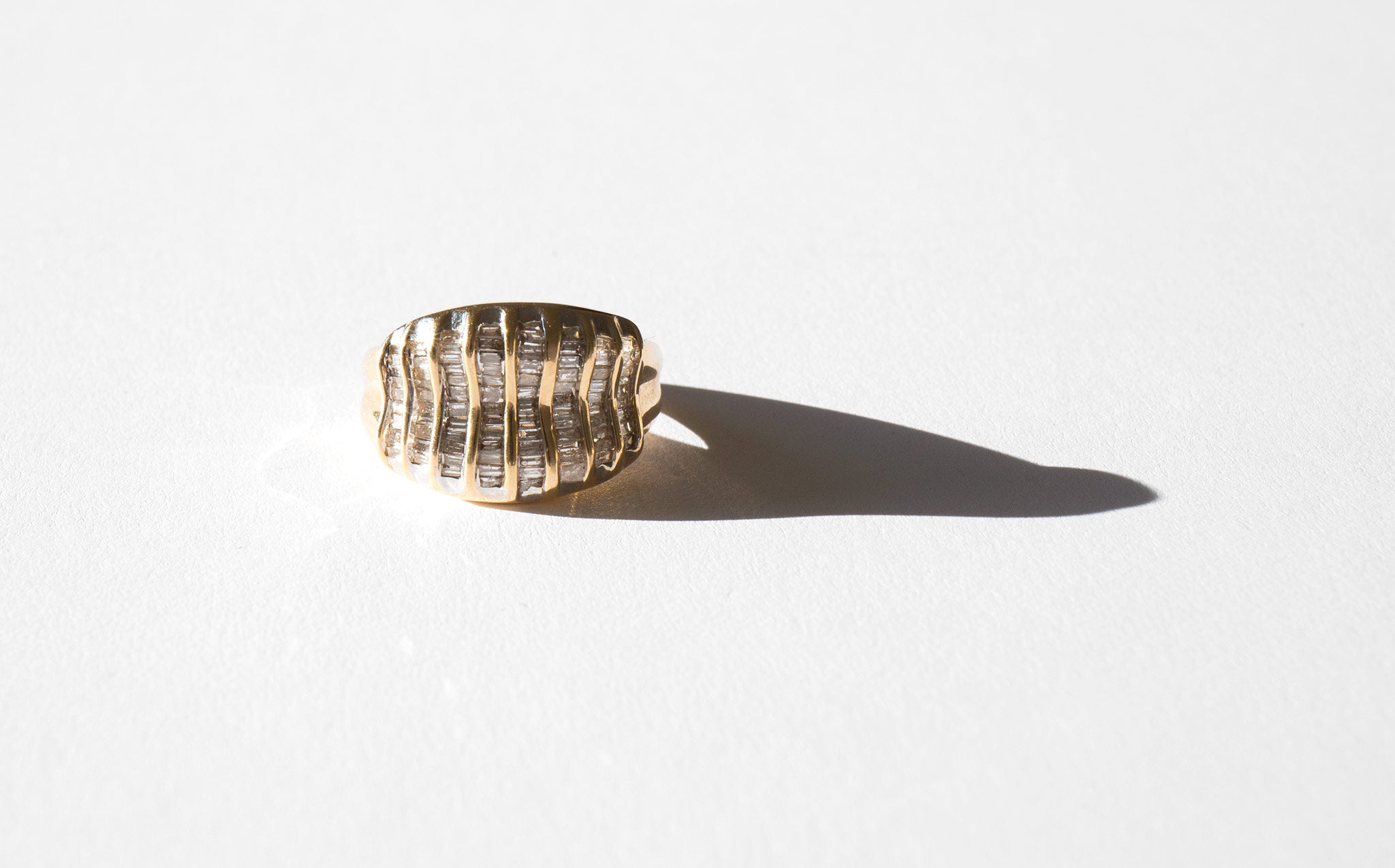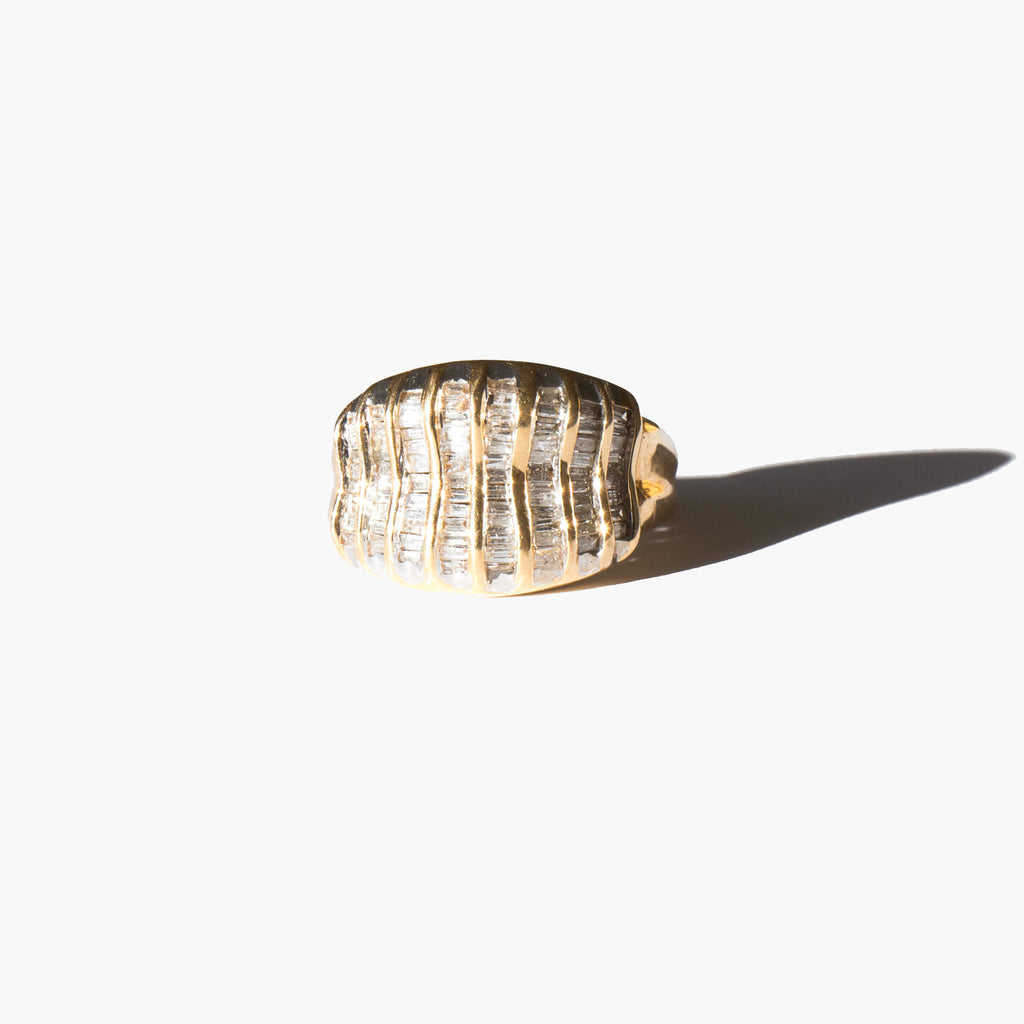 A starburst of small rectangular diamonds set in 14k gold.