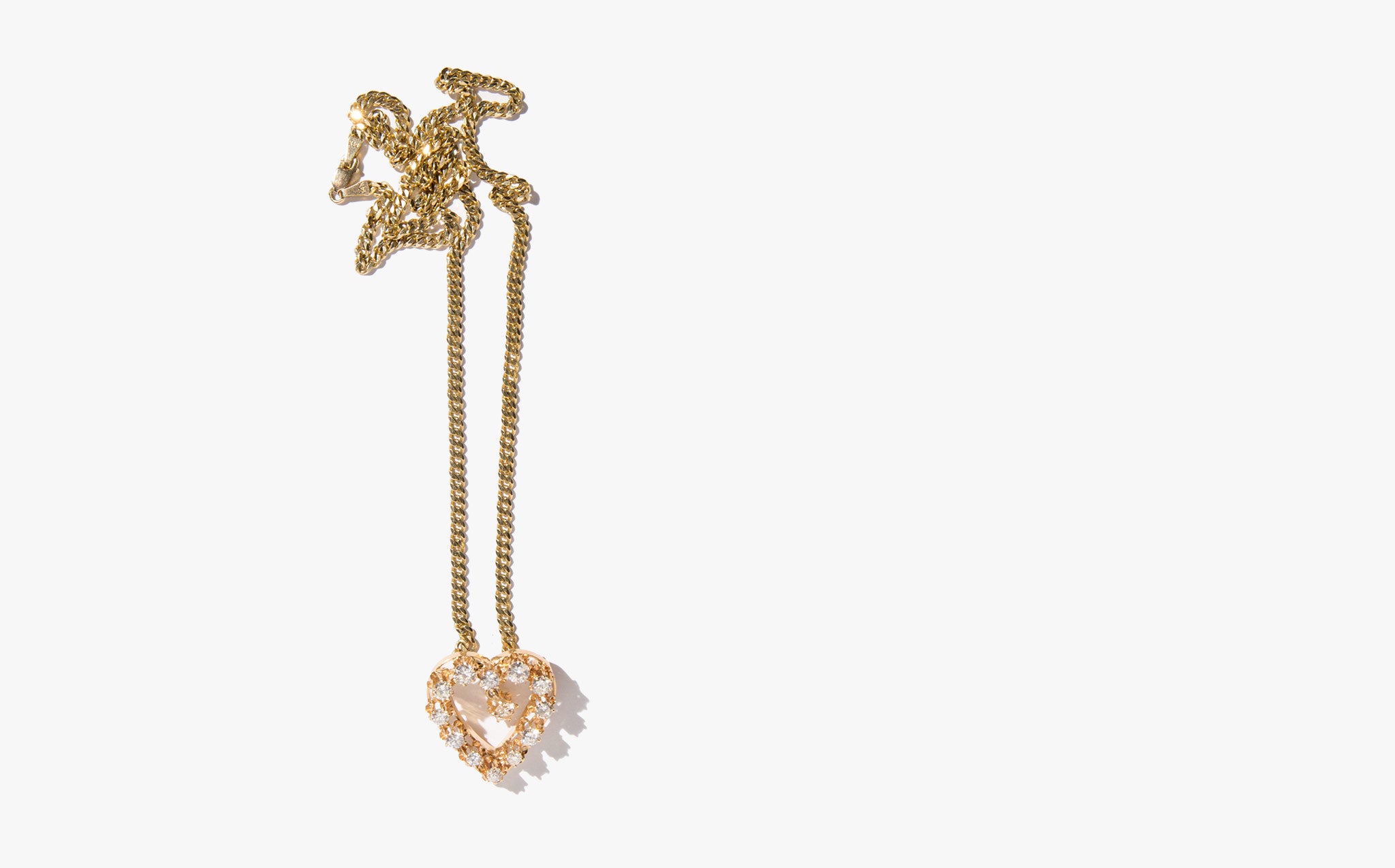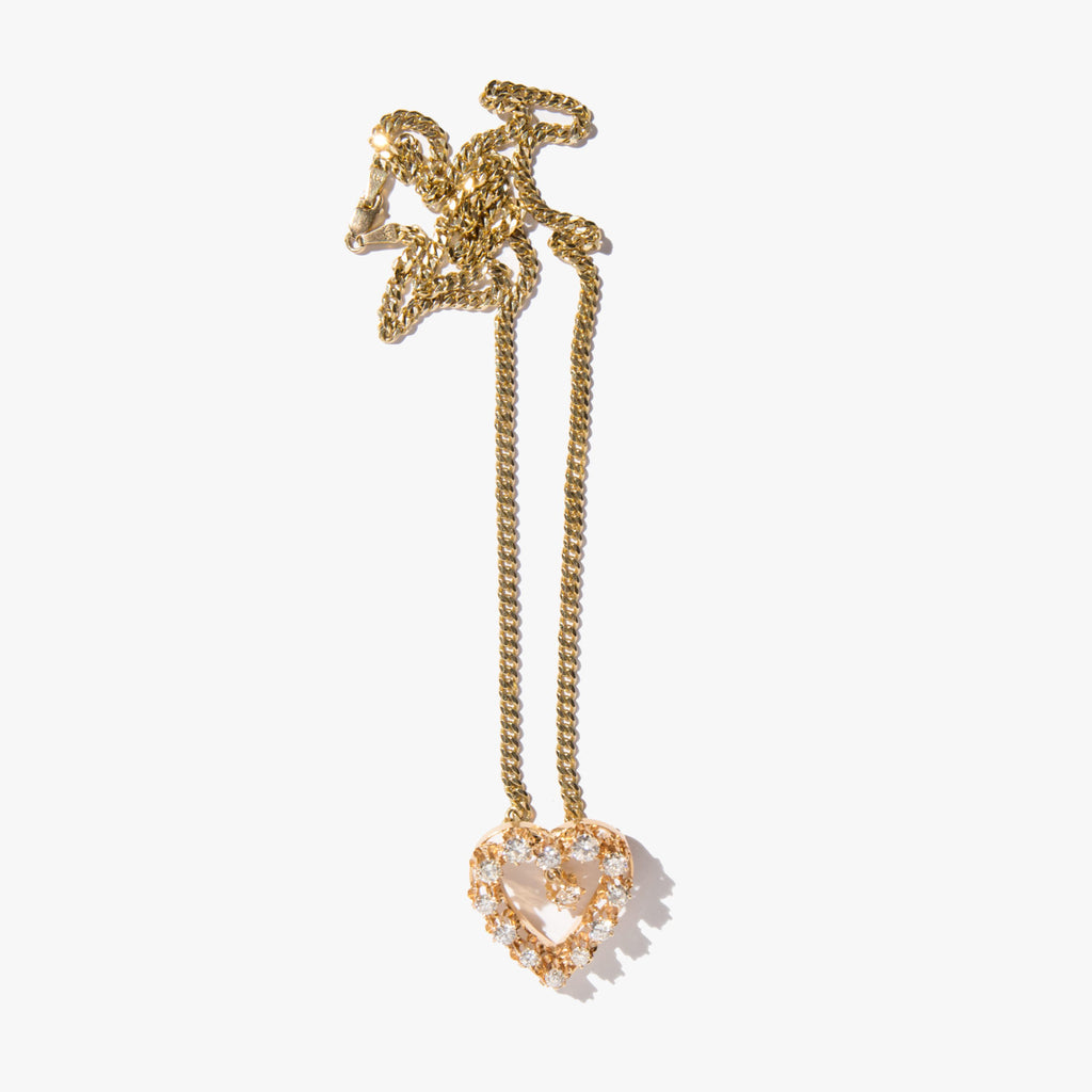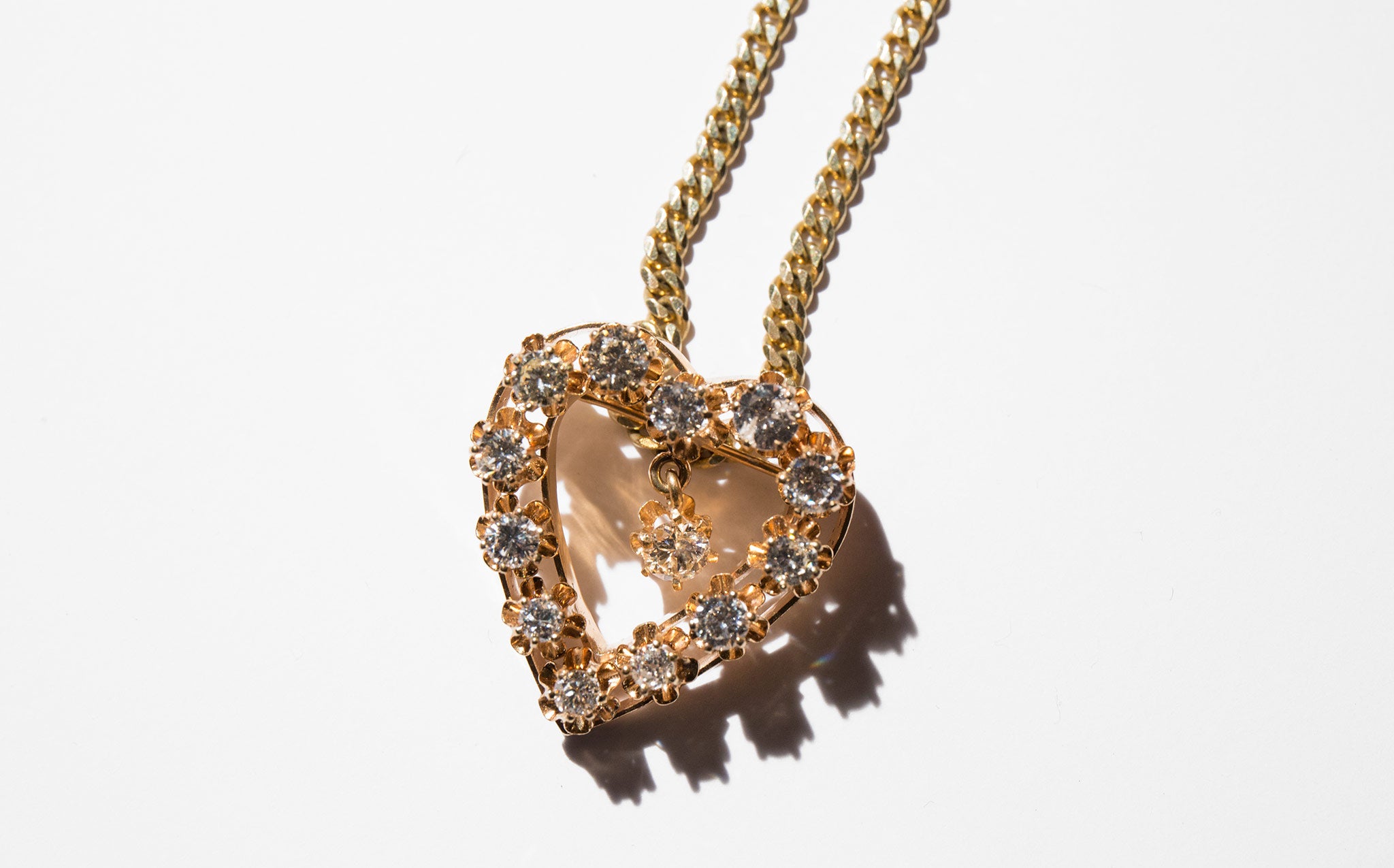 A glittery 14k and diamond heart charm with a total diamond weight of 2 ct on a thick link 14k gold chain.