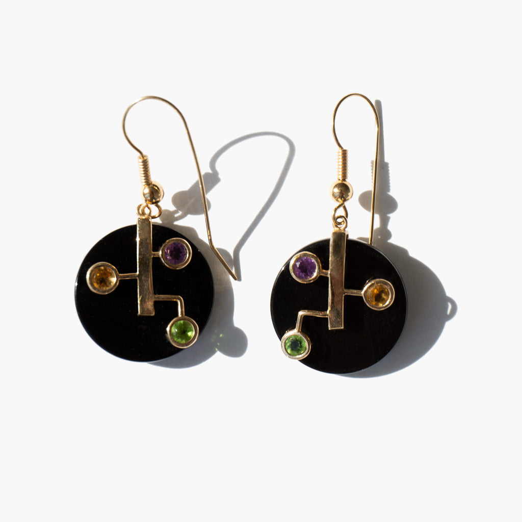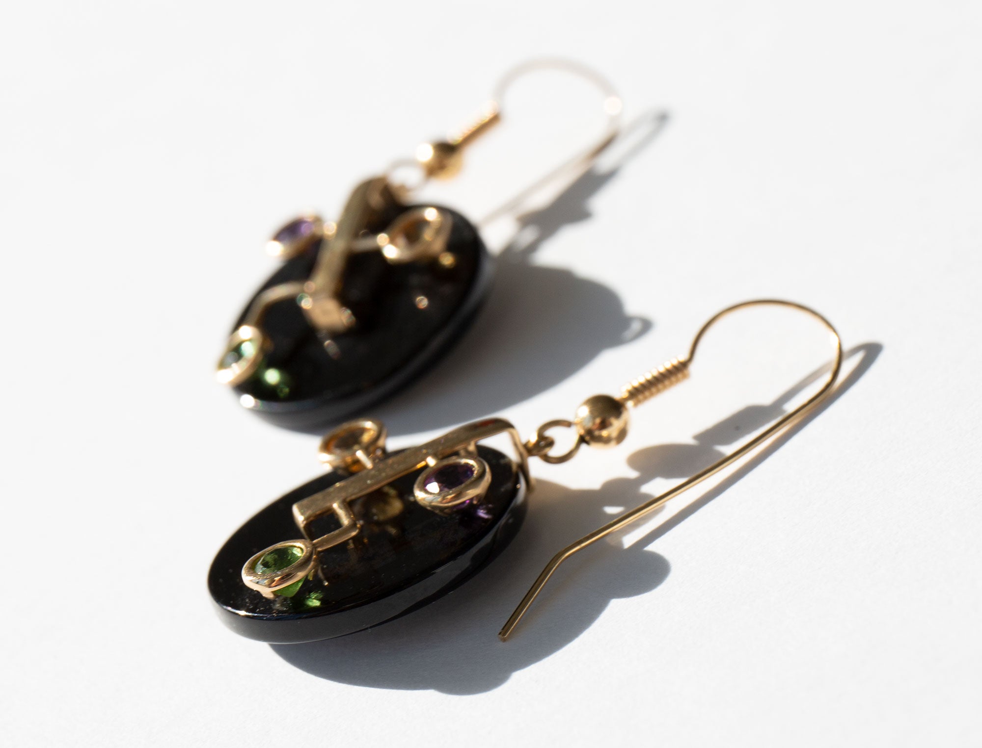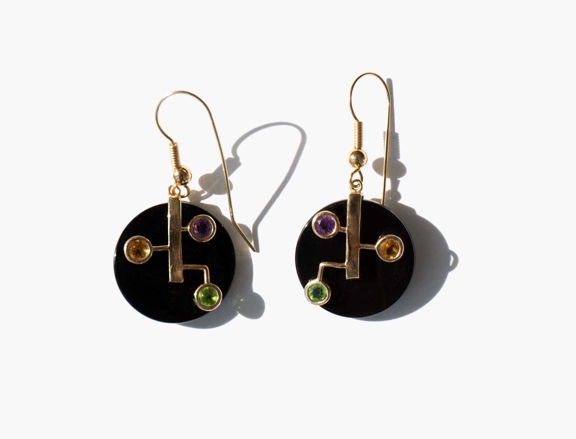 Abstract 14k gold and onyx earrings with amethyst, citrine, and peridot accents.