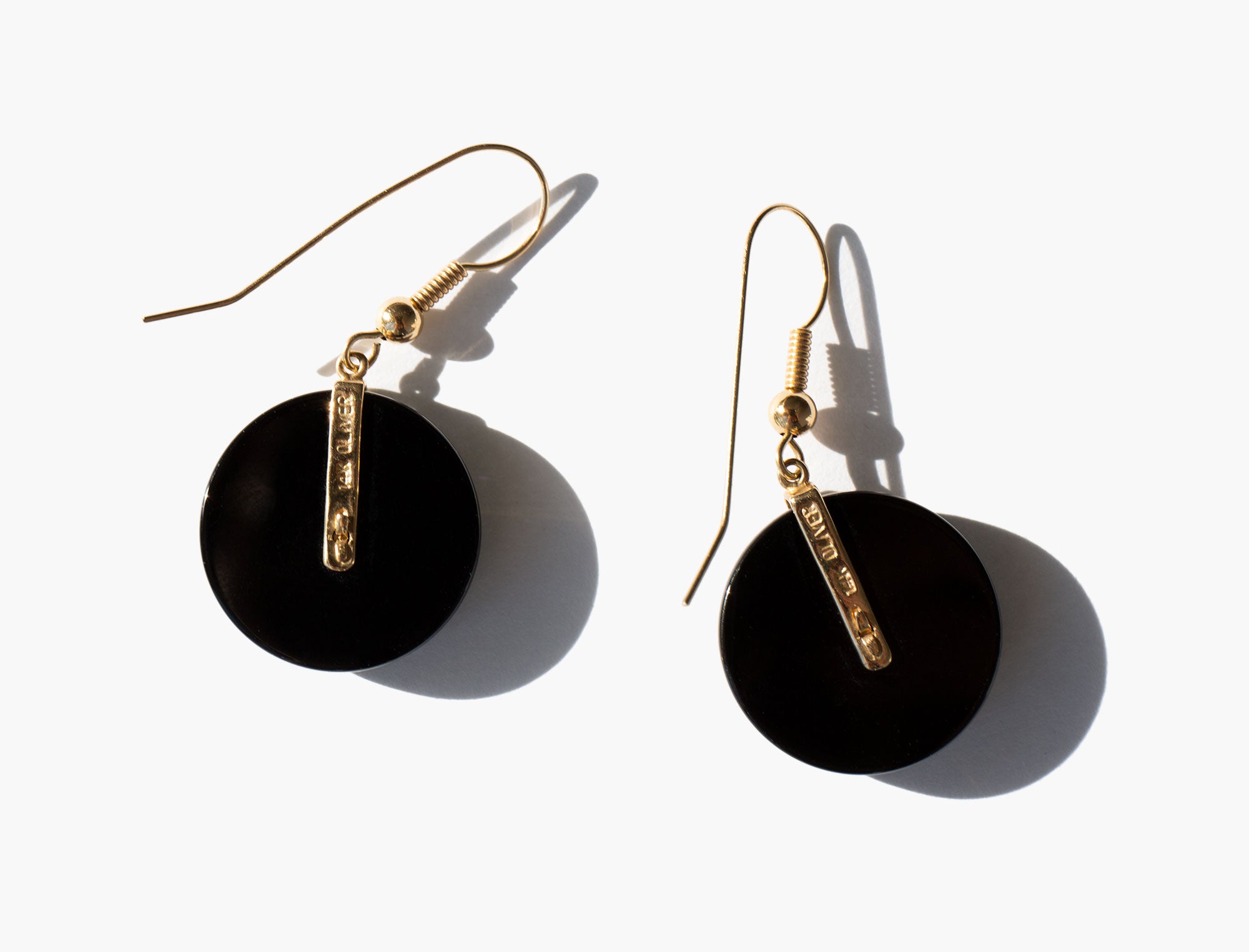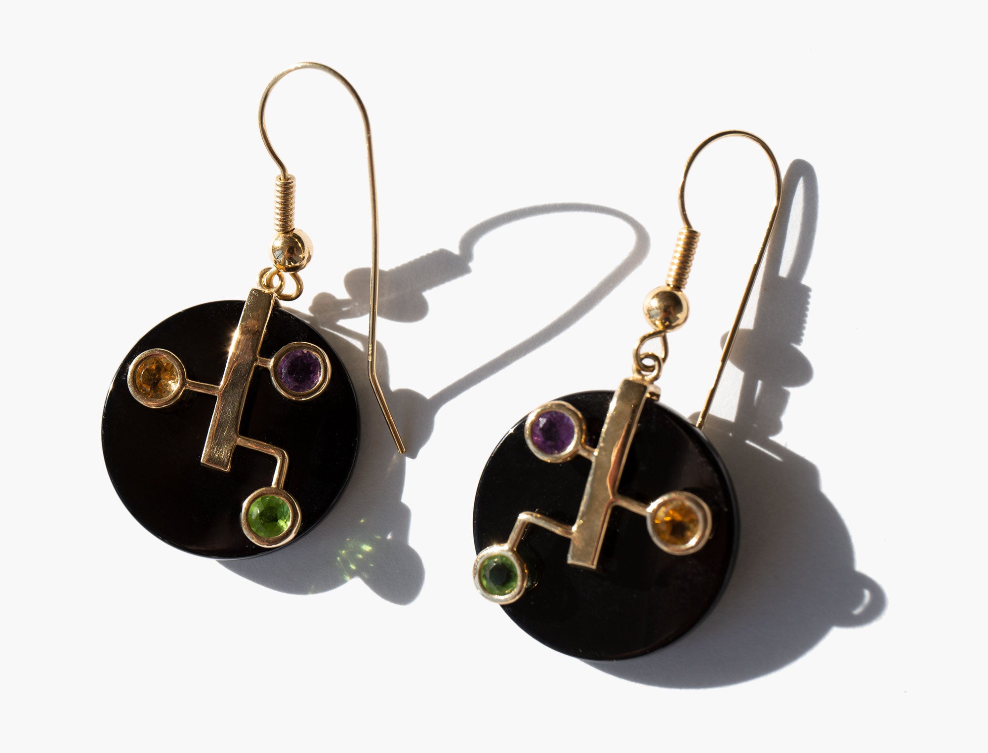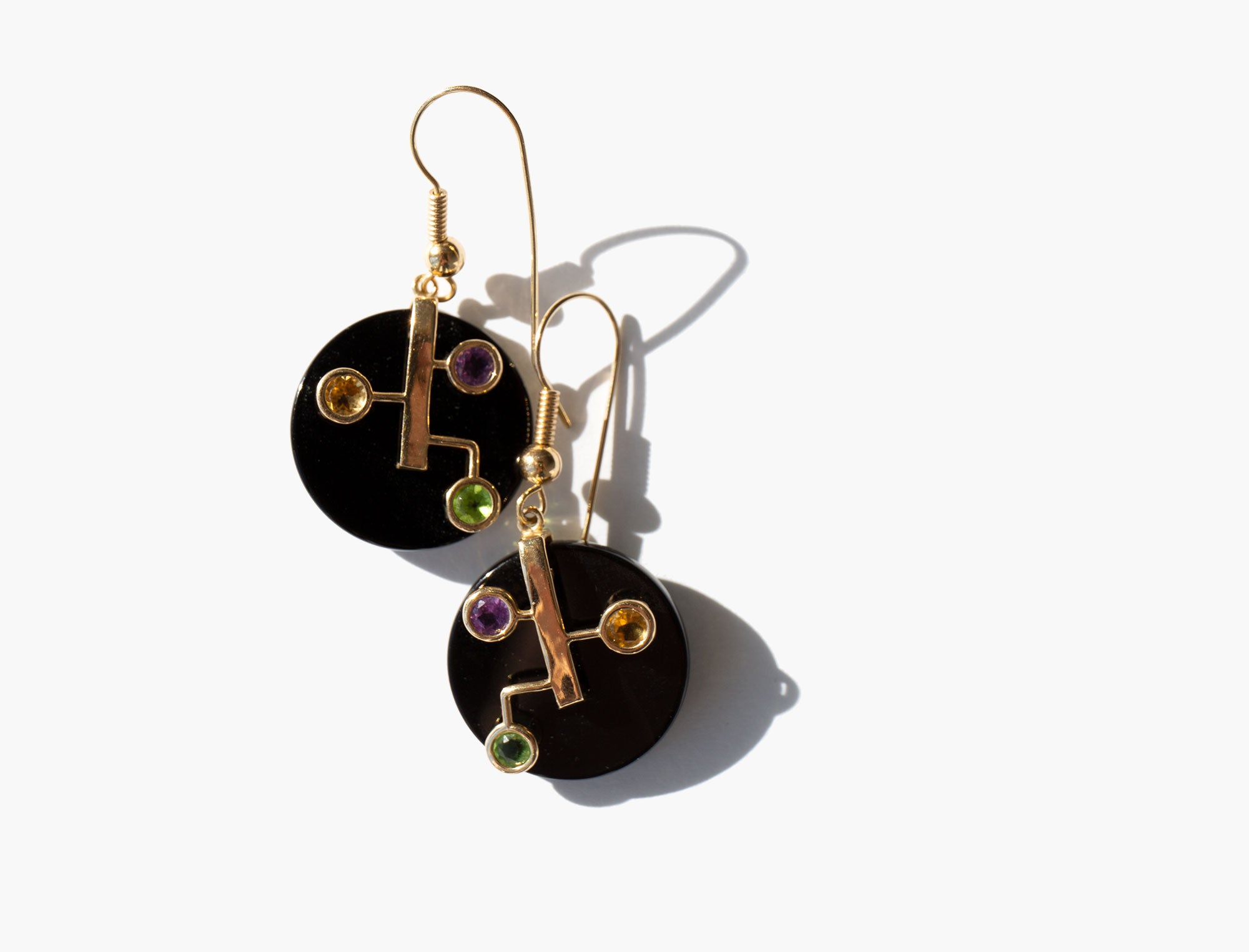 Abstract 14k gold and onyx earrings with amethyst, citrine, and peridot accents.