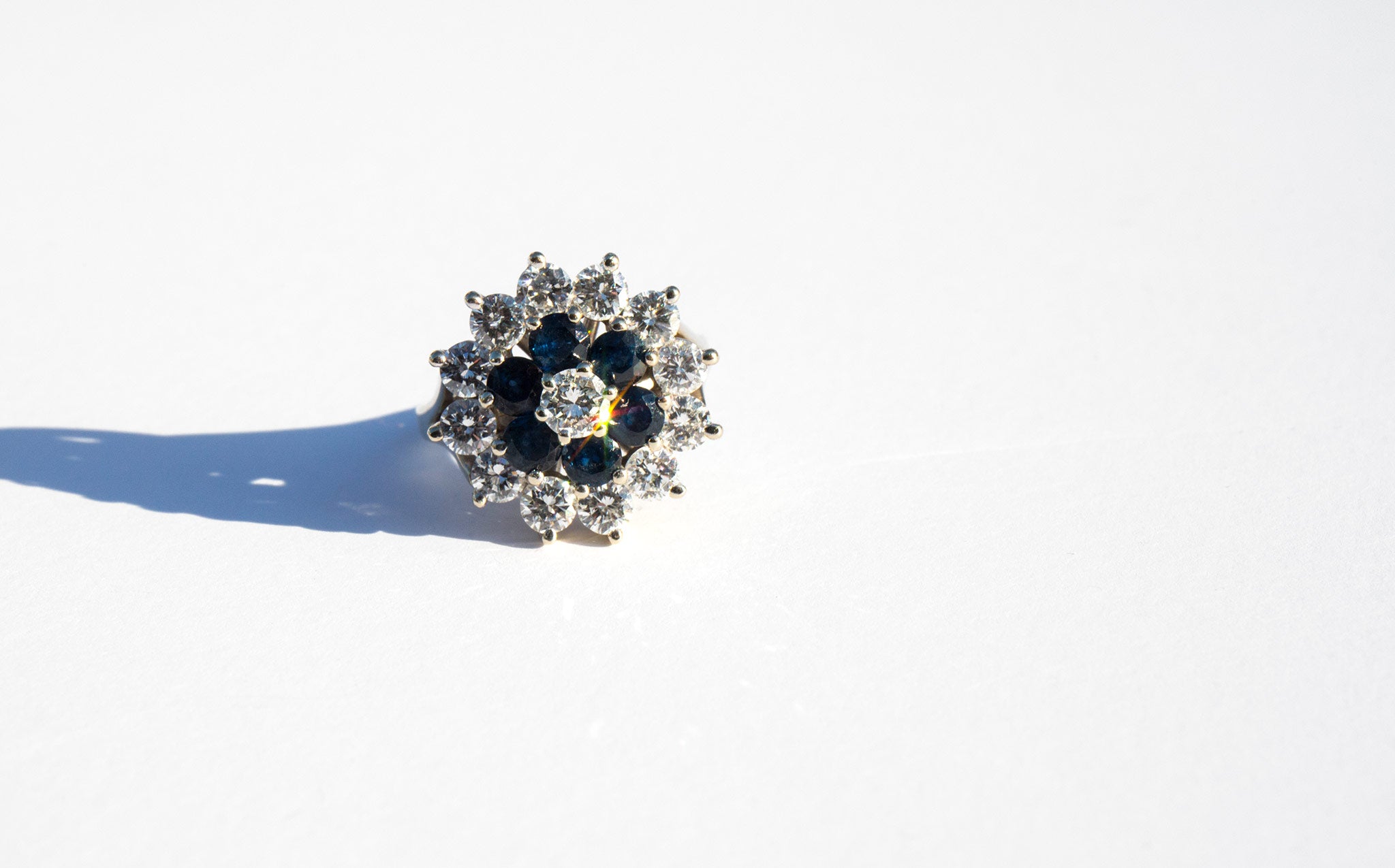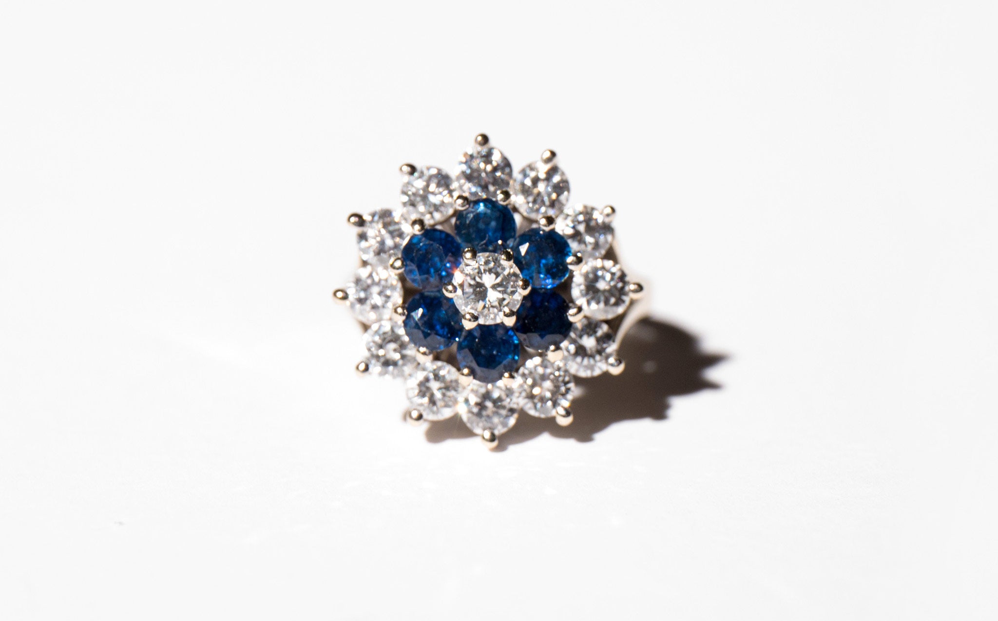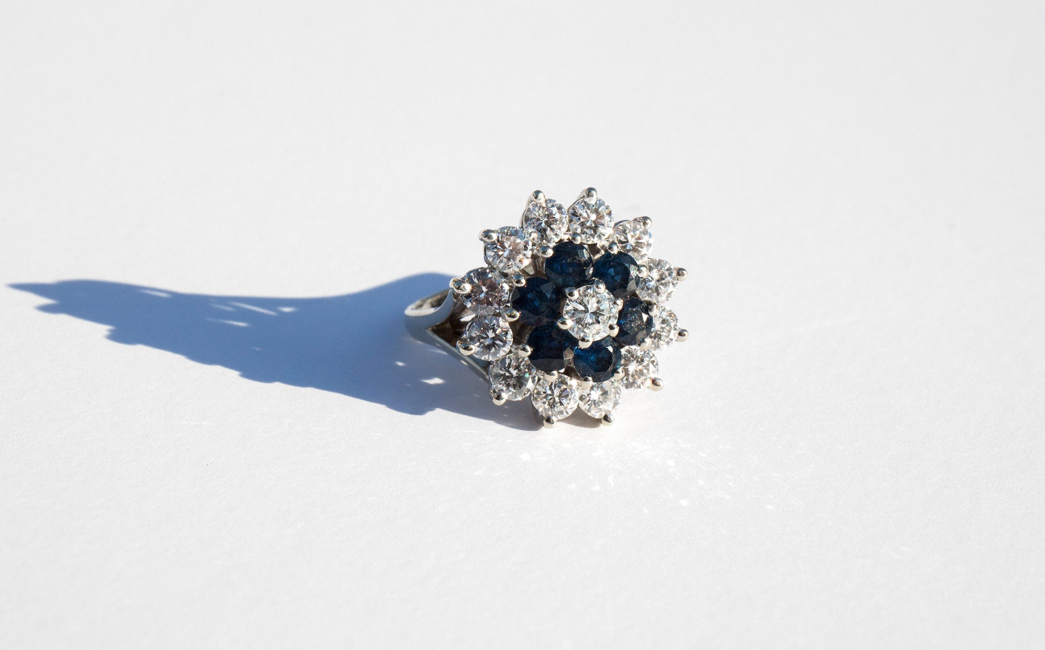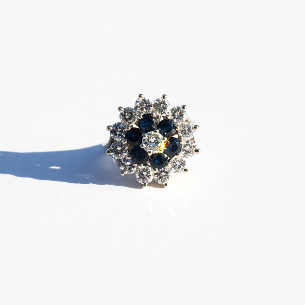 A spectacular showpiece – 14k white gold floral setting with large and sparkling diamonds totaling 2ct. and a center of large, deep blue sapphires.
