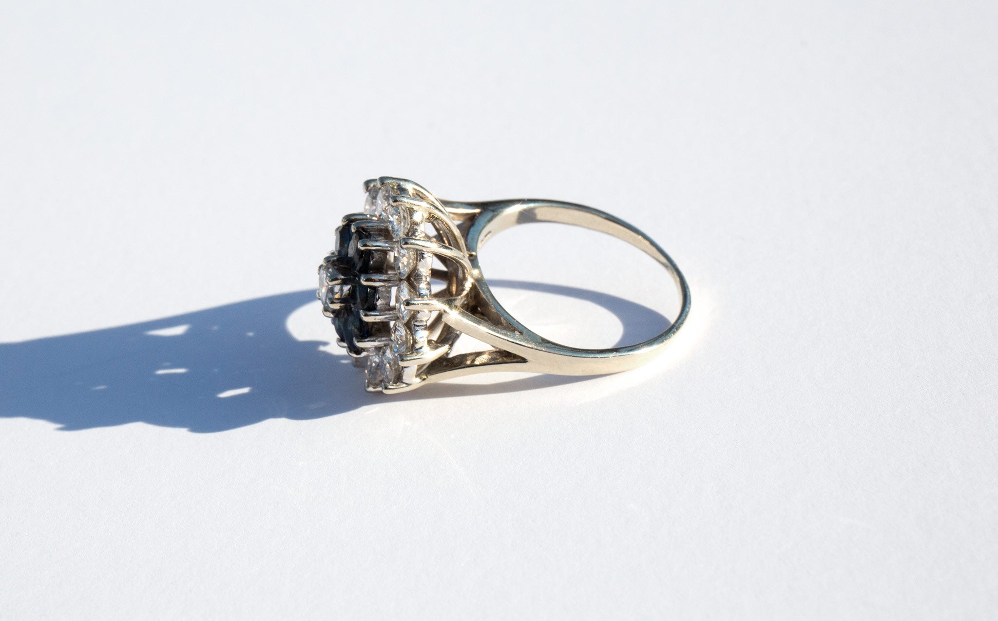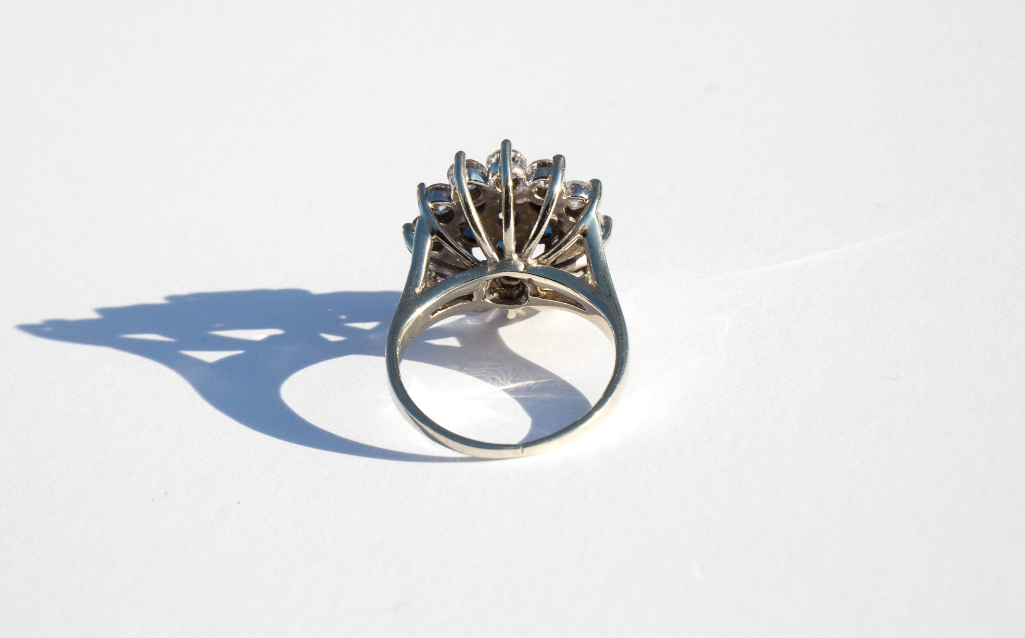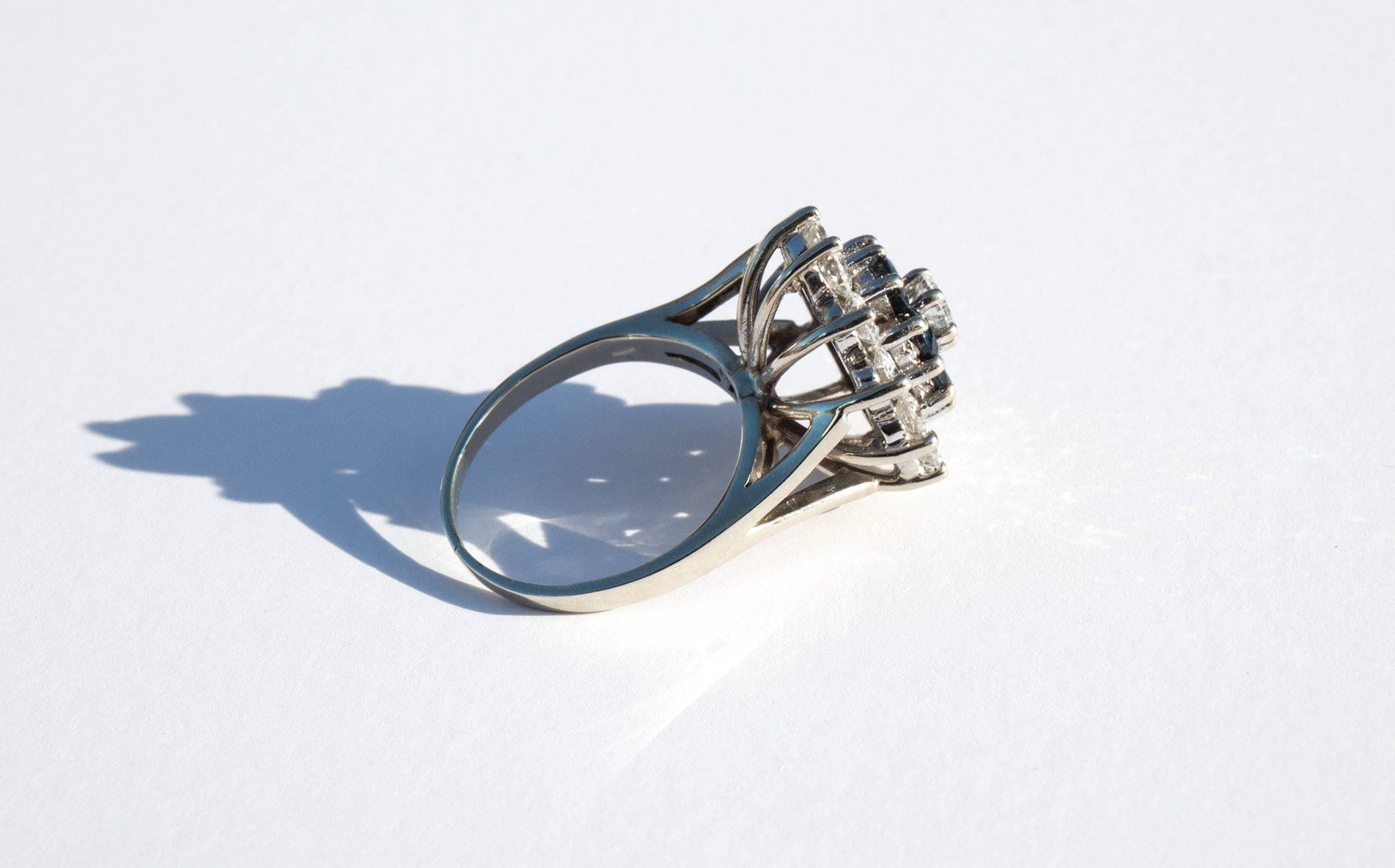 A spectacular showpiece – 14k white gold floral setting with large and sparkling diamonds totaling 2ct. and a center of large, deep blue sapphires.