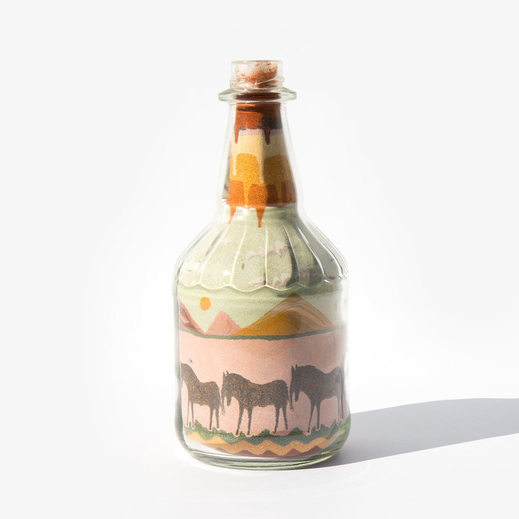 Message in a bottle – a pastoral scene of horses against a mountain backdrop, made with an array of colored sand, wax sealed into a glass bottle.