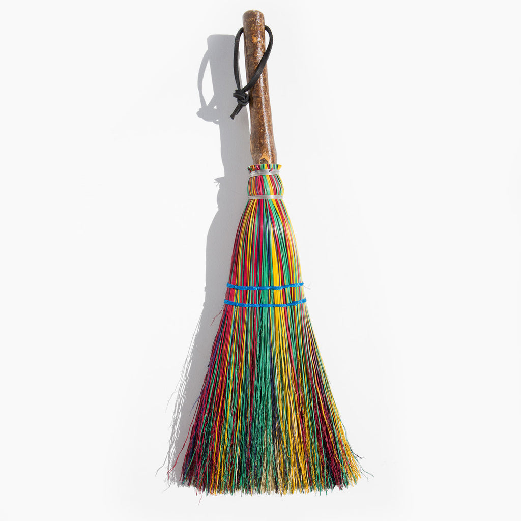 Hearth broom handmade and dyed by Jack Martin of Hockaday Handmade Brooms in Selmer, Tennessee. The Hockaday family has been growing broomcorn in TN since the early 1900's and Martin learned the art of broom making from his grandfather, Jack Hockaday, who had been crafting brooms with his father since 1916. Each broom is still made on the antique broom equipment built by Martin's great-grandfather, Will, and the shop is still located on the same farmland in Selmer.