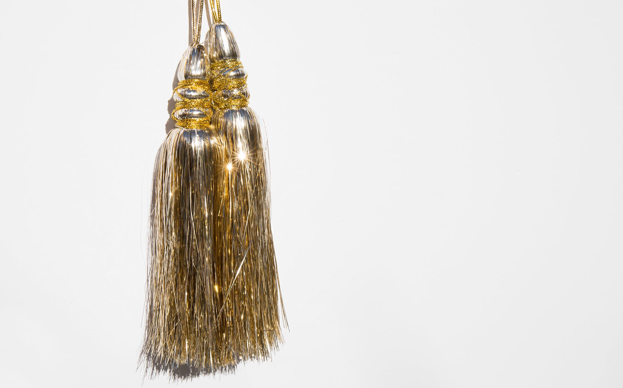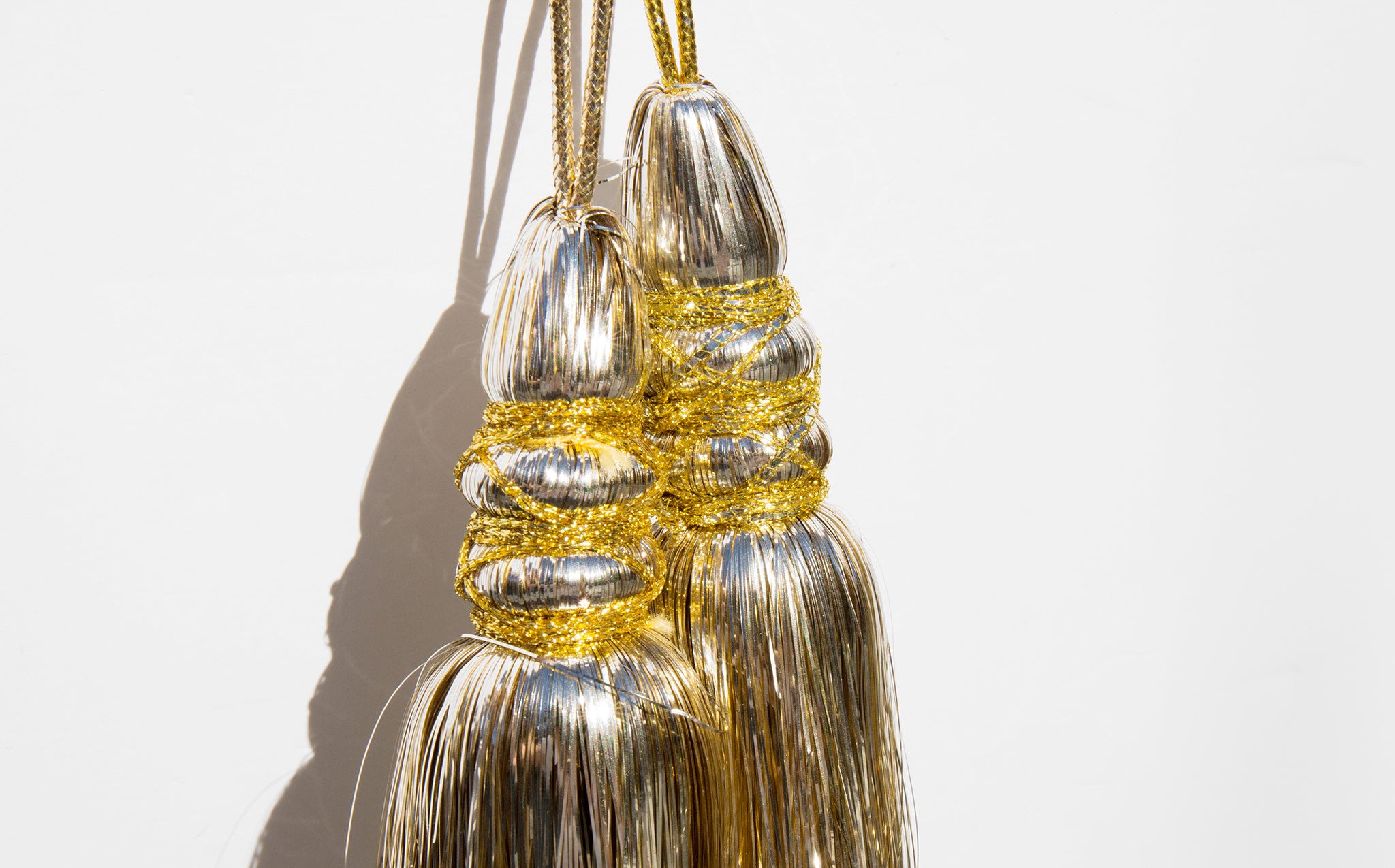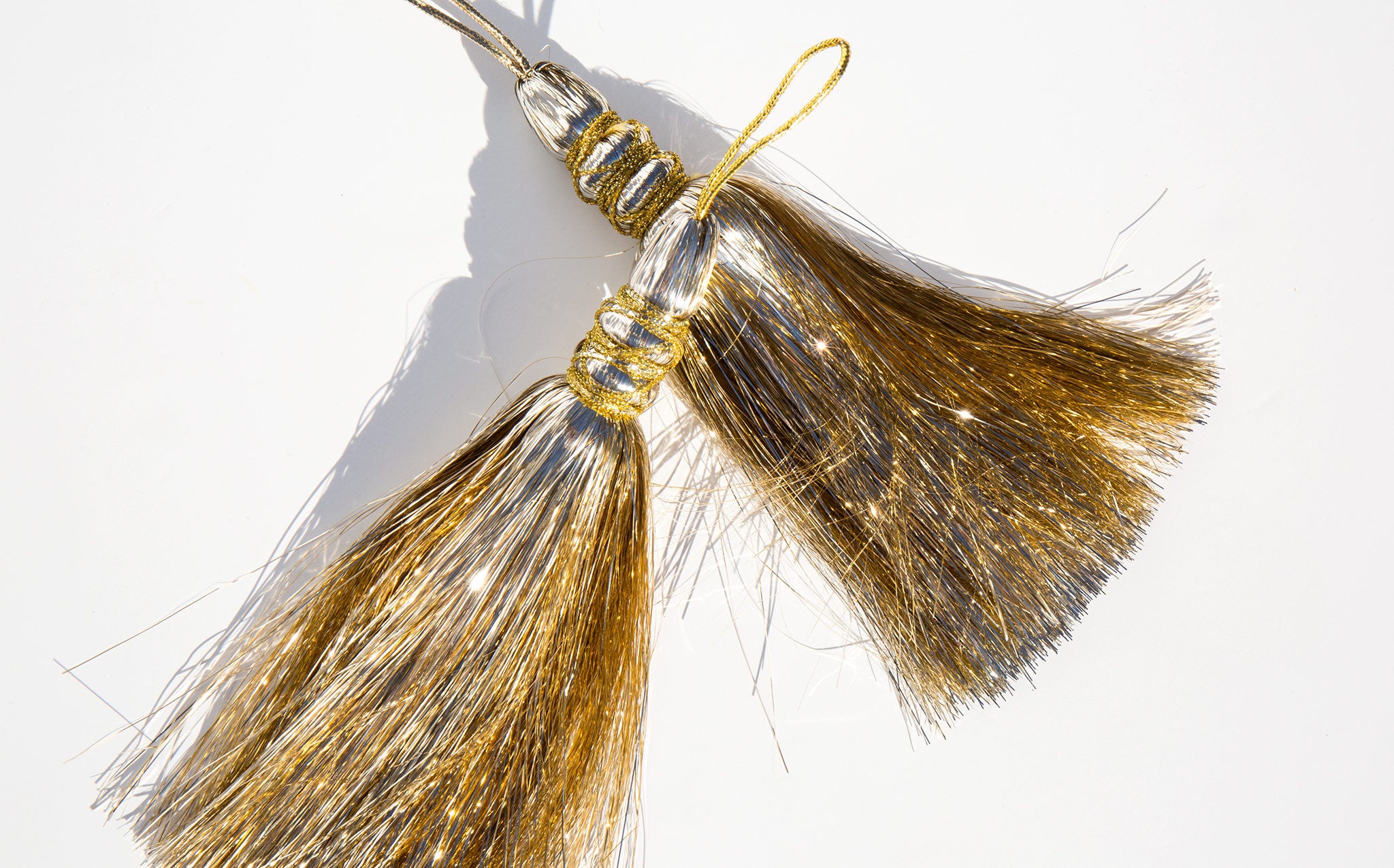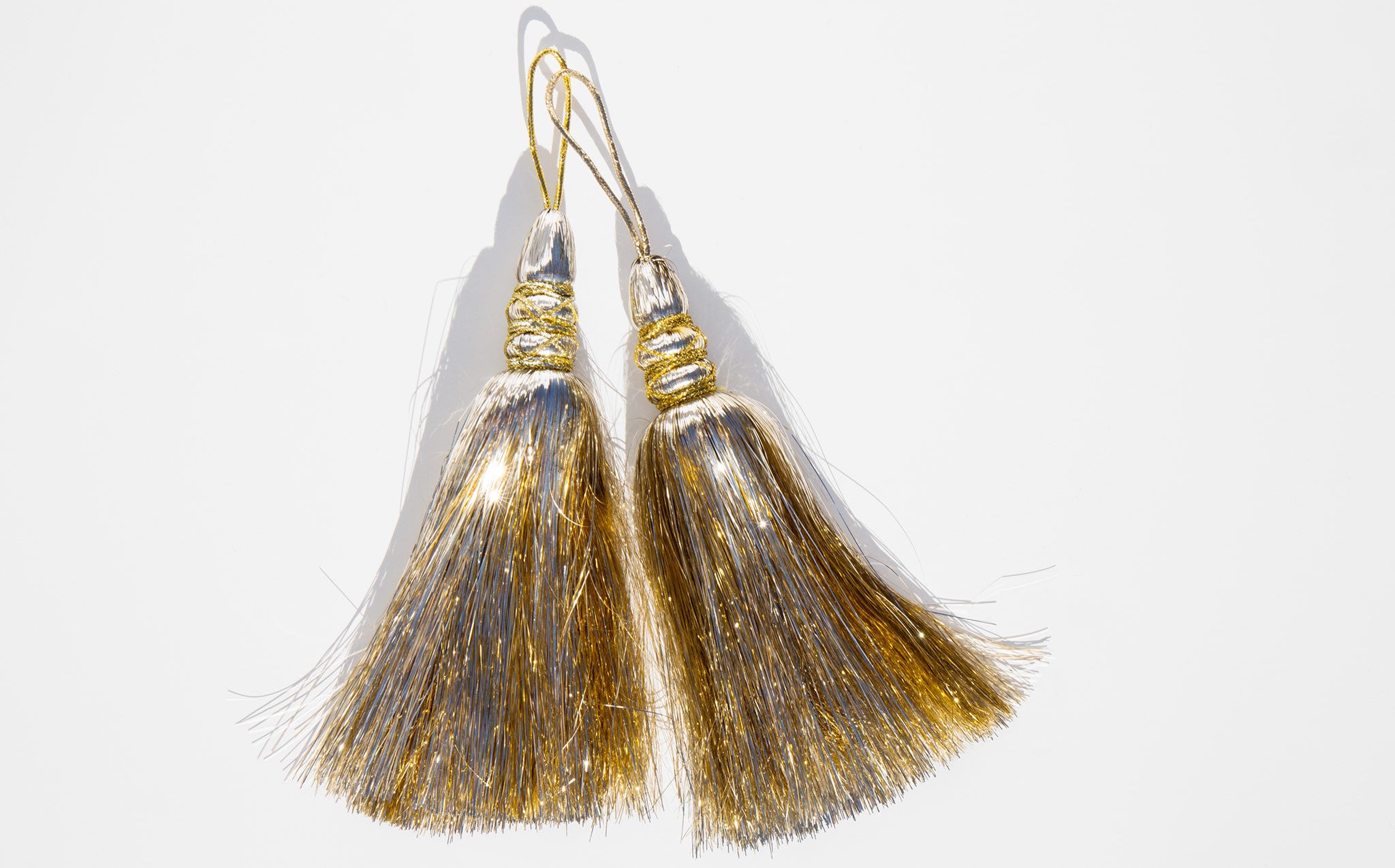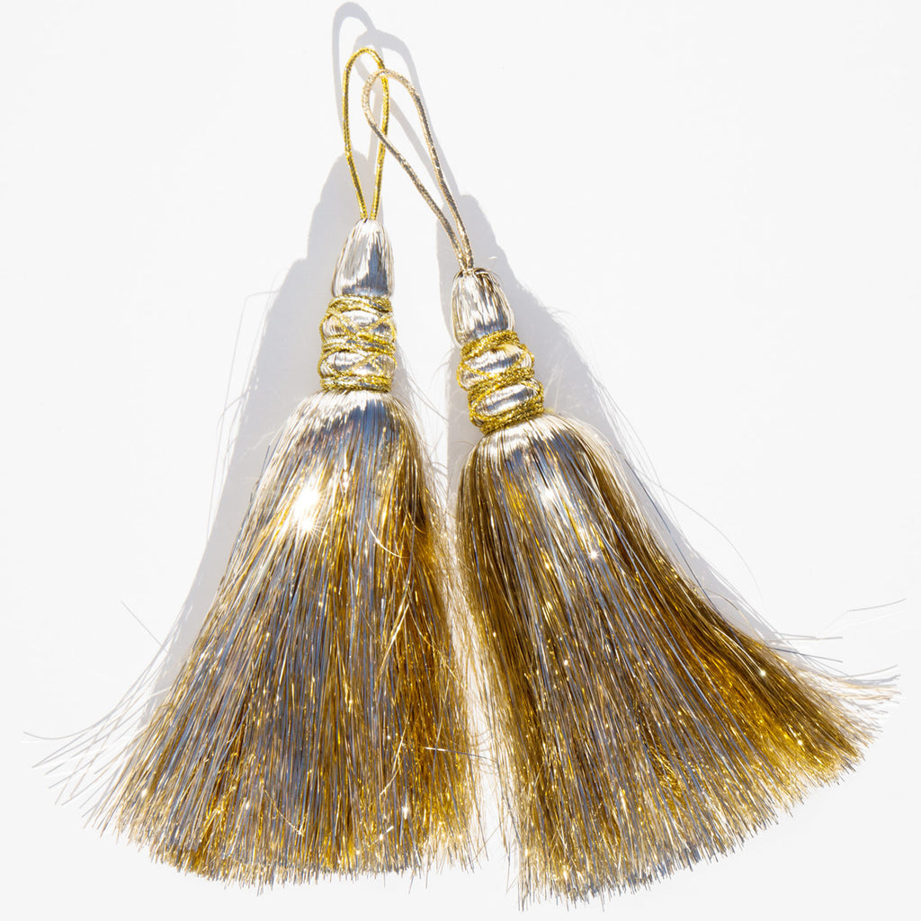 Sparkling silver and gold festive holiday tassel hangings. Set of 2.