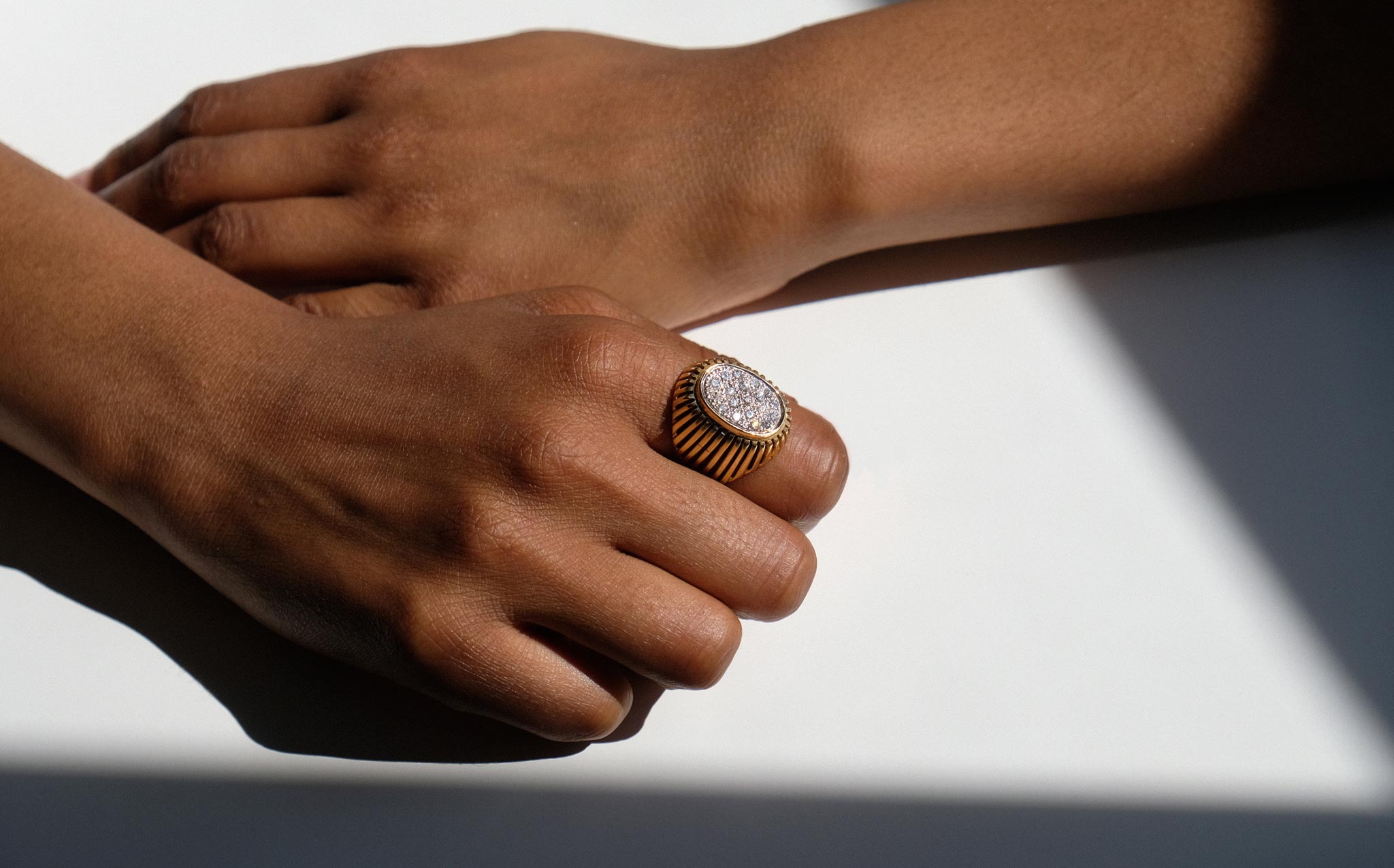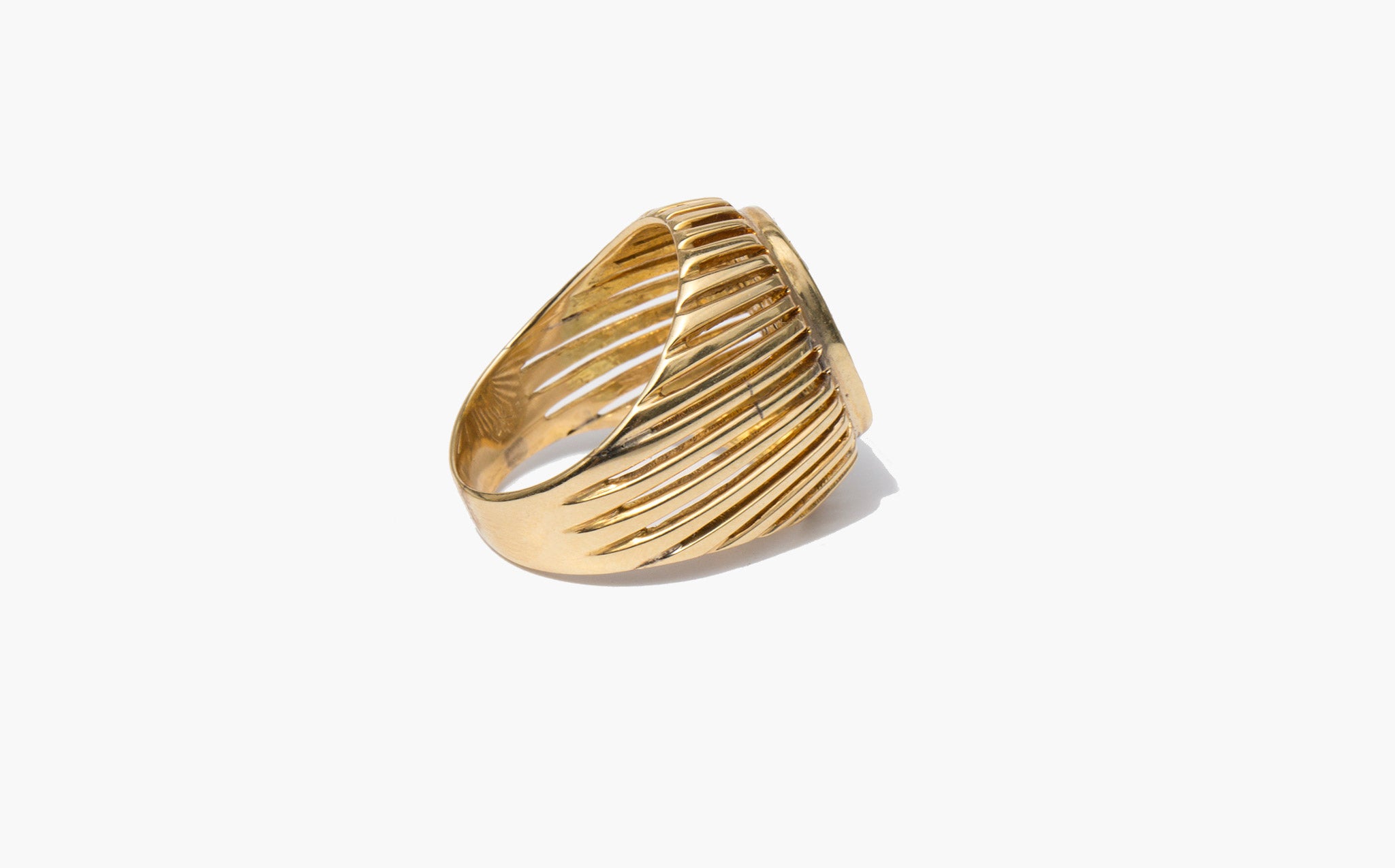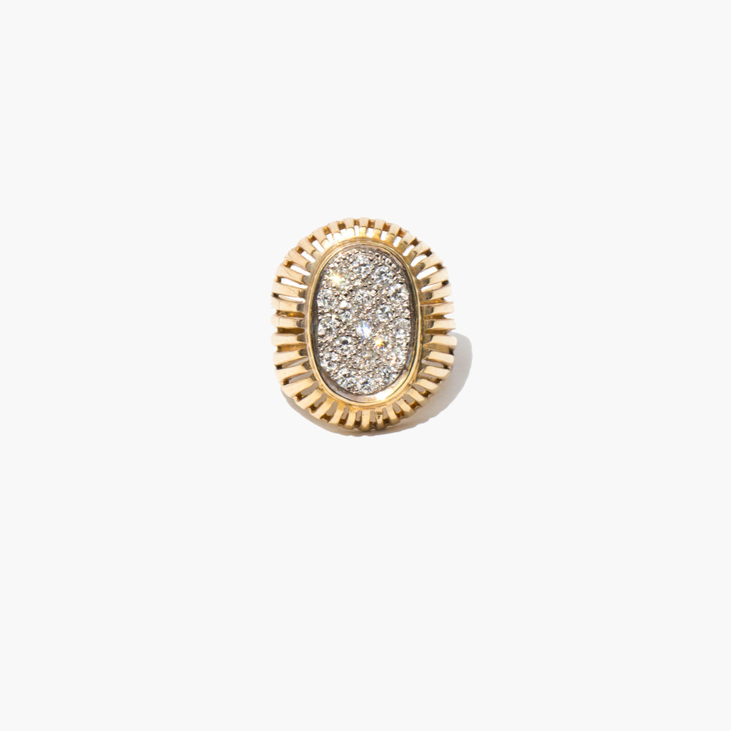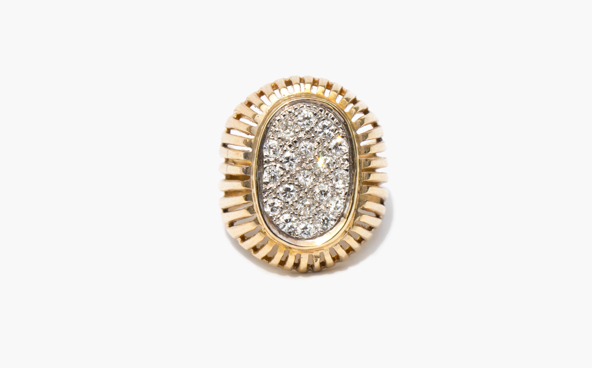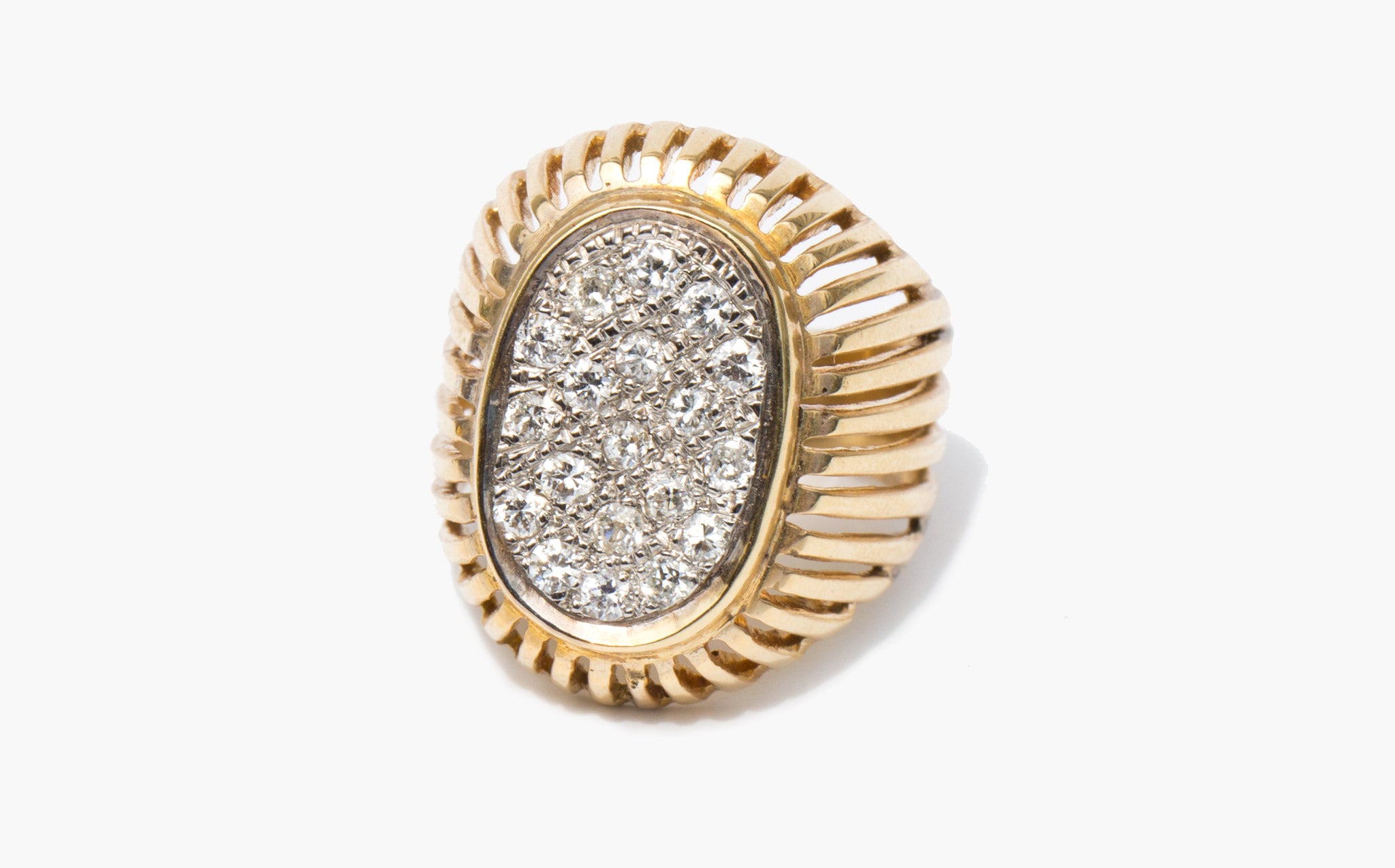 Large oval of petite diamonds in an intricate 14k gold basket setting.