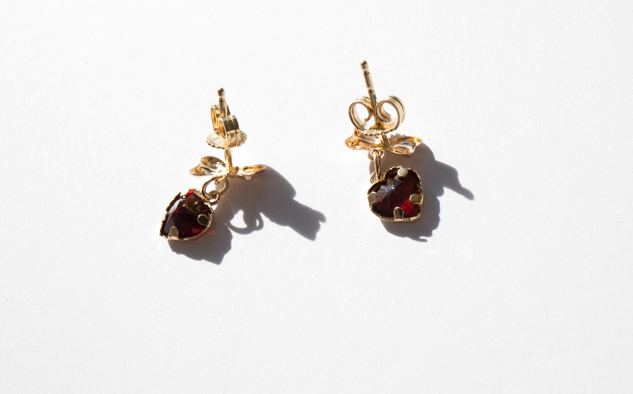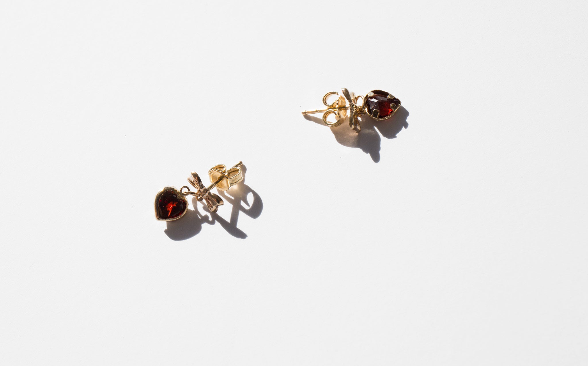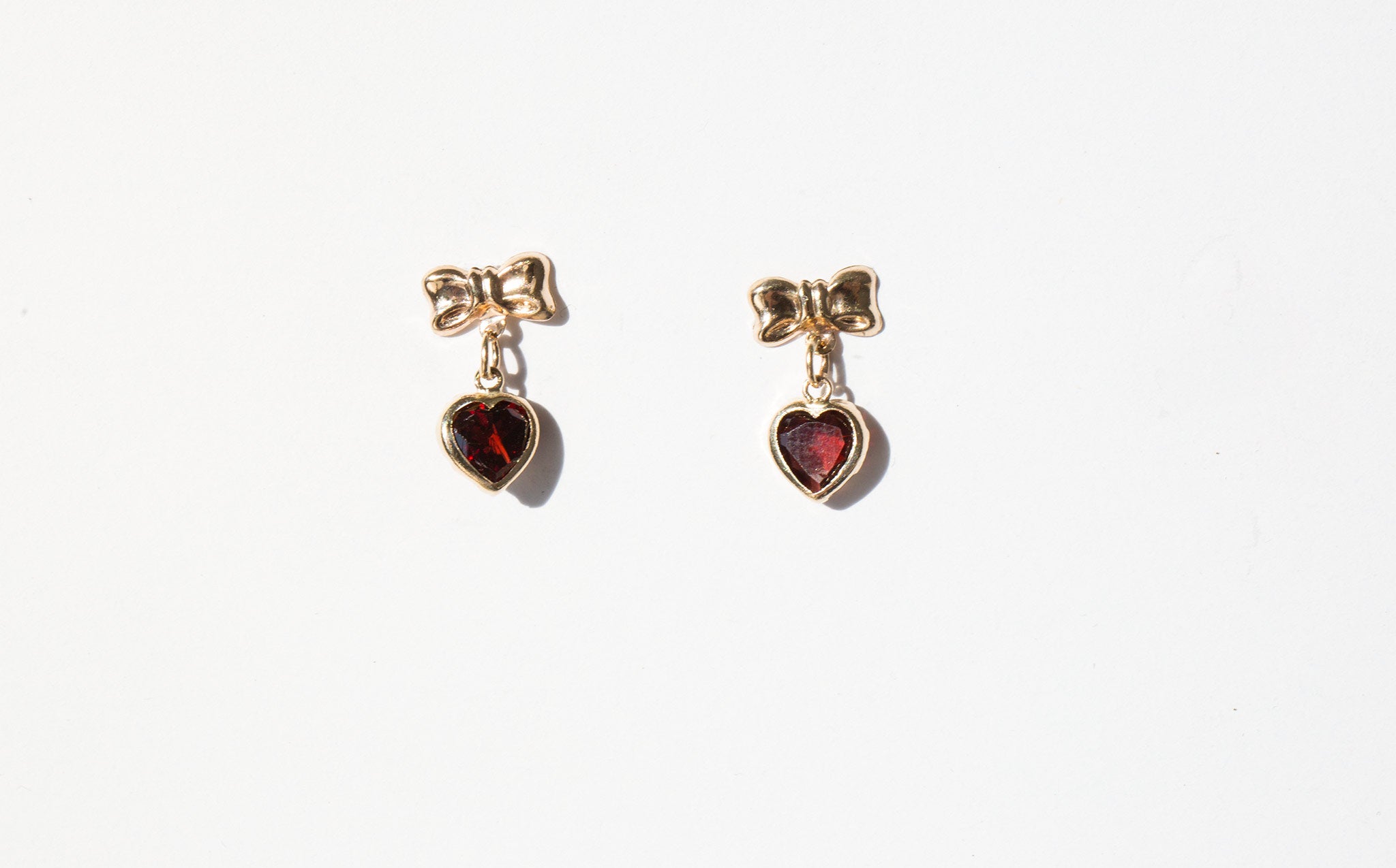 Sweet, tiny 14k gold bow earrings with deep red stone hearts. Garnets are associated with the heart and are ancient symbols of love, truthfulness, and friendship. It is said that you should gift a garnet to a dear friend as you part for an extended period of time to ensure that you return safely to one another.