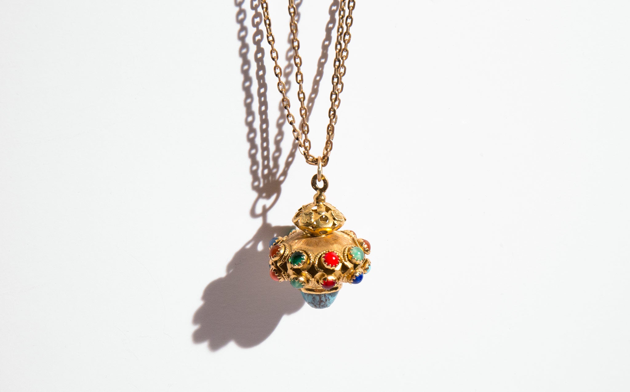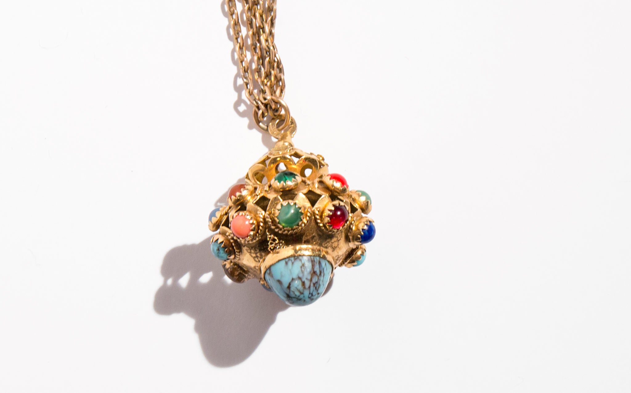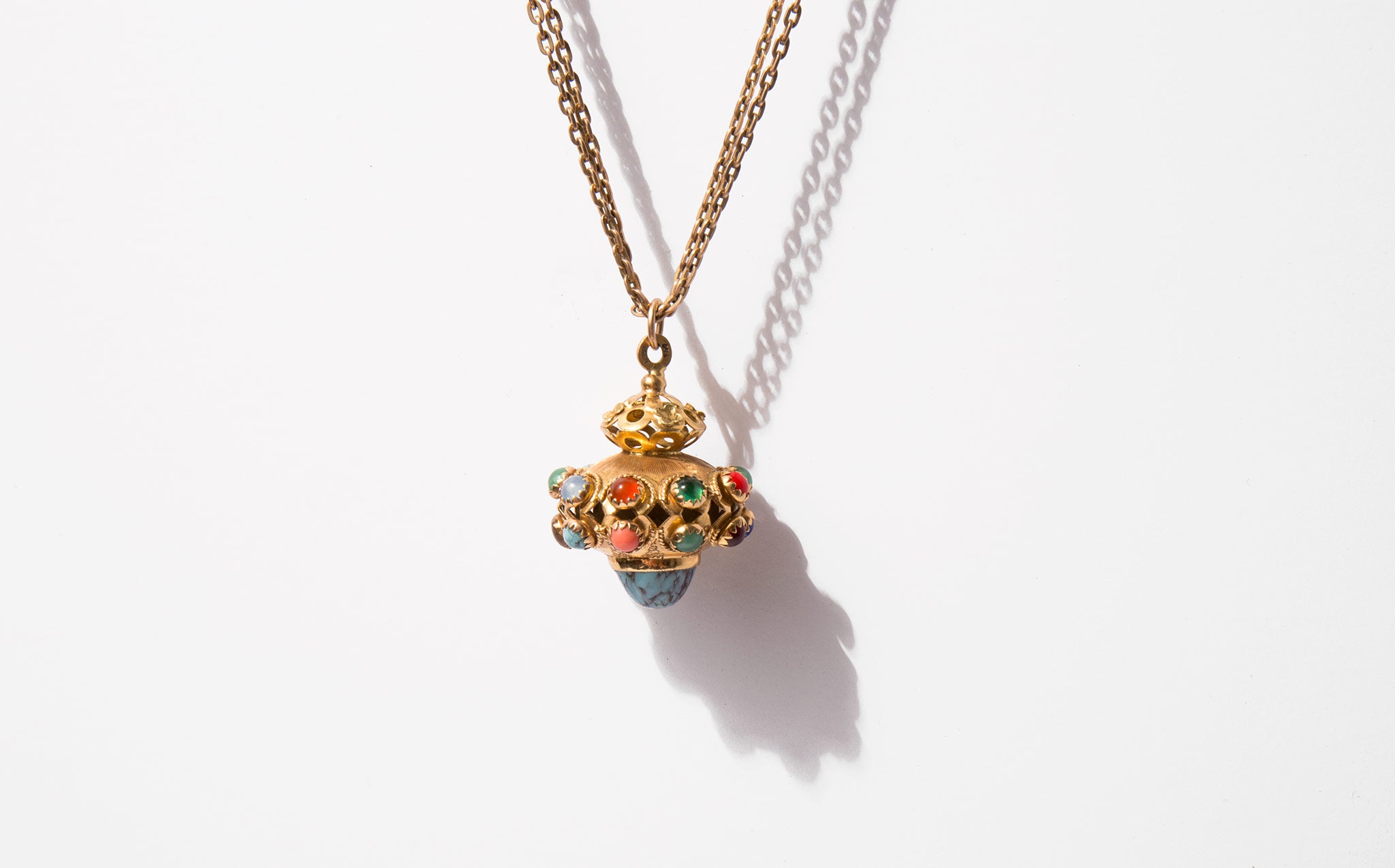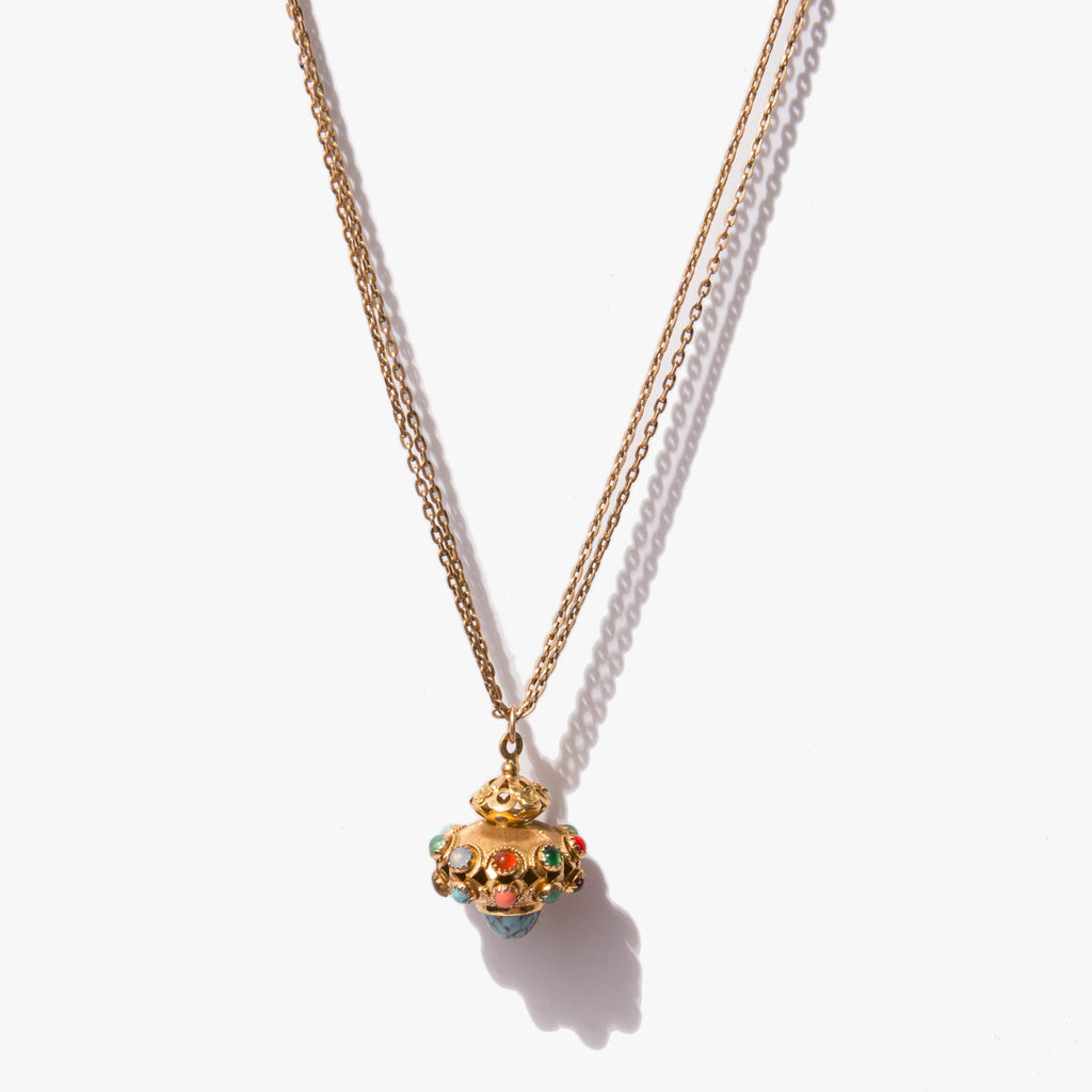 A showstopper – a large, vintage 14k gold pendant jeweled with turquoise, moonstone, garnet, and coral on an elegant, doubled 10K gold antique chain from the 1860's.