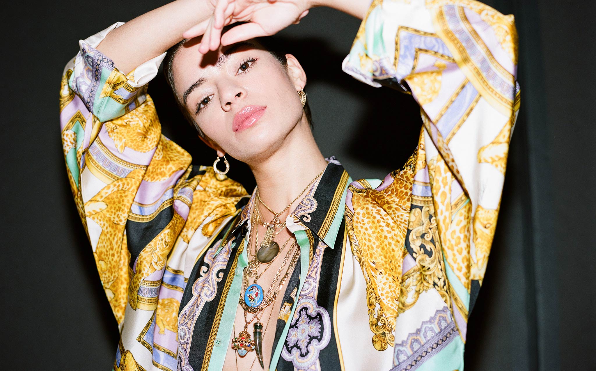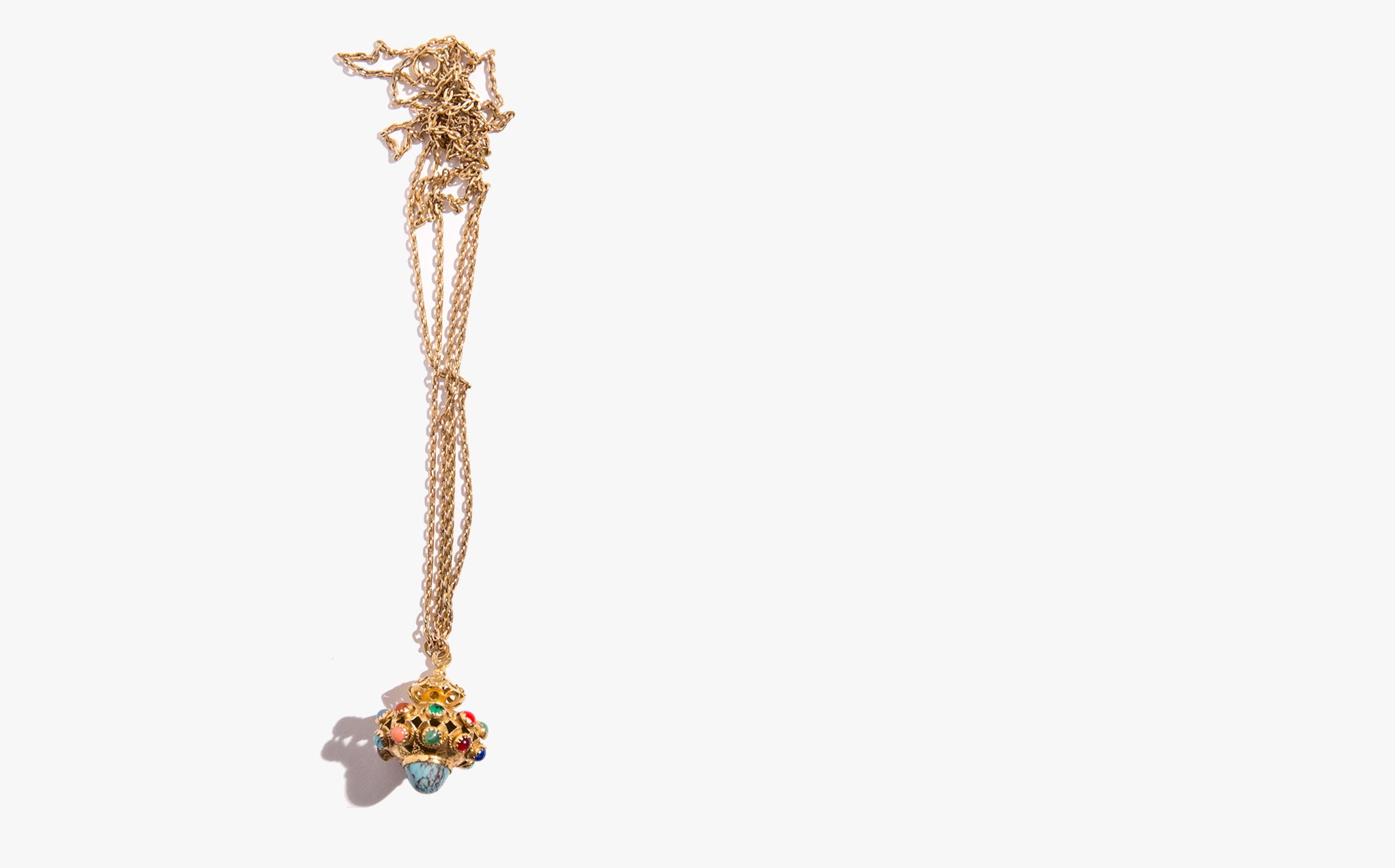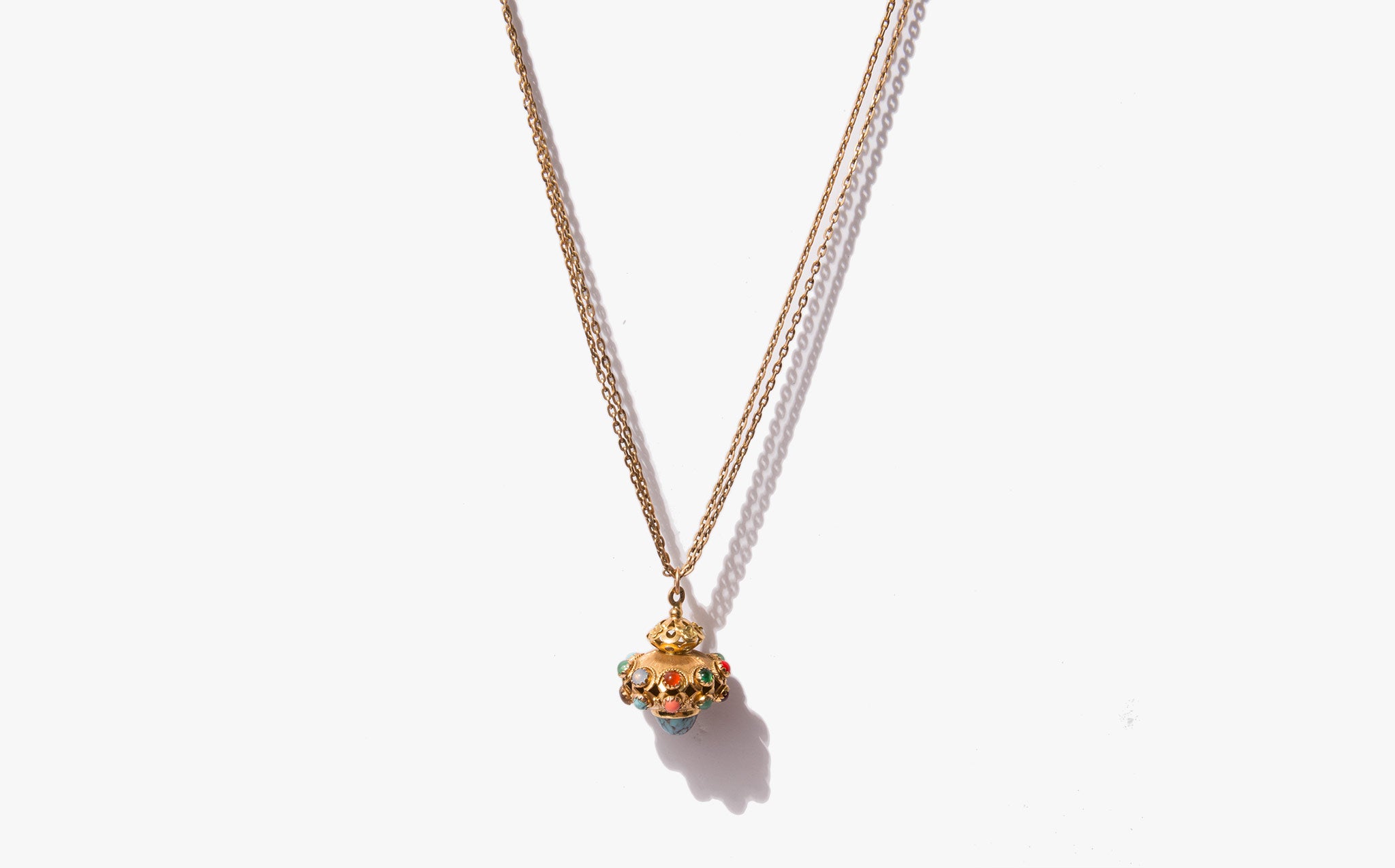 A showstopper – a large, vintage 14k gold pendant jeweled with turquoise, moonstone, garnet, and coral on an elegant, doubled 10K gold antique chain from the 1860's.