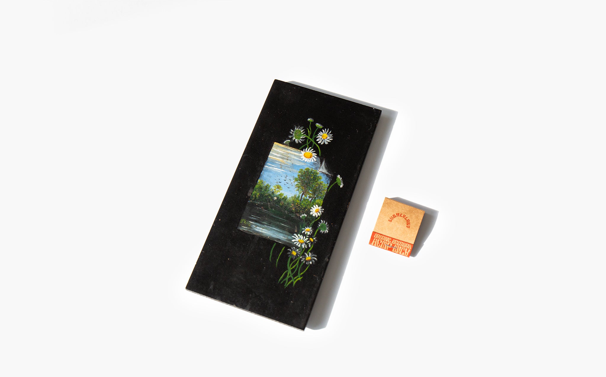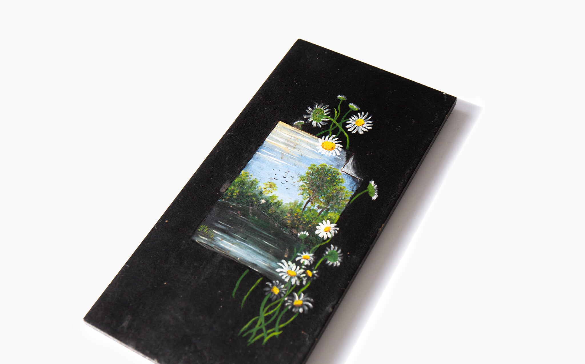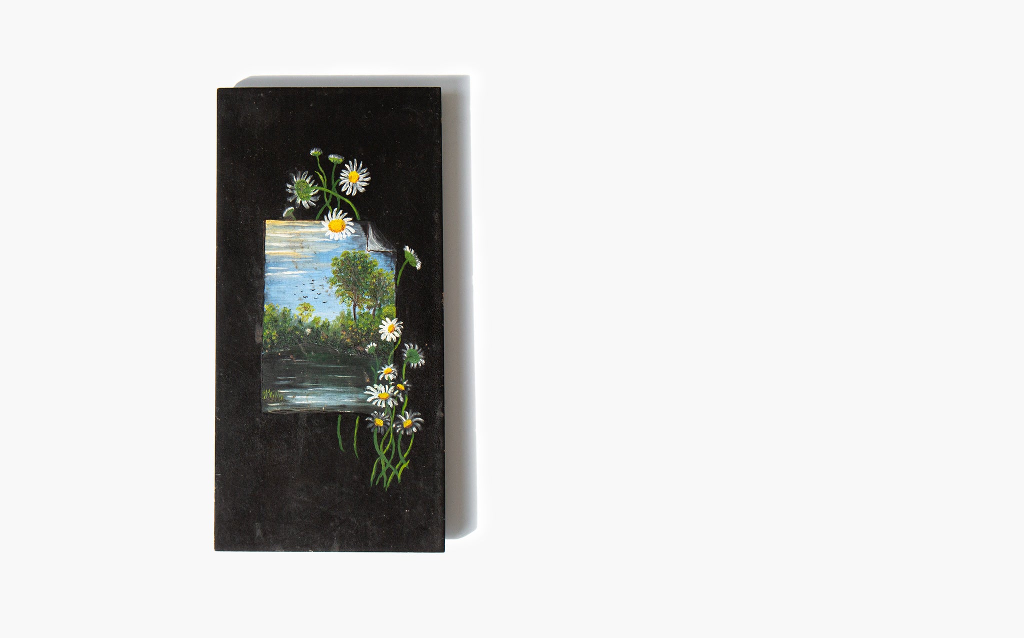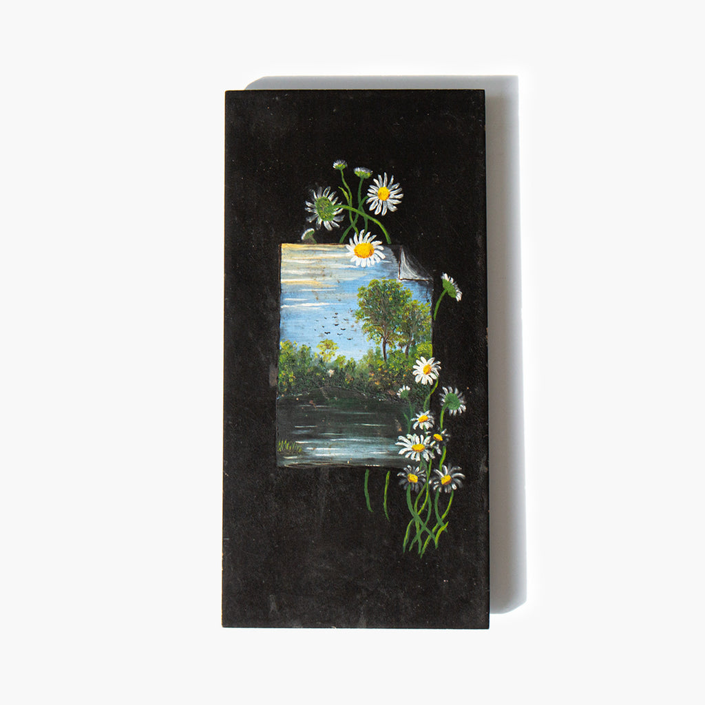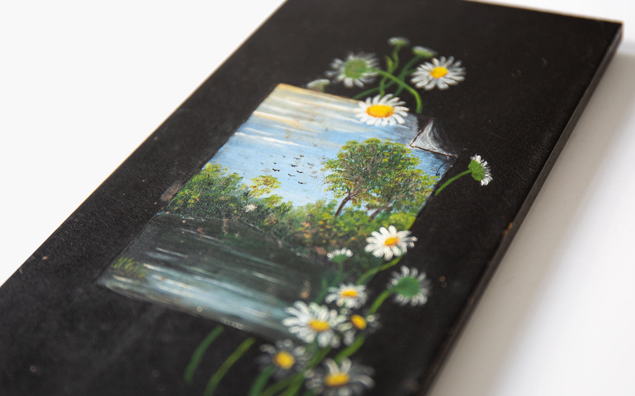 Small, hand-painted, antique landscape on wood. A scene of foliage, water, and fresh spring flowers that evoke the idealized pastoral life.