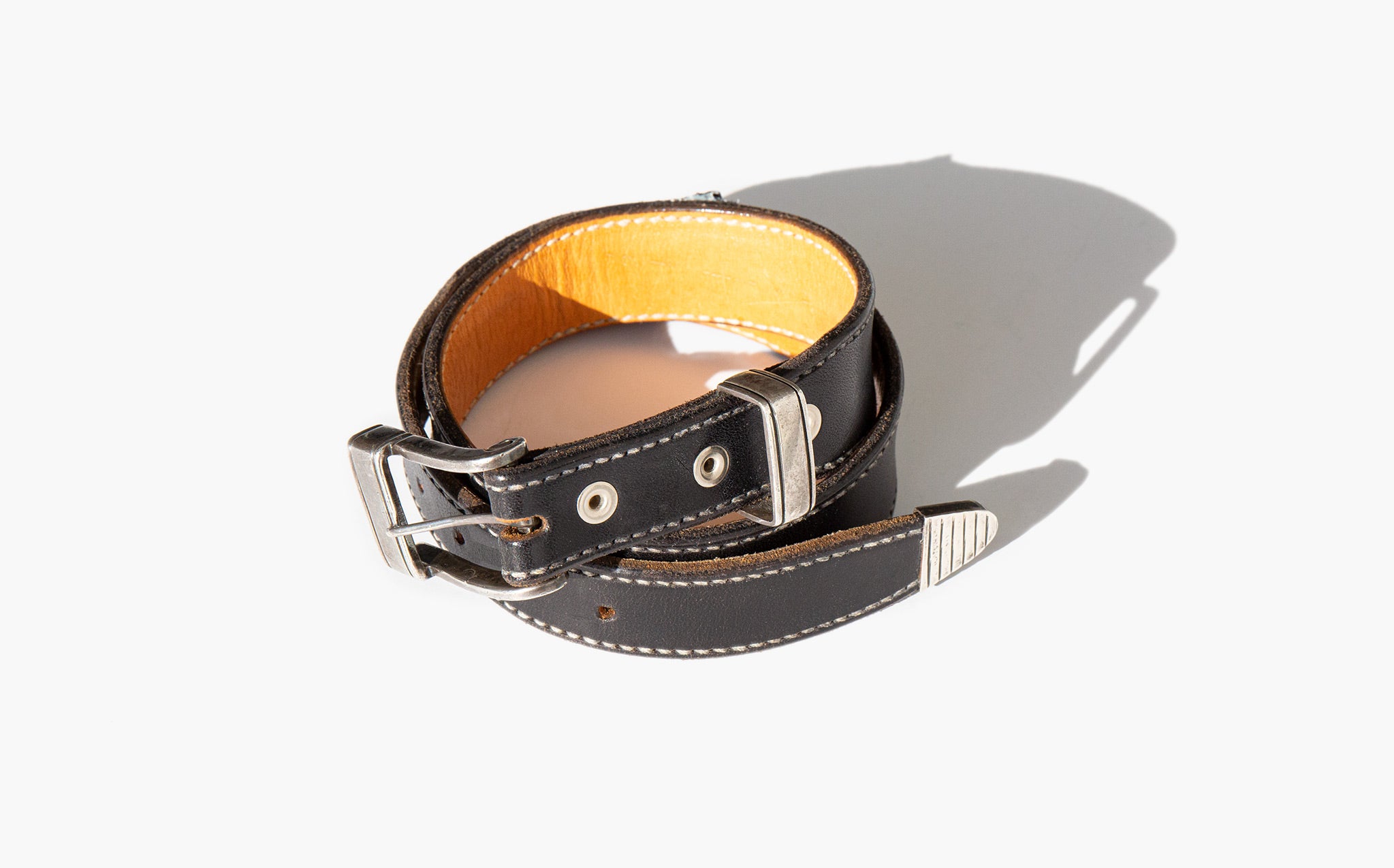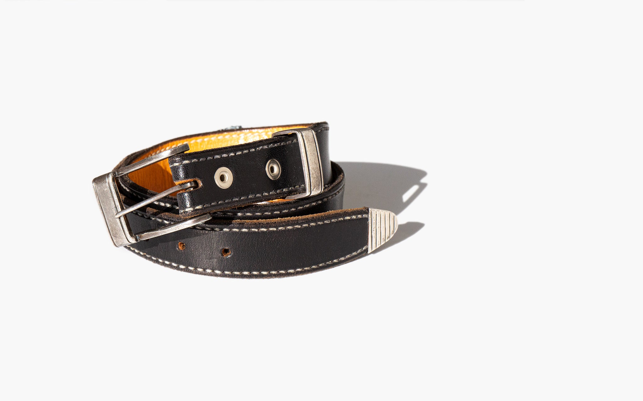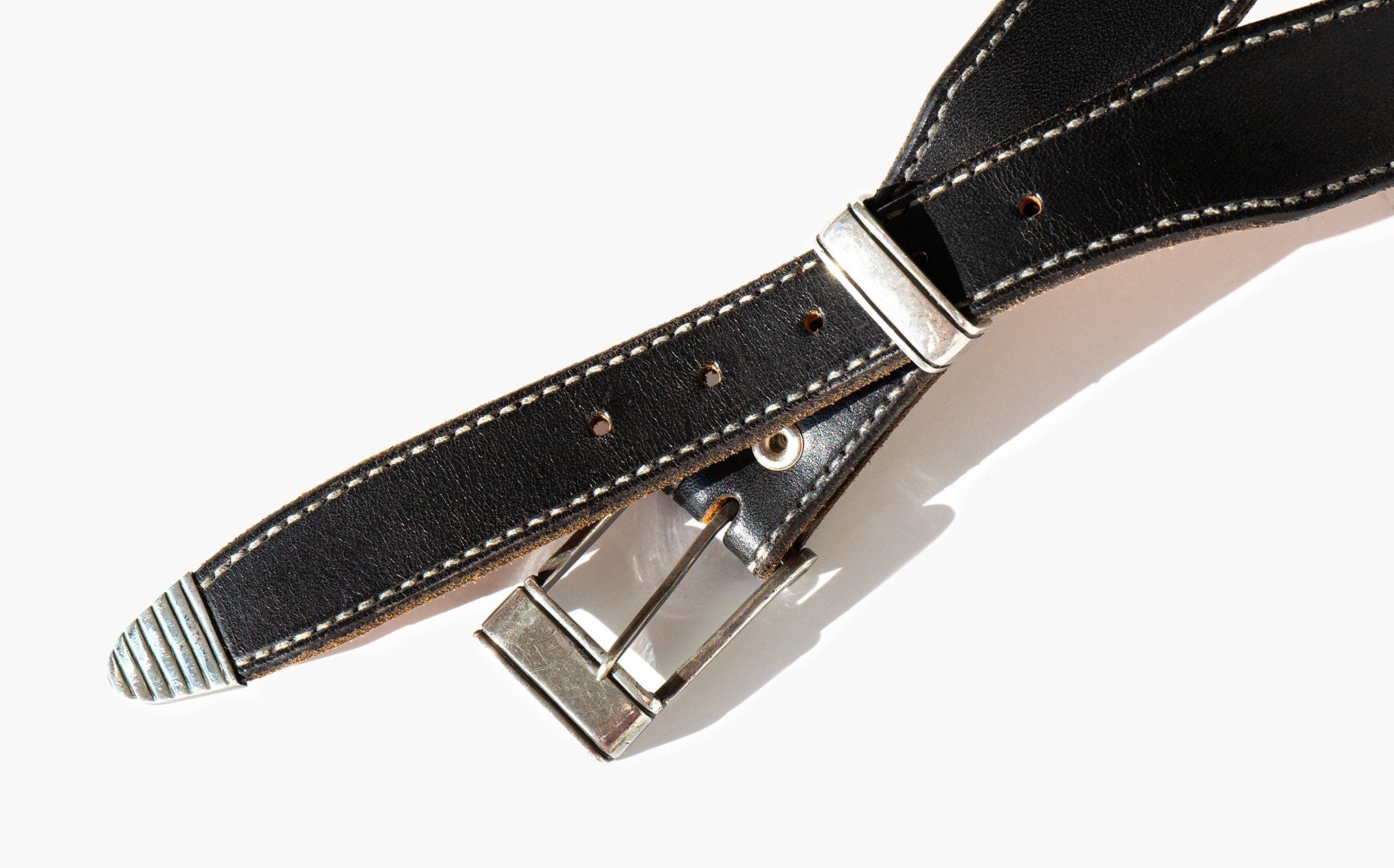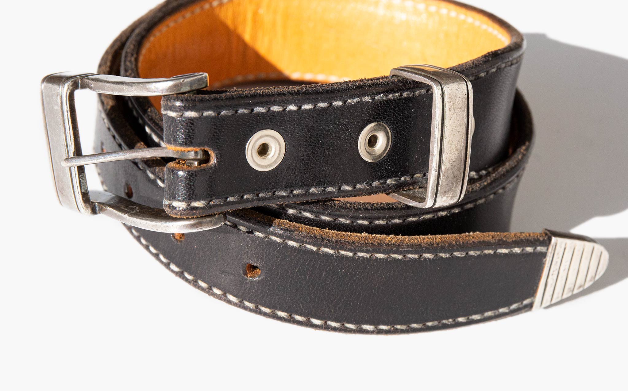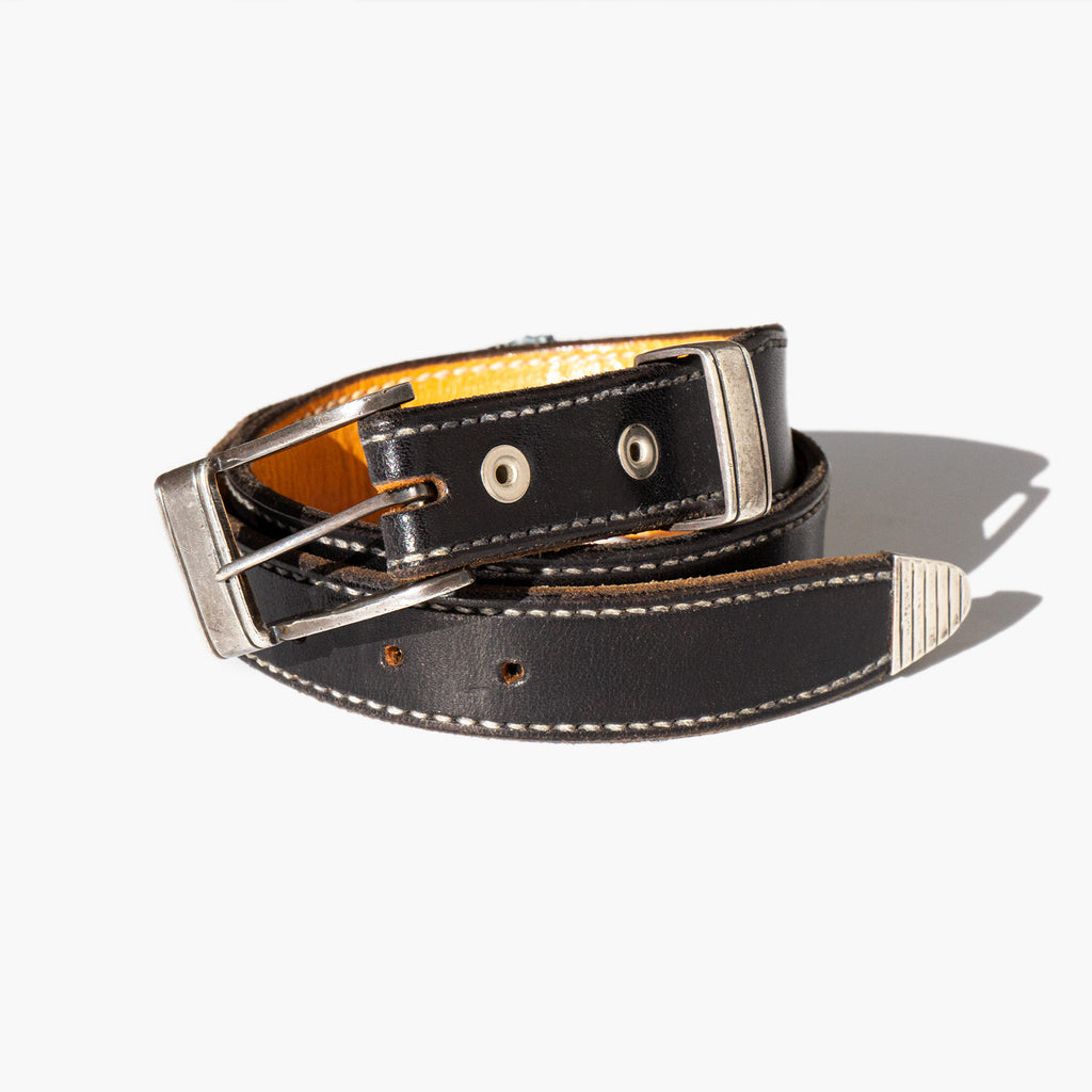 Vintage simple black leather belt with a contrast stitch and an heirloom quality solid Mexican sterling silver buckle and tip.