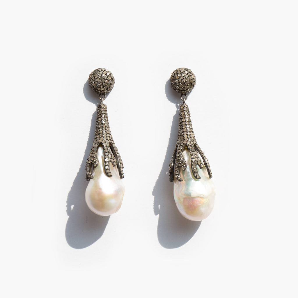 Exquisite natural baroque pearl earrings set in sterling silver crusted with rose cut diamonds.