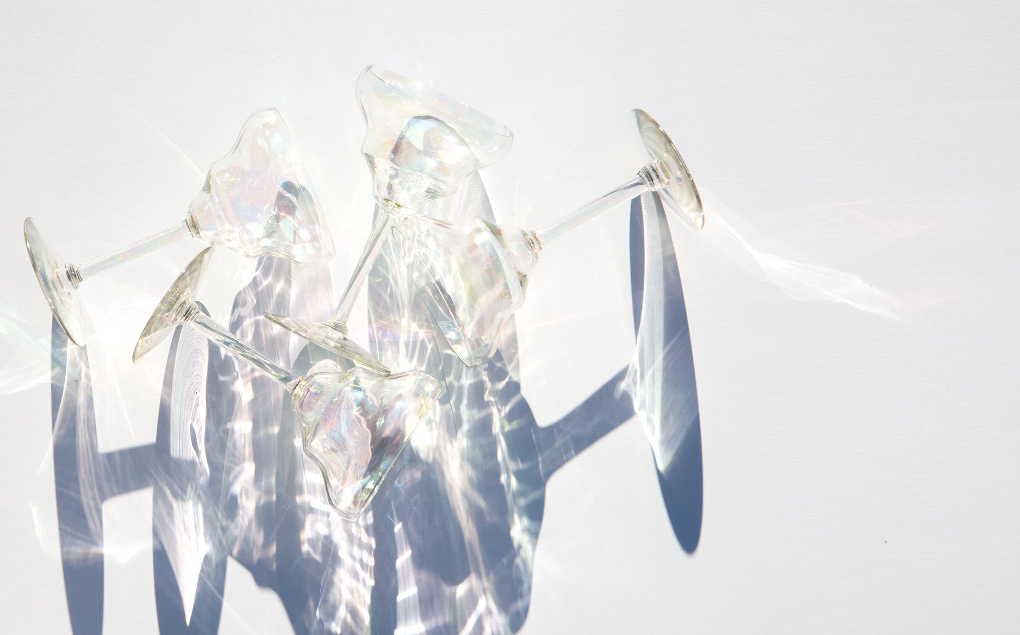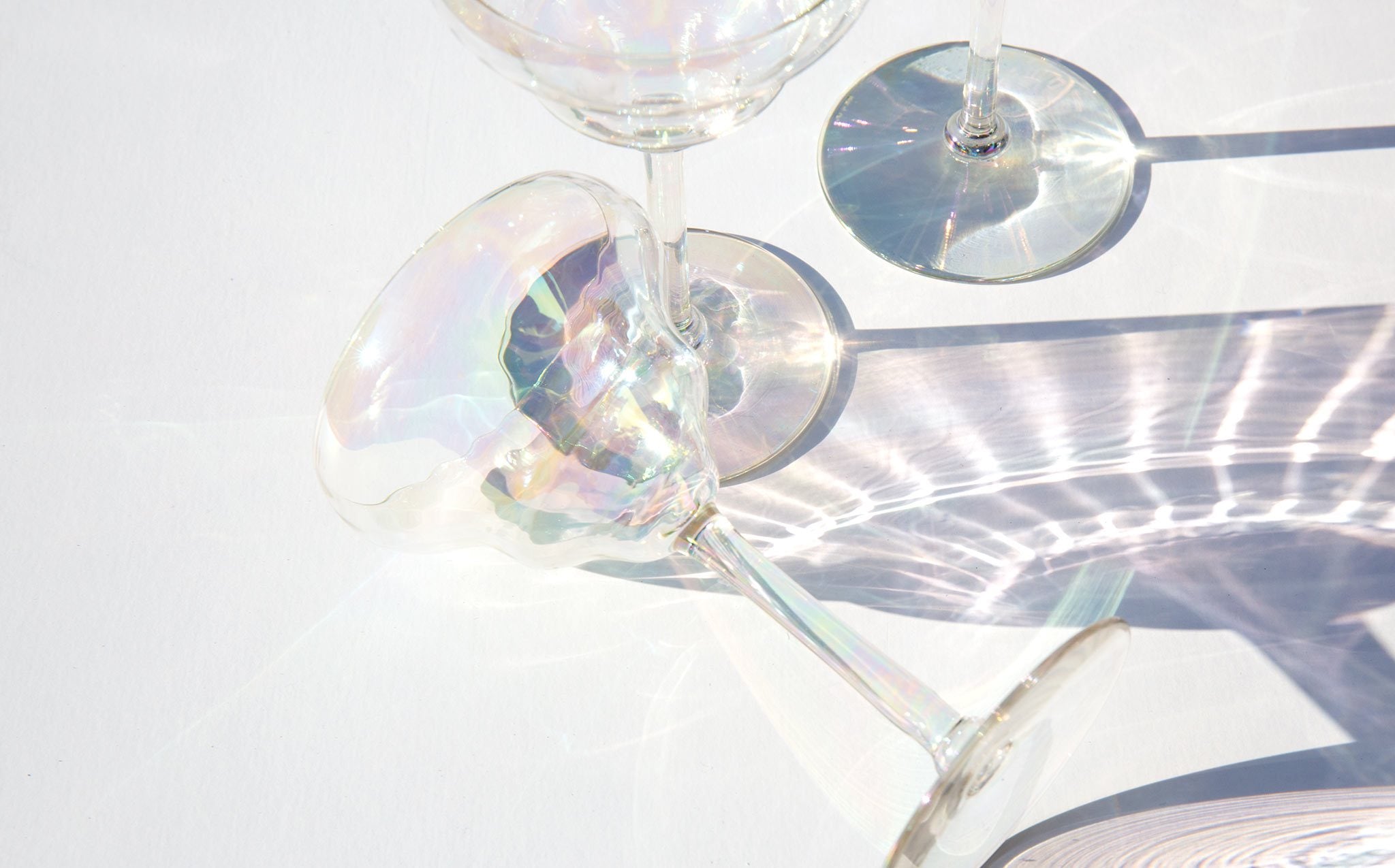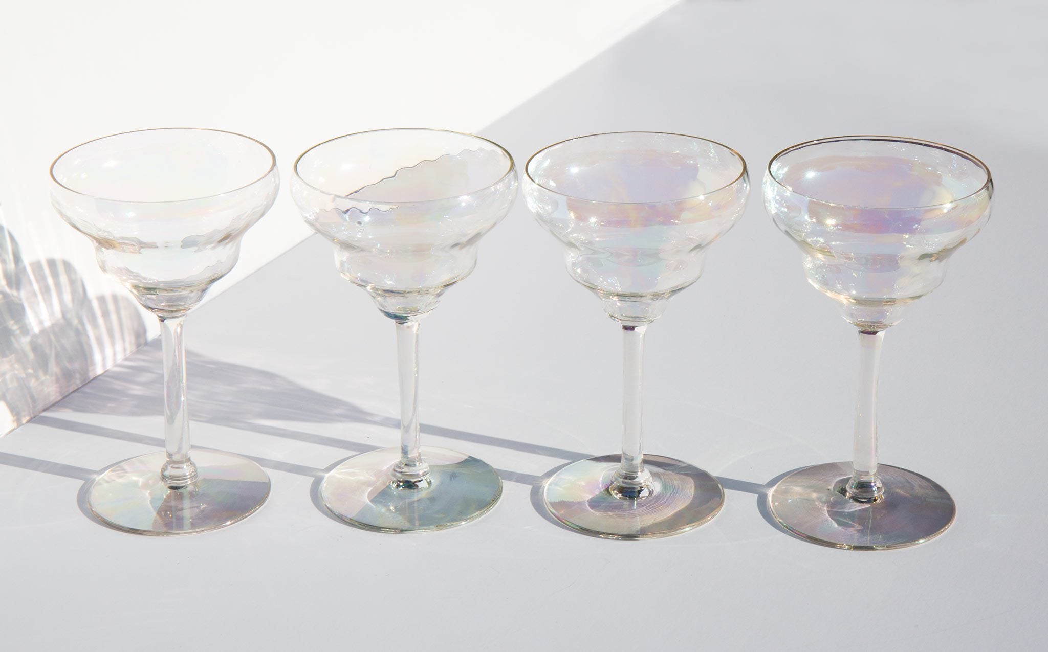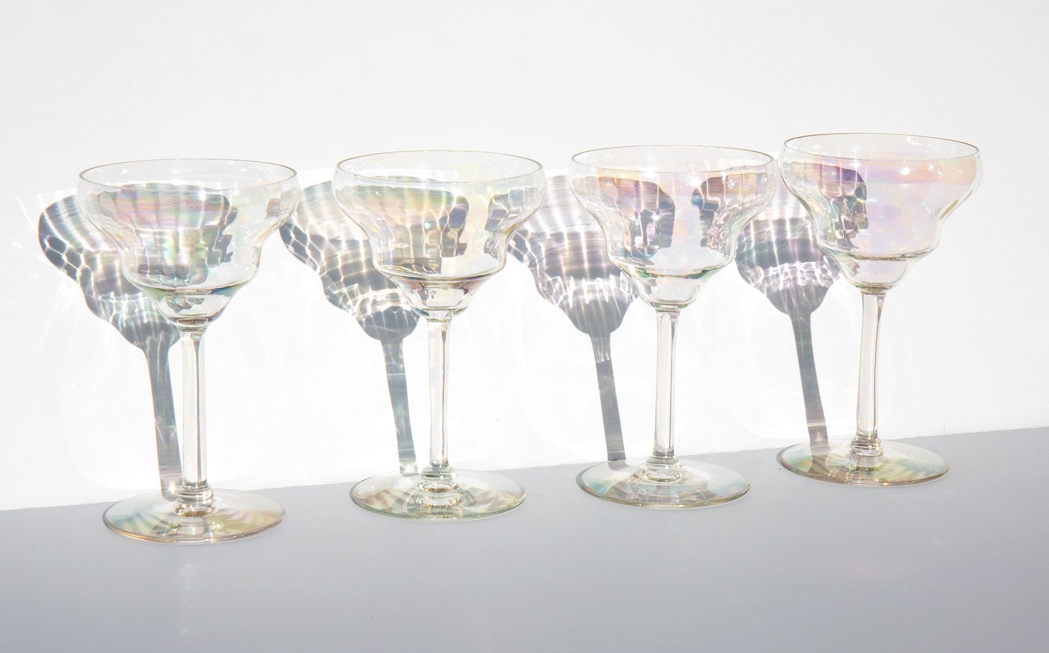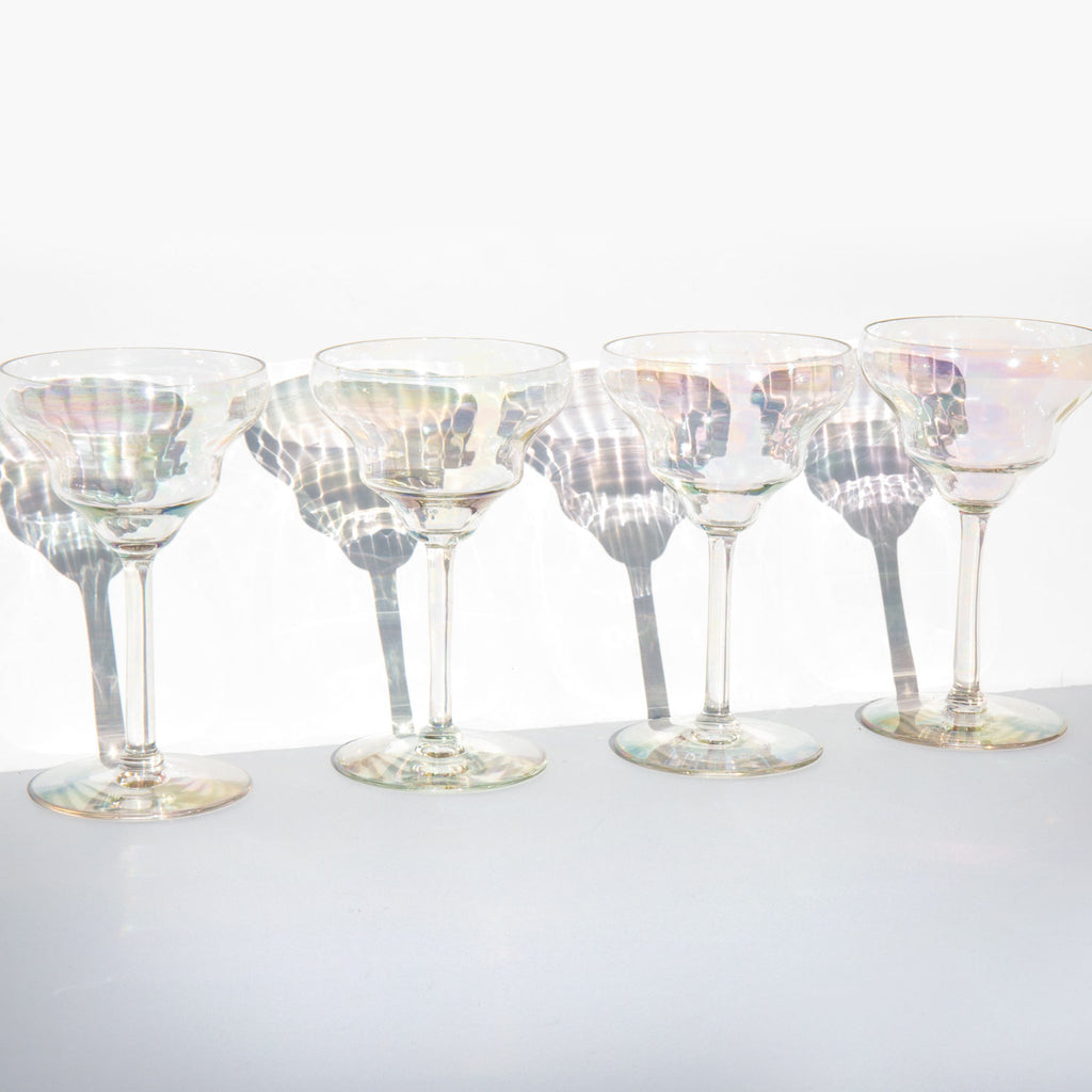 Cocktail coupes made of mother of pearl hued iridescent glass. Set of 4 with 4 sets available.